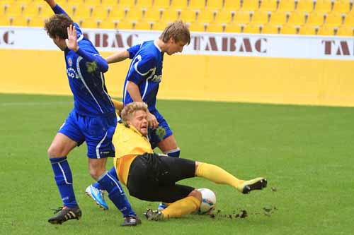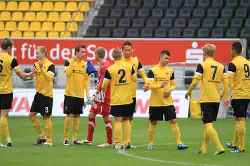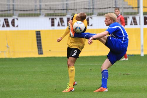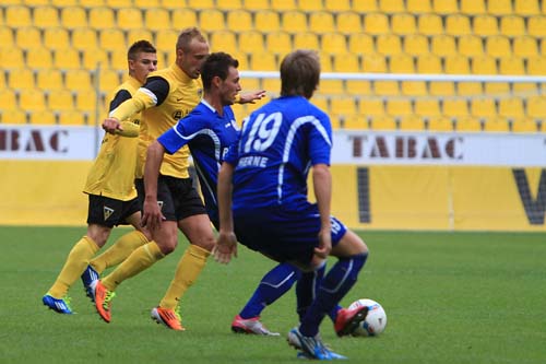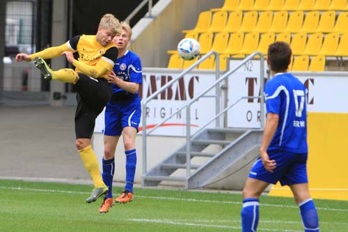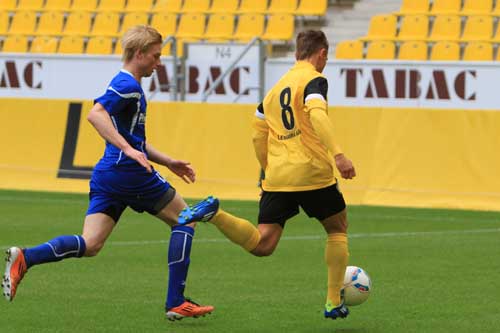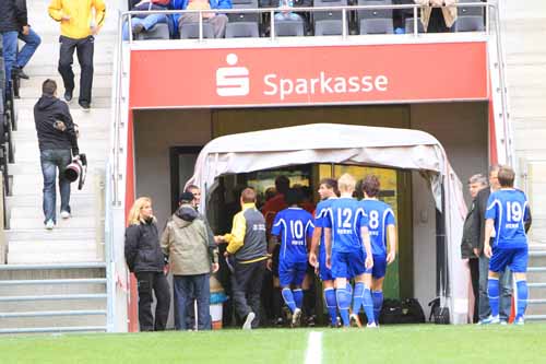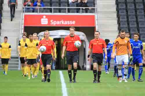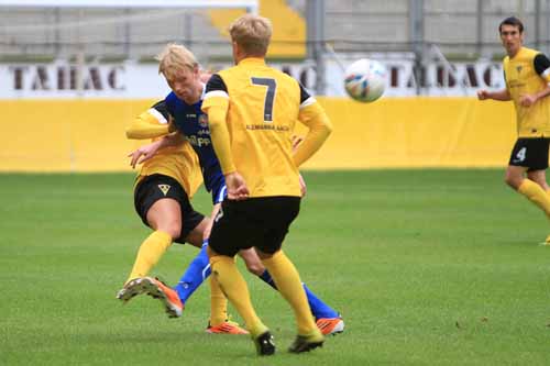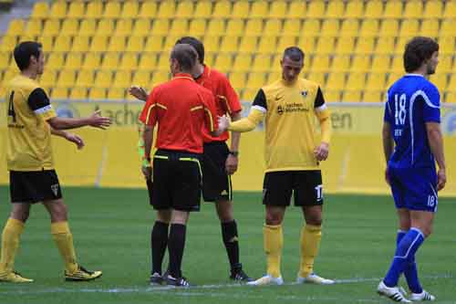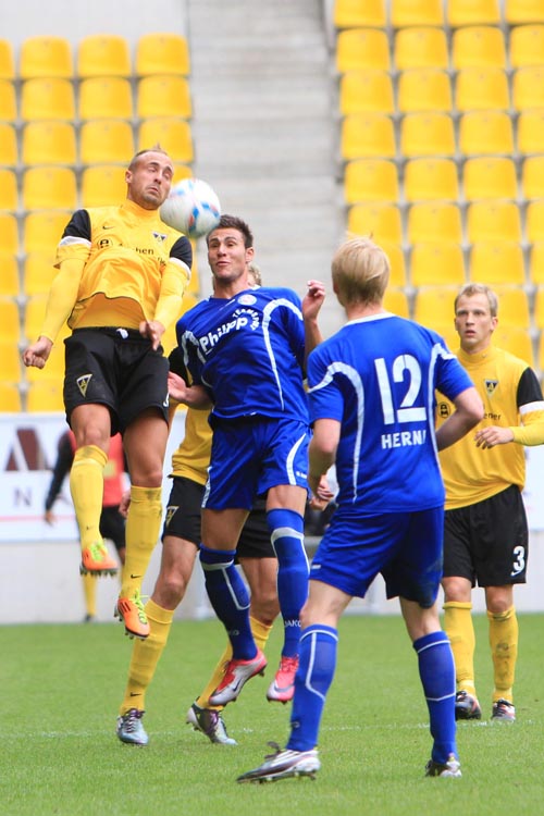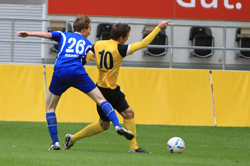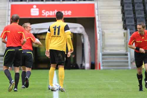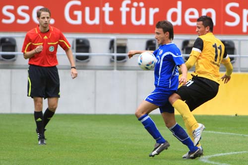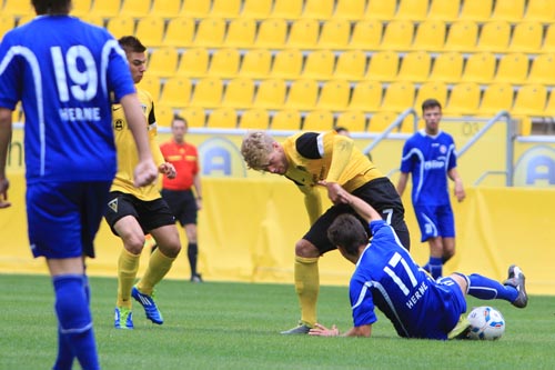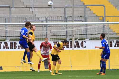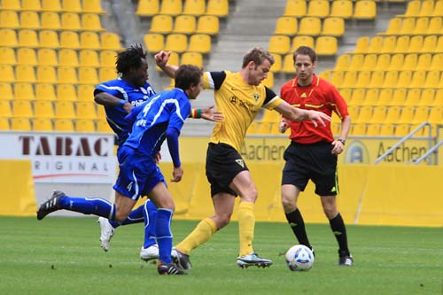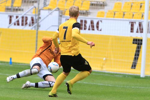 Bei den Tivoli-Kickern wurden mit Tim Krumpen, Kevin Maek, Mirko Casper und Kim Falkenberg vier Profis eingesetzt, die sich nach ihren Verletzungen wieder für höhere Aufgaben empfehlen möchten. Gegen einen erschreckend harmlosen Gegner schafften es die Schwarz-Gelben vor dem Seitenwechsel lediglich einmal für Gefahr zu sorgen. Pozder setzte Wanneck am linken Flügel in Szene und dessen Hereingabe bugsierte Engelbrecht bewacht von zwei Gegenspielern knapp links am Tor vorbei (16).