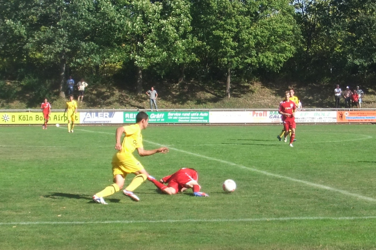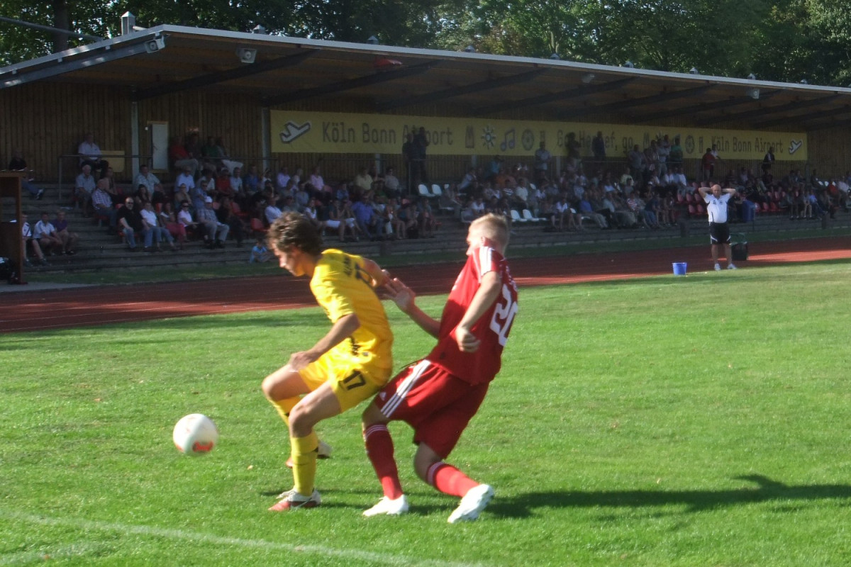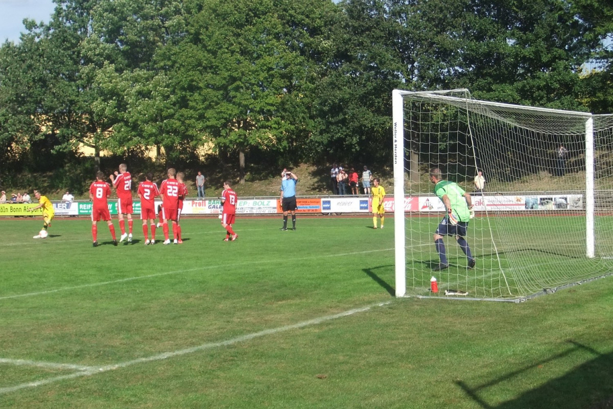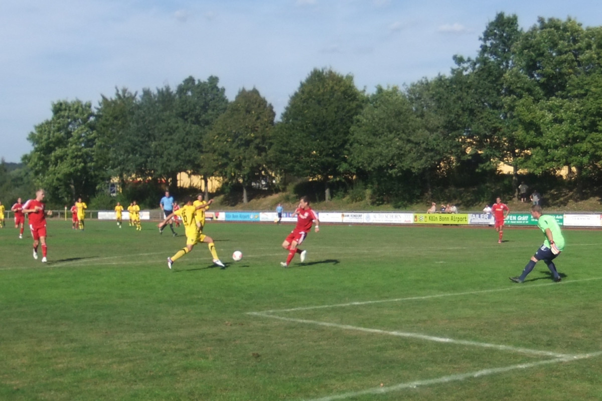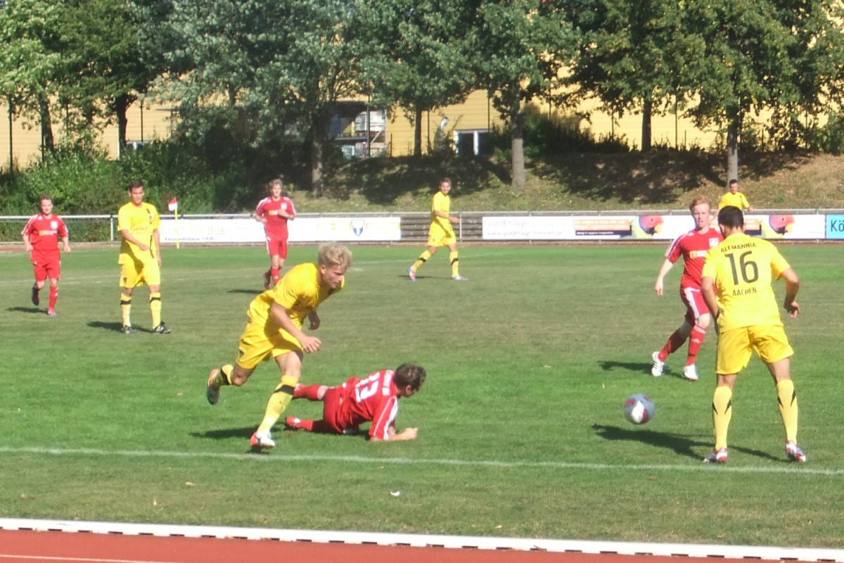 Bei der Alemannia erhielten mit Michael Melka, Dario Schumacher, Sascha Marquet und Robert Leipertz vier Spieler aus dem Profikader Gelegenheit, Spielpraxis zu sammeln. Die bessere Mannschaft waren jedoch im ersten Durchgang die Gastgeber. Gleich nach zwei Minuten bot sich Rene Dabers nach einem langen Einwurf aus spitzem Winkel die erste Einschussgelegenheit, aber Michael Melka verkürzte geschickt den Winkel. Bei der anschließenden Ecke war er jedoch machtlos. Tobias Günther schlug den Ball zum kurzen Pfosten, die Aachener Abwehr konnte nicht klären, und Florian Schöller schoss aus kurzer Distanz zum 1:0 ein. Zwei Minuten später stand Rene Dabers nach einem schnell ausgeführten Freistoß alleine vor Melka, hob den Ball jedoch an die Latte des leeren Tores. Wieder nur eine Minute später kam Dabers über die rechte Seite alleine auf das Tor zugelaufen, Melka parierte seinen halbhohen Schuss ins lange Eck. Es dauerte zehn Minuten, bis die Hintermannschaft der Alemannia das Geschehen halbwegs in den Griff bekam. Dabers mit einem Kopfball nach Flanke von Lucas Inger (21.) und nach einem weiteren schnell ausgeführten Freistoß (34.) hatte trotzdem weitere Chancen für die Gastgeber. Fünf Minuten vor der Pause stand Dabers schließlich nach einem Diagonalpass zentral frei vor dem Tor, konnte Michael Melka mit einem schwachen Schuss ins linke Eck aber nicht überwinden.