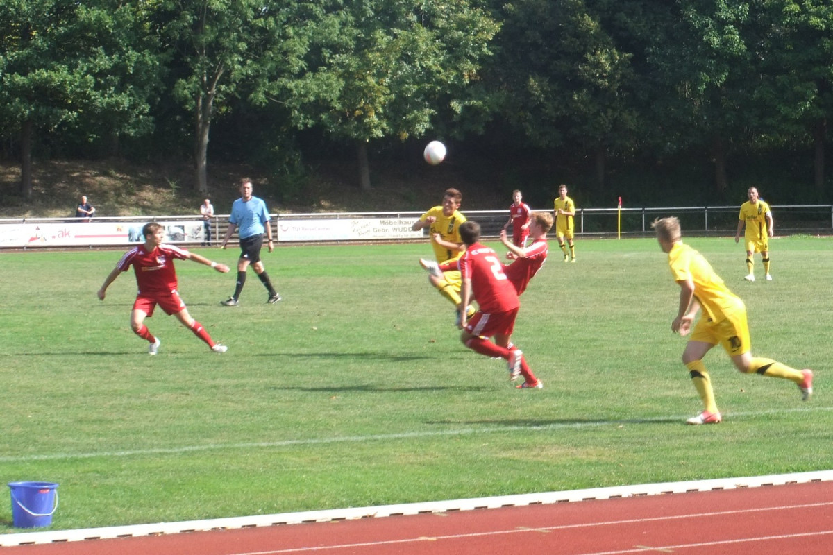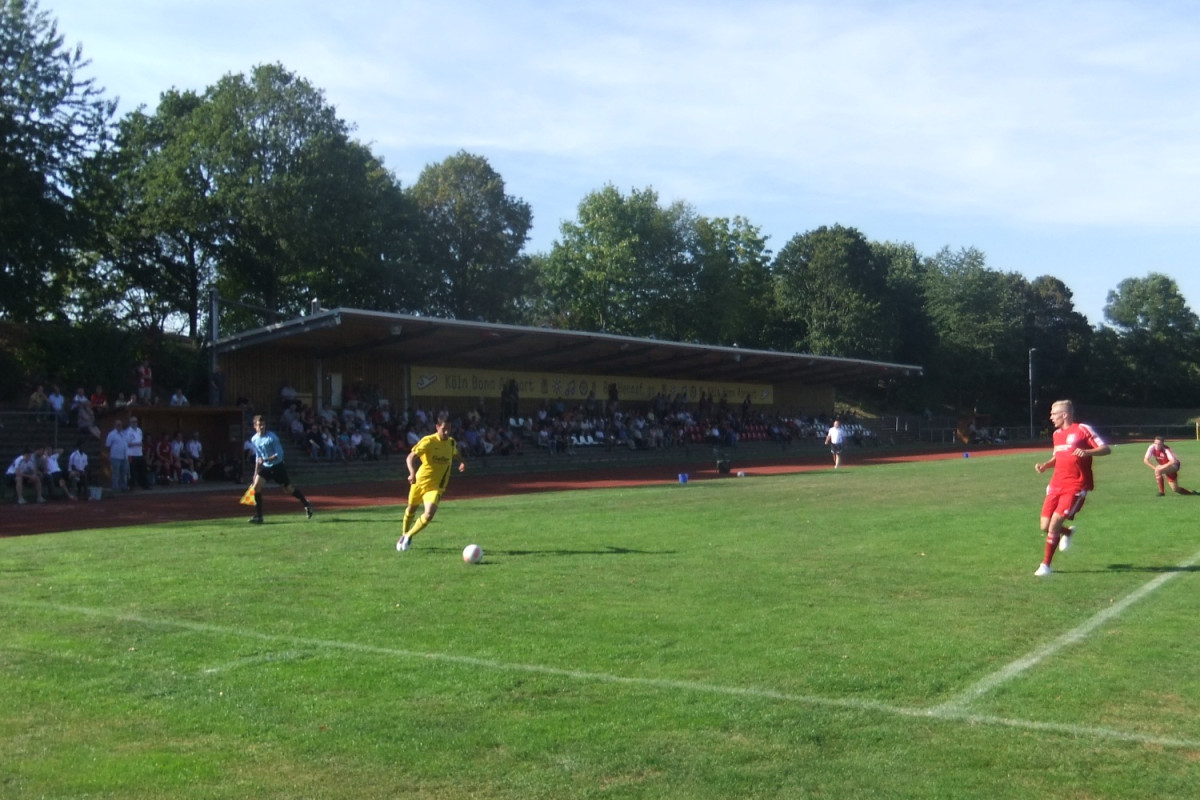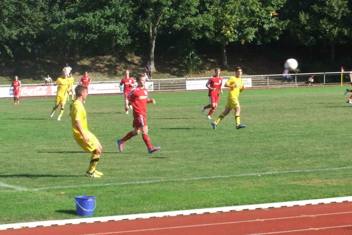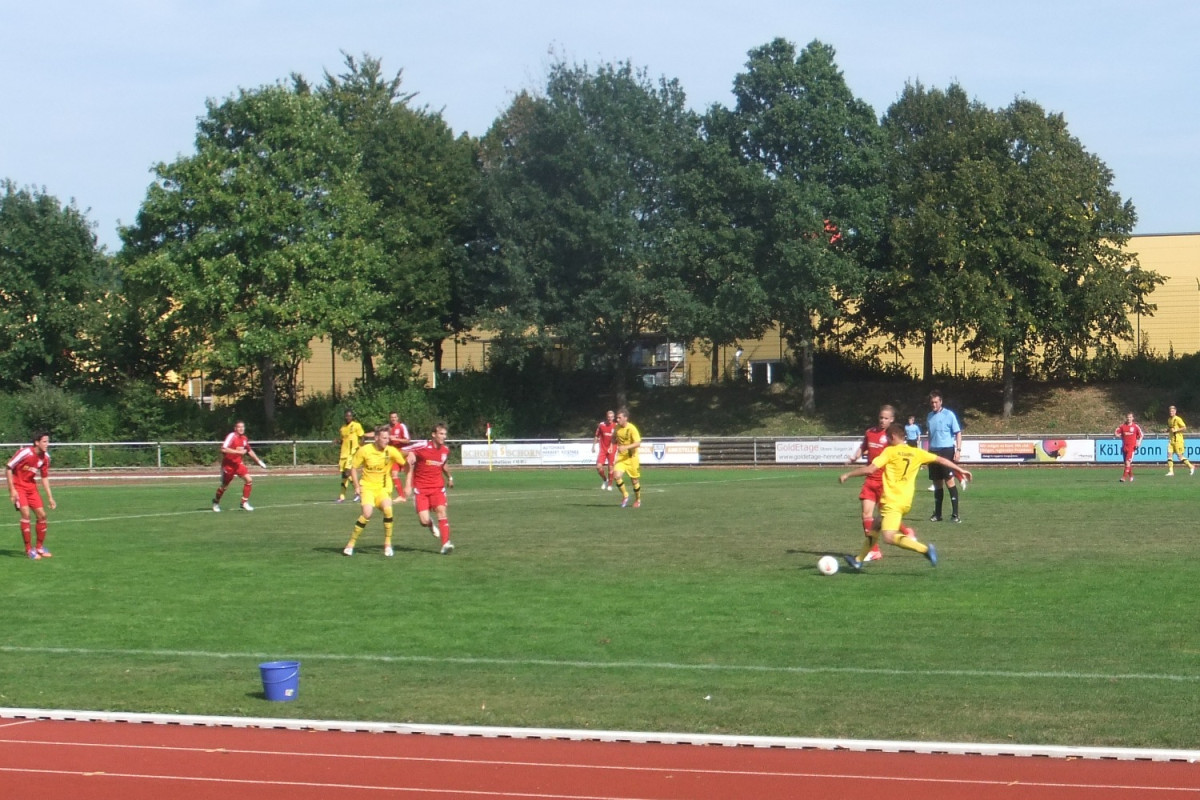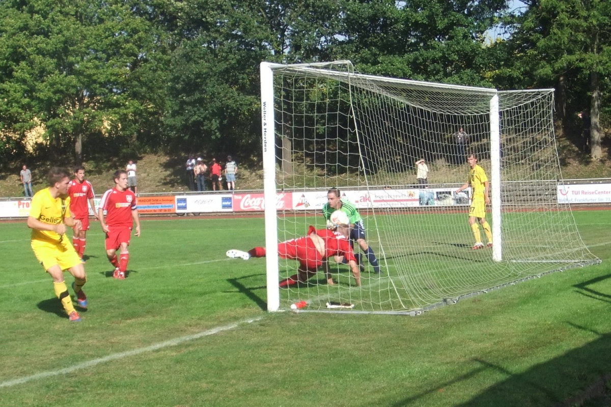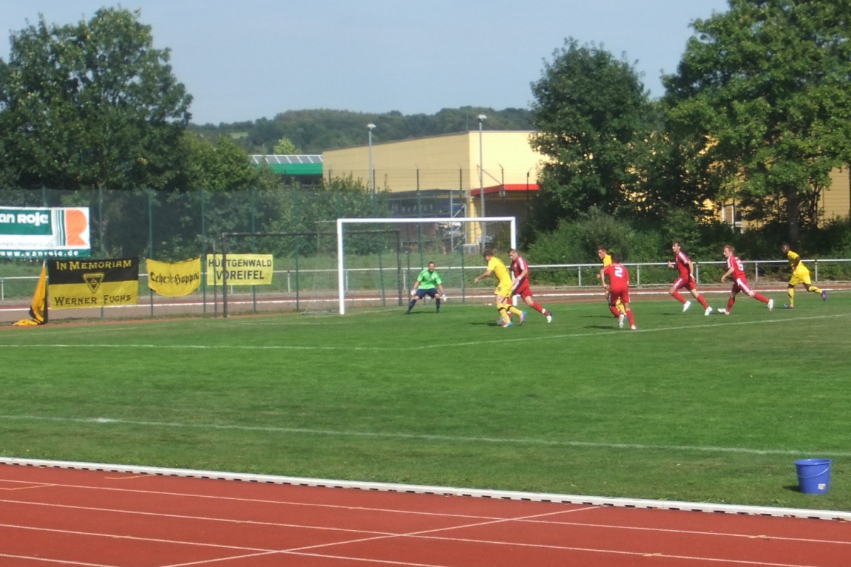 Bei der Alemannia erhielten mit Michael Melka, Dario Schumacher, Sascha Marquet und Robert Leipertz vier Spieler aus dem Profikader Gelegenheit, Spielpraxis zu sammeln. Die bessere Mannschaft waren jedoch im ersten Durchgang die Gastgeber. Gleich nach zwei Minuten bot sich Rene Dabers nach einem langen Einwurf aus spitzem Winkel die erste Einschussgelegenheit, aber Michael Melka verkürzte geschickt den Winkel. Bei der anschließenden Ecke war er jedoch machtlos. Tobias Günther schlug den Ball zum kurzen Pfosten, die Aachener Abwehr konnte nicht klären, und Florian Schöller schoss aus kurzer Distanz zum 1:0 ein. Zwei Minuten später stand Rene Dabers nach einem schnell ausgeführten Freistoß alleine vor Melka, hob den Ball jedoch an die Latte des leeren Tores. Wieder nur eine Minute später kam Dabers über die rechte Seite alleine auf das Tor zugelaufen, Melka parierte seinen halbhohen Schuss ins lange Eck. Es dauerte zehn Minuten, bis die Hintermannschaft der Alemannia das Geschehen halbwegs in den Griff bekam. Dabers mit einem Kopfball nach Flanke von Lucas Inger (21.) und nach einem weiteren schnell ausgeführten Freistoß (34.) hatte trotzdem weitere Chancen für die Gastgeber. Fünf Minuten vor der Pause stand Dabers schließlich nach einem Diagonalpass zentral frei vor dem Tor, konnte Michael Melka mit einem schwachen Schuss ins linke Eck aber nicht überwinden.