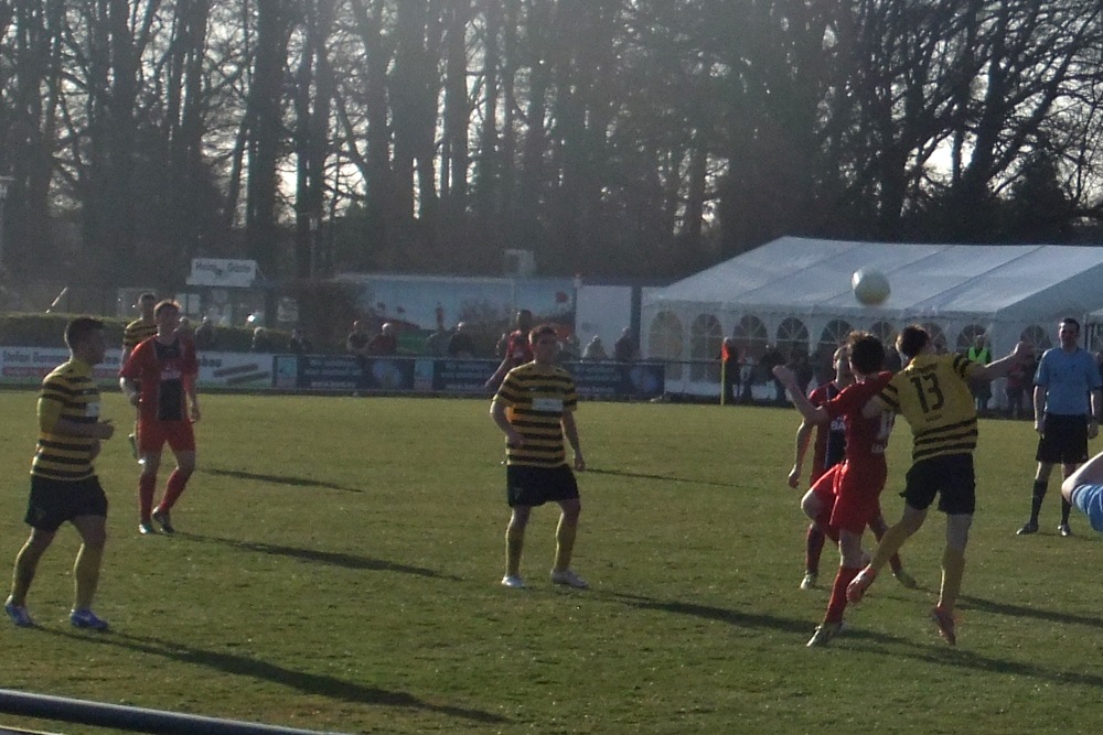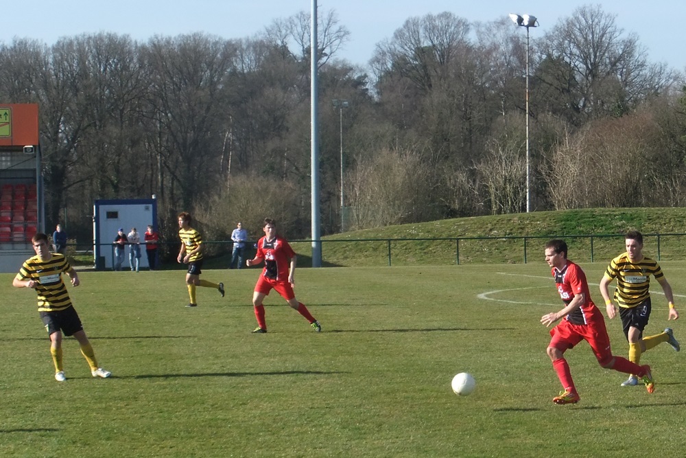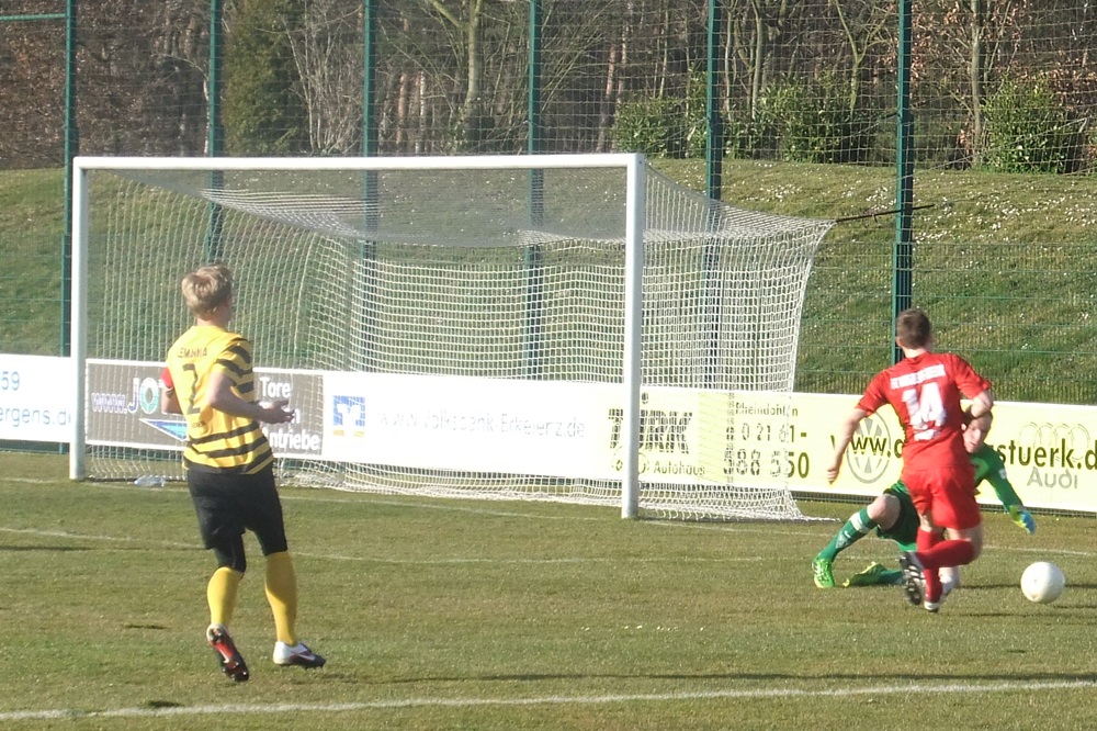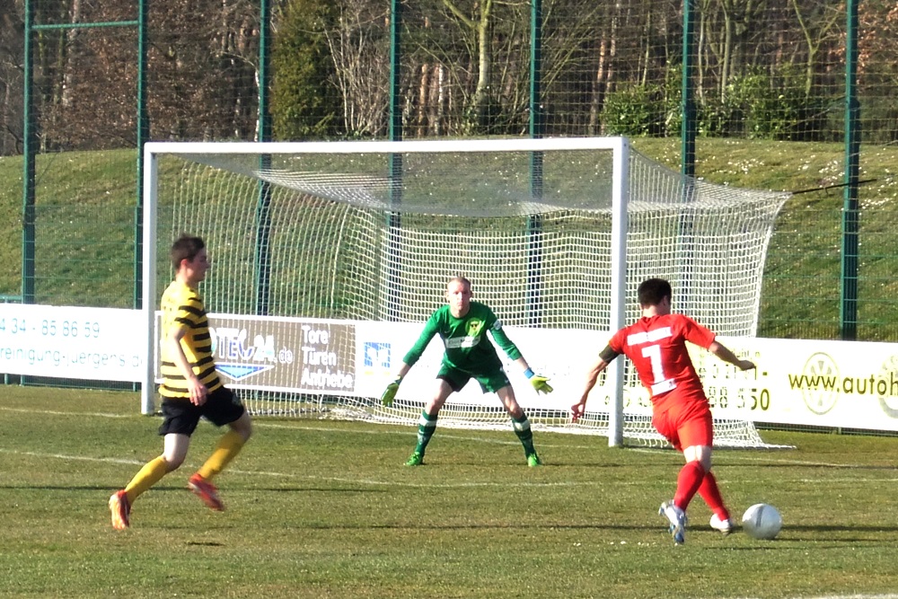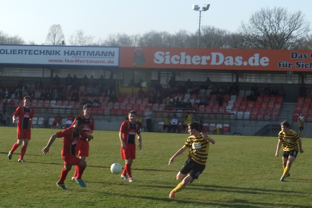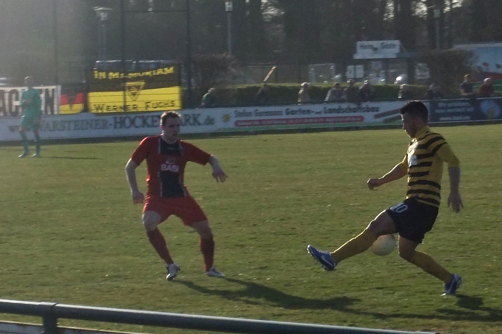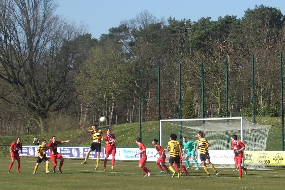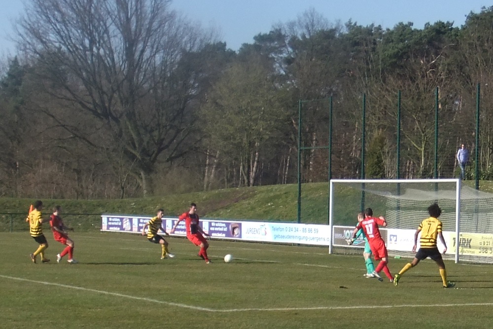 Die Schwarz-Gelben kompensierten den frühen Zwei-Tore-Rückstand in der Folgzeit ganz gut, zeigten sich vor gegnerischen Tor allerdings nicht so effektiv wie die Gastgeber. Nach einem weiten Einwurf von Nico Dautzenberg prallte ein Kopfball von Vincenzo Candela auf die Latte. Zwei Minuten vor dem Seitenwechsel vergab Nazim Sangare nach Zuspiel von Candela freistehend die Chance zum Anschlusstreffer. Besser machten es kurz nach Wiederbeginn erneut die Gastgeber. Simon Küppers tauchte frei vor Wilmes auf und der Ligaprimus führte dank optimaler Chancenverwertung mit 3:0 (49.). Mit Wut im Bauch setzte Tobias Arens drei Minuten später zu einem fulminanten Schuss aus 25 Metern an. Diesmal stand der rechte Innenpfosten den Aachenern zur Seite und es hieß nur noch 3:1 (52.). Ein sehenswerter Treffer, der den verdienten Erfolg des Spitzenreiters allerdings am Ende nicht mehr in Gefahr bringen sollte.