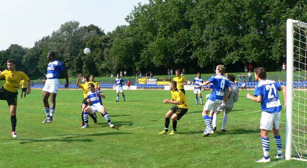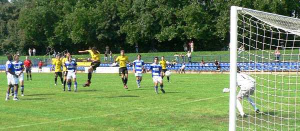 Vor 130 Zuschauern an der Westender Straße, darunter auch Ex-Coach Stefan Emmerling, blieb die Aachener Startformation trotz zwei Niederlagen zunächst personell und taktisch unverändert. Die erste Hälfte verlief ausgeglichen, auch wenn die Gastgeber die besseren Chancen auf ihrer Seite hatten. Nach rund einer halben Stunde tauchte Stegmann frei vor David Hohs auf, doch Aachens Keeper verhinderte reaktionsschnell einen Rückstand. Keine 60 Sekunden später konnte Tosunoglu der Aachener Abwehr entwischen, zielte aber knapp links vorbei. Nur einmal kam unsere Elf gefährlich vor das MSV-Gehäuse: Özgen verpasste eine Freistoßhereingabe von Sabacinski aber um Haaresbreite.