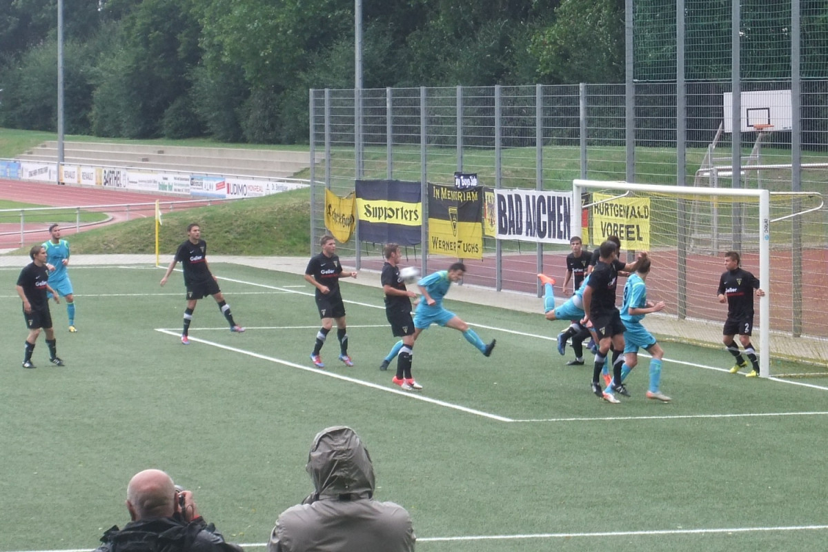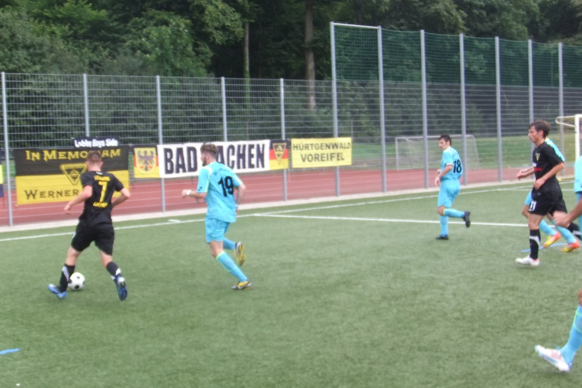 Inklusive Robert Leipertz und Dario Schumacher, die Spielpraxis in der U23 sammelten, musste Trainer Peter Schubert sieben Neuzugänge in der Aachener Startformation integrieren. Die Gastgeber erklärten den Rasenplatz des Schlossparkstadions kurzerhand für gesperrt und verlegten die Partie auf den angrenzenden engen Kunstrasenplatz. Dennoch übernahmen die Tivoli-Kicker zunächst das Kommando und kamen durch Schumacher (10.) und Raphael De Sousa (12.) zu ersten Möglichkeiten. Nach 13 Minuten hatte Kapitän Dennis Lang dann 18 Meter vor dem Brühler Gehäuse zu viel Platz und traf mit einem Flachschuss ins linke Eck zum 0:1. Erst nach einer guten halben Stunde ließen die Gastgeber durch Notz einen ersten Warnschuss ab, der jedoch einen Meter über das Gehäuse ging. Präziser machte es Notz kurz vor dem Seitenwechsel, allerdings stand der Brühler bei seinem Flugkopfball knapp im Abseits, so dass der Treffer zu recht nicht anerkannt wurde (43.).