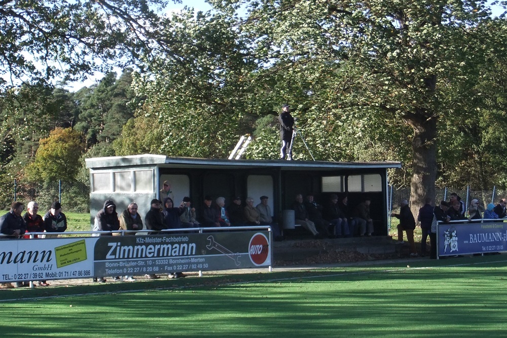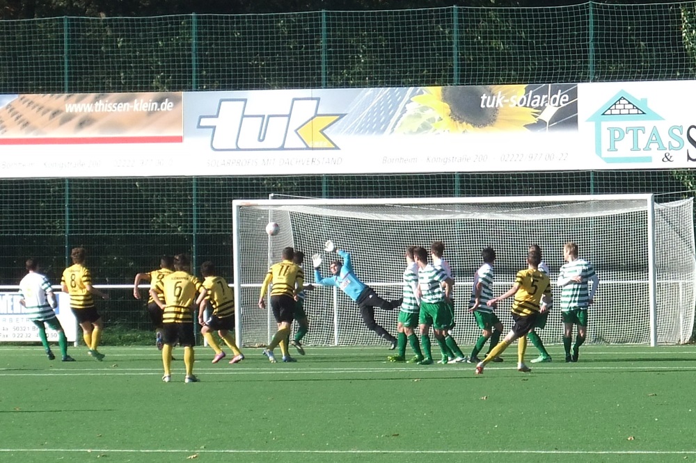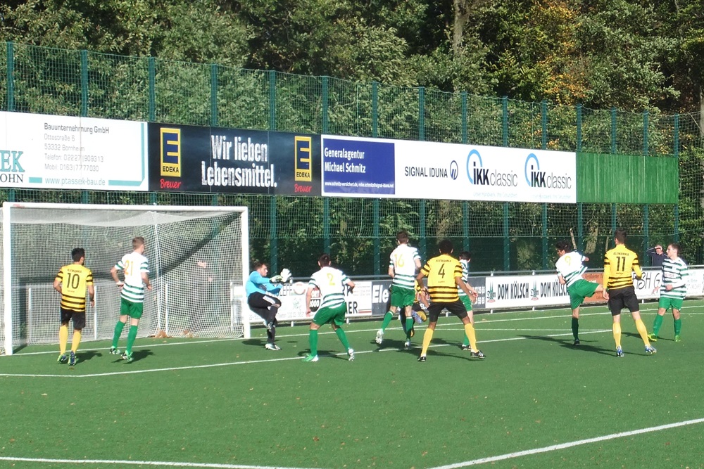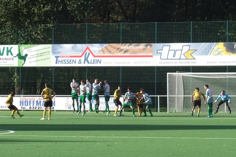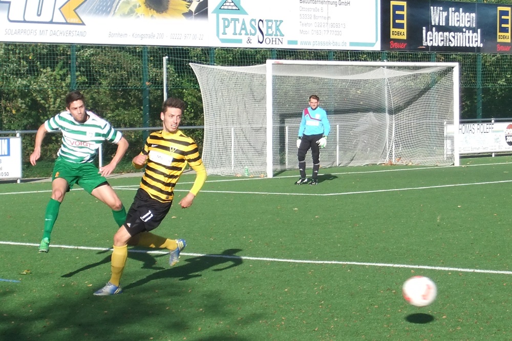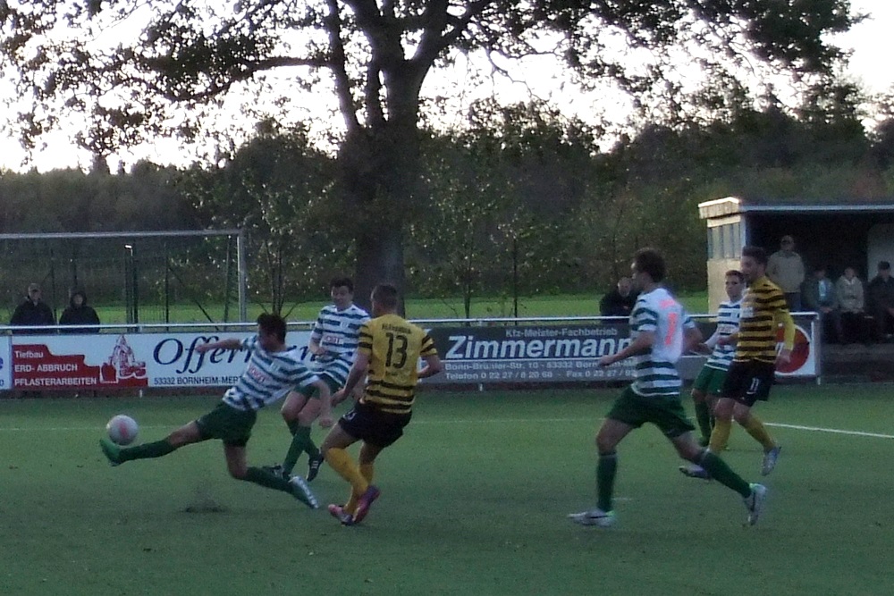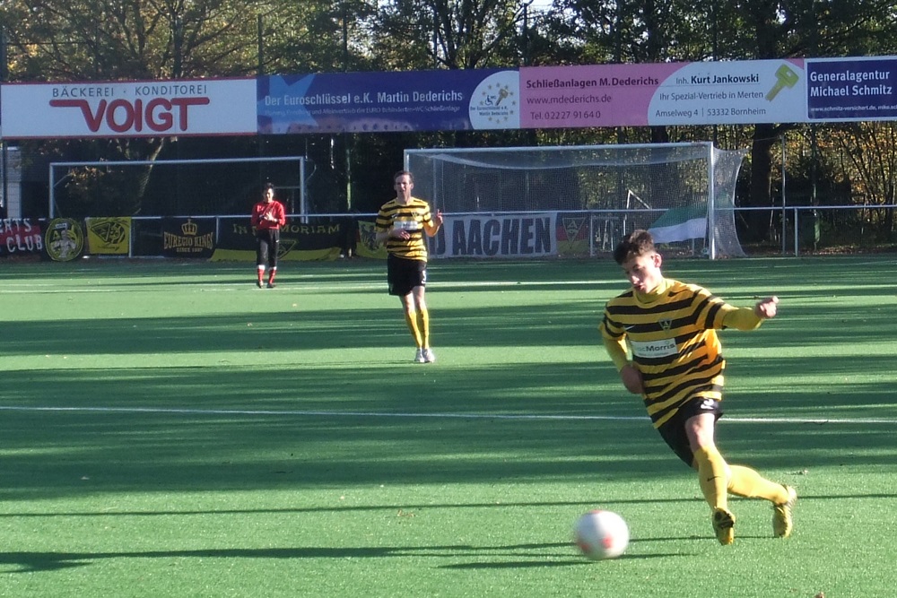 Vor 130 Zuschauern in der "MerKur-Arena" im Bornheimer Ortsteil Merten bestimmten die Schwarz-Gelben von Beginn an das Geschehen. Zwei Freistöße von Tobias Standop sorgten schon früh für Gefahr vor dem Tor der Gastgeber (5./10.). Nach Doppelpass mit Sturmpartner Dautzenberg prüfte Mergim Statovci Torwart Luft mit einem Schuss ins kurze Eck (28.), wenig später hatte der Keeper Mühe mit einem Freistoß von Raphael de Sousa ins linke Toreck (32.). Wieder nur einige Minuten später war es Yannis Büge, dessen Schuss vom linken Strafraumeck über das Tor abgefälscht wurde. Schließlich wurde Mergim Statovci nach Pass von Kani Taher zentral vor dem Tor sträflich alleine gelassen und bedankte sich mit einem Flachschuss ins rechte Eck zum 0:1 (37.).