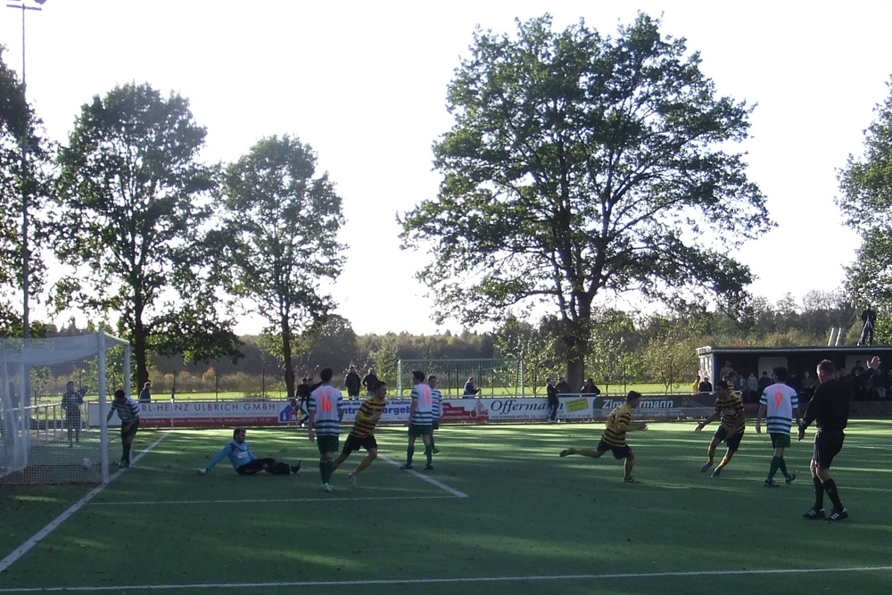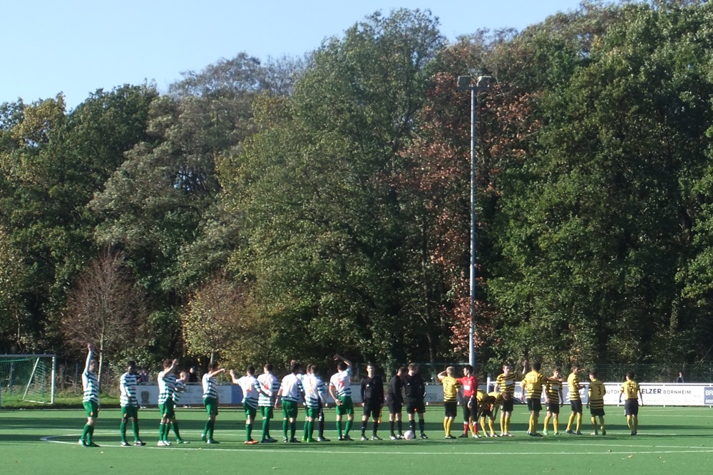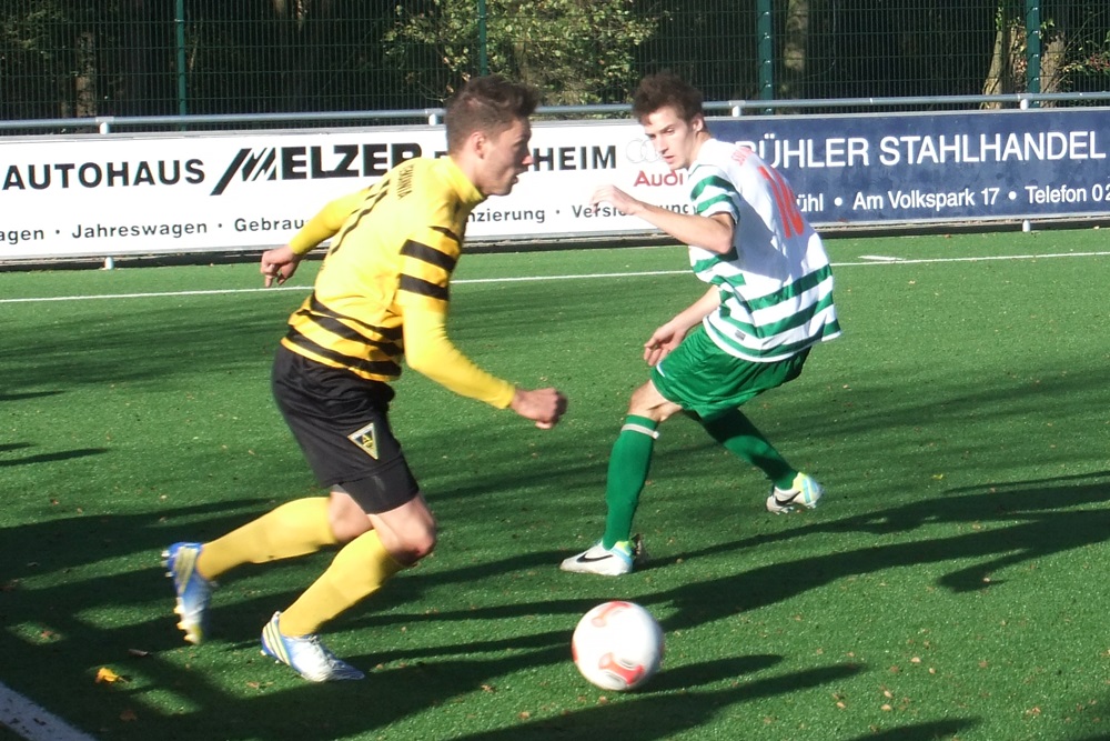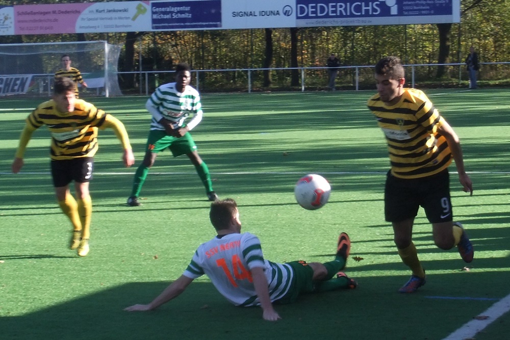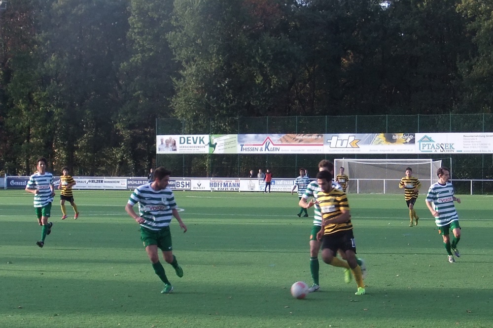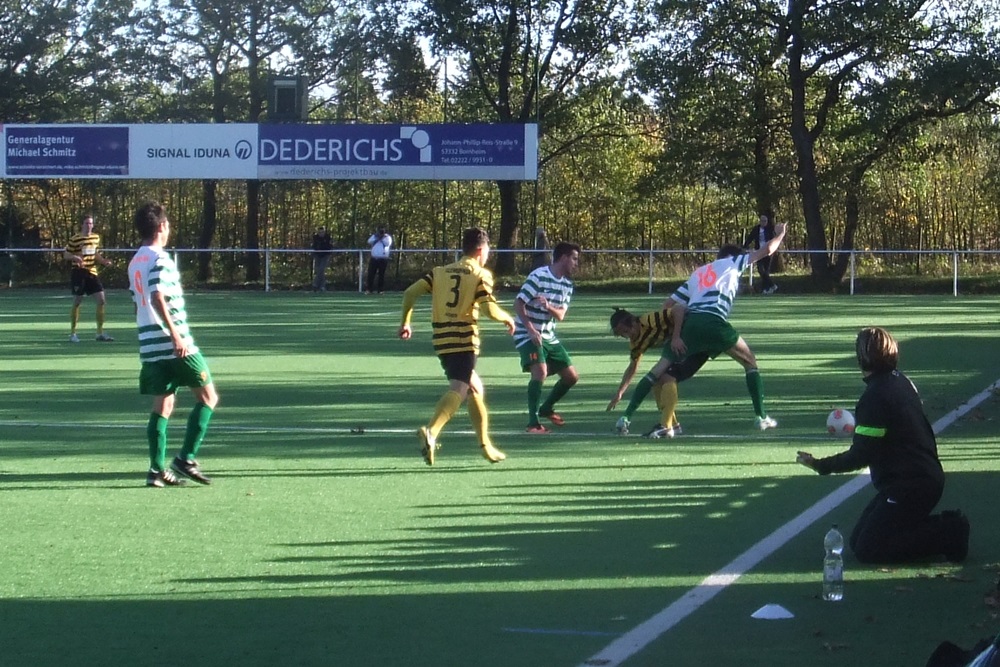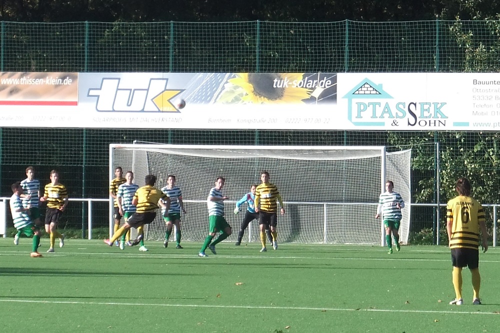 Vor 130 Zuschauern in der "MerKur-Arena" im Bornheimer Ortsteil Merten bestimmten die Schwarz-Gelben von Beginn an das Geschehen. Zwei Freistöße von Tobias Standop sorgten schon früh für Gefahr vor dem Tor der Gastgeber (5./10.). Nach Doppelpass mit Sturmpartner Dautzenberg prüfte Mergim Statovci Torwart Luft mit einem Schuss ins kurze Eck (28.), wenig später hatte der Keeper Mühe mit einem Freistoß von Raphael de Sousa ins linke Toreck (32.). Wieder nur einige Minuten später war es Yannis Büge, dessen Schuss vom linken Strafraumeck über das Tor abgefälscht wurde. Schließlich wurde Mergim Statovci nach Pass von Kani Taher zentral vor dem Tor sträflich alleine gelassen und bedankte sich mit einem Flachschuss ins rechte Eck zum 0:1 (37.).