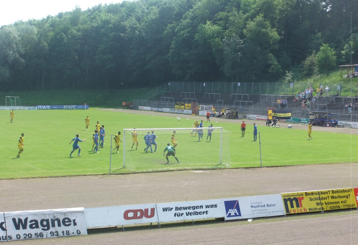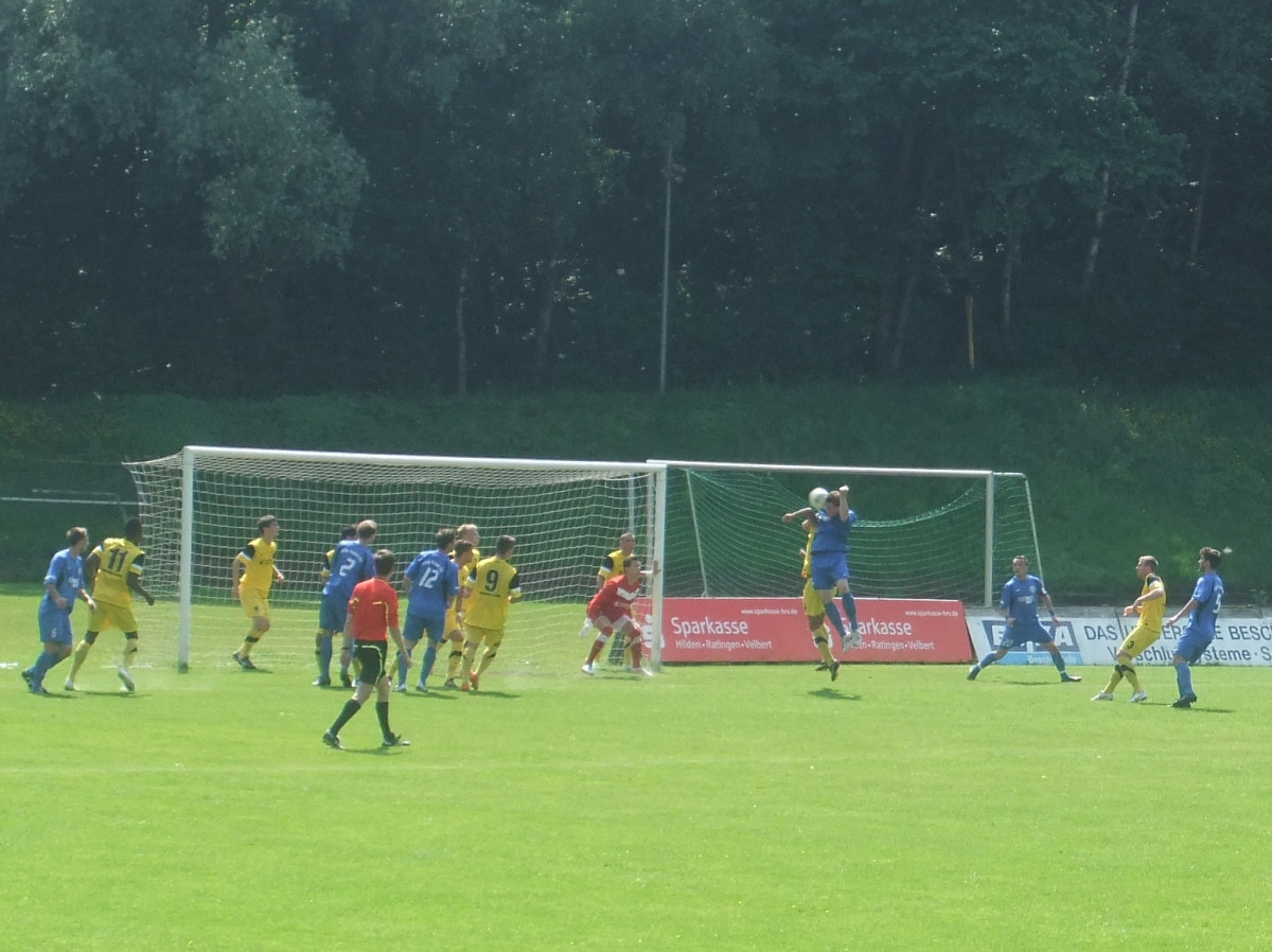 Bei sommerlichen Temperaturen kamen beide Teams im ersten Spielabschnitt zu einigen Gelegenheiten. Nach einem weiten Einwurf von Hermes drehte sich Lekesiz mit dem Rücken zum Tor um seinen Gegenspieler und spitzelte die Kugel knapp rechts am Velberter Tor vorbei (24.). Auf der Gegenseite scheiterte SSVg-Angreifer Oncuka aus spitzem Winkel an Rauhut. Kurz vor dem Seitenwechsel musste der Alemannia-Keeper zwei weitere Male sein Können unter Beweis stellen. Zunächst konnte er einen Schuss des frei gespielten Janas noch über die Latte lenken (39.). Danach war er bei einem von der rechten Seite zum Tor gezogen Freistoß von Mikolajczak hellwach und verhinderte erneut einen Rückstand (43.). Den anschließenden Aachener Konter schloss Lekesiz frei vor Velbert-Schlussmann Dietz zu schwach ab (44.).