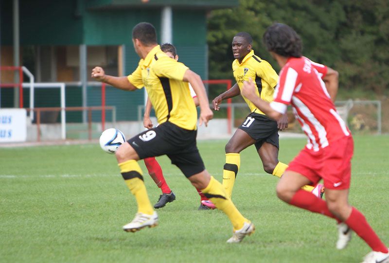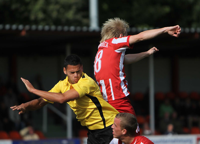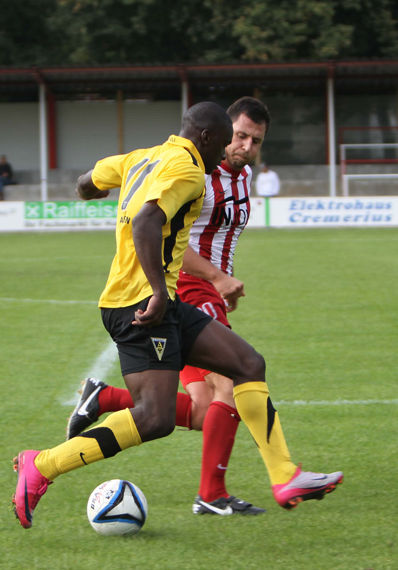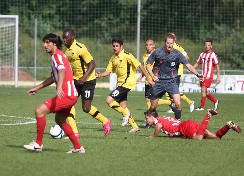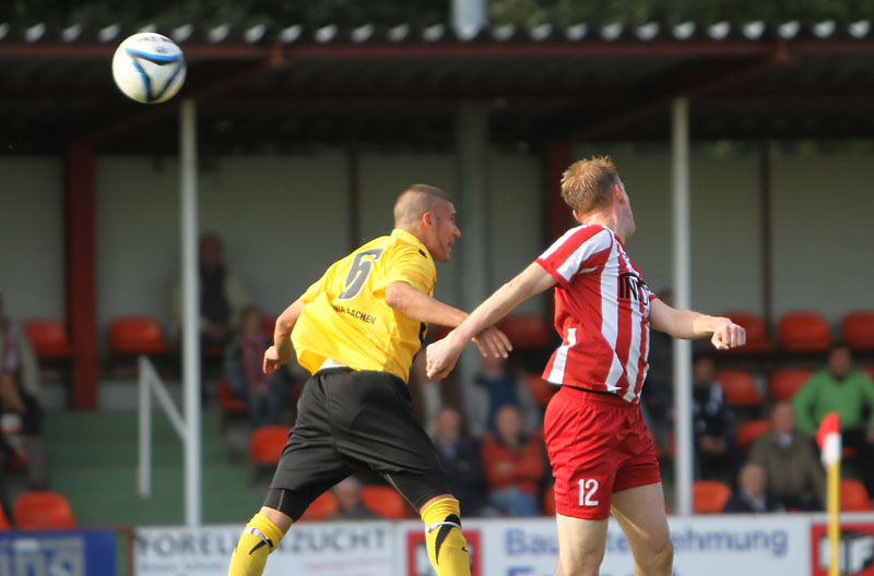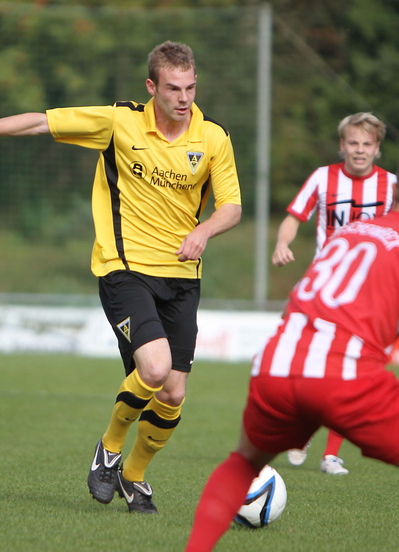Nach dem Wechsel übernahmen die Tivoli-Kicker das Kommando und verpassten durch einen ans Außennetz abgewehrten Schuss von Schnier nur knapp die Führung. Nach 70 Minuten kam dann die individuelle Klasse einer Profi-Leihgabe zum Tragen. Nach Anspiel von Sturmpartner Daniel Engelbrecht nahm Juvhel Tsoumou das Leder in Gerd Müller-Manier mit dem Rücken zum Tor an und schob aus der Drehung überlegt zum 0:1 ein. Schermbeck-Trainer Stroetzel packte dann mit der Einwechslung von Zwei-Meter-Mann Zepanski umgehend die Brechstange aus, was den Schwarz-Gelben viel Raum für Konter ermöglichte.