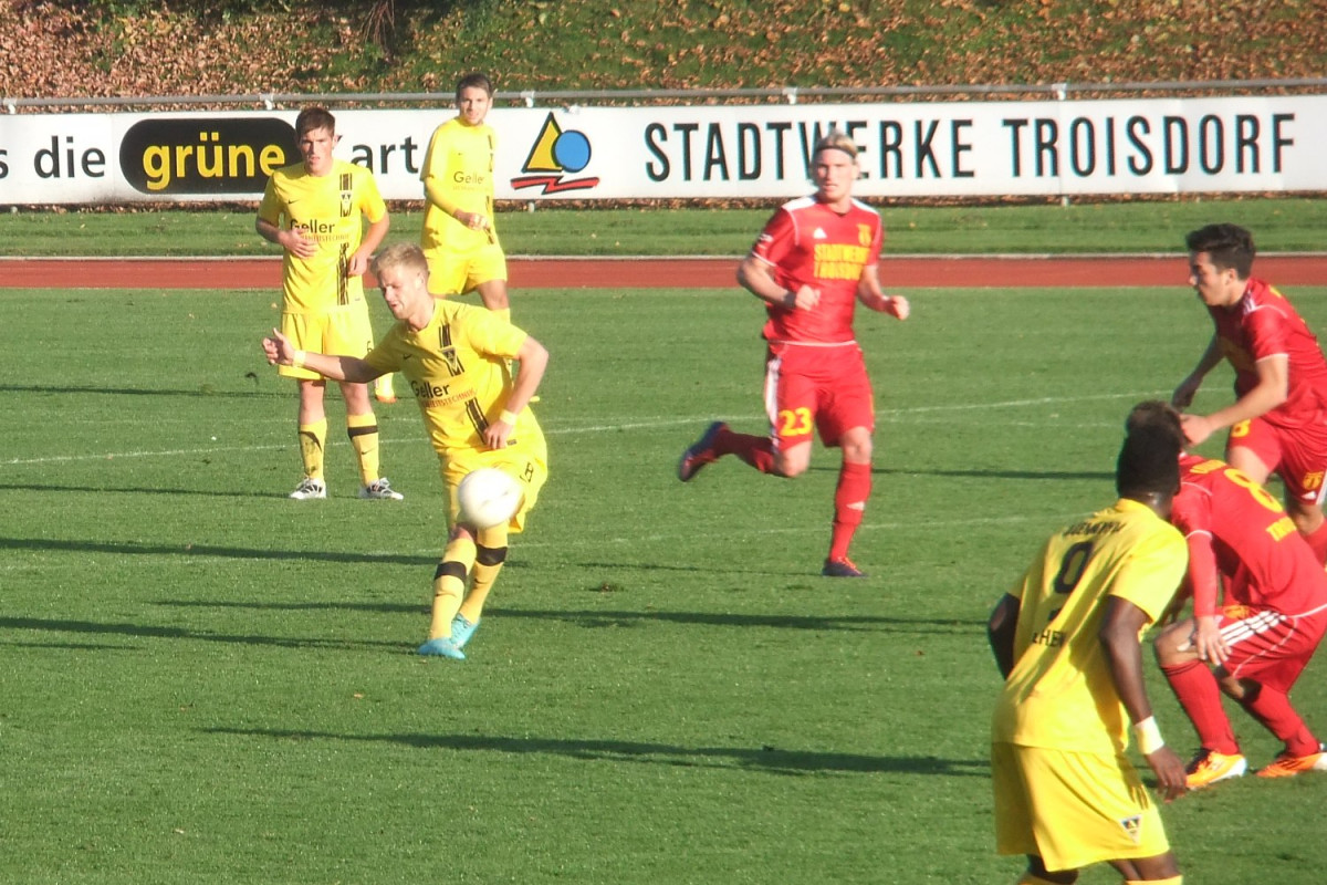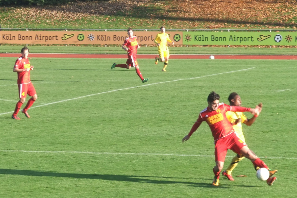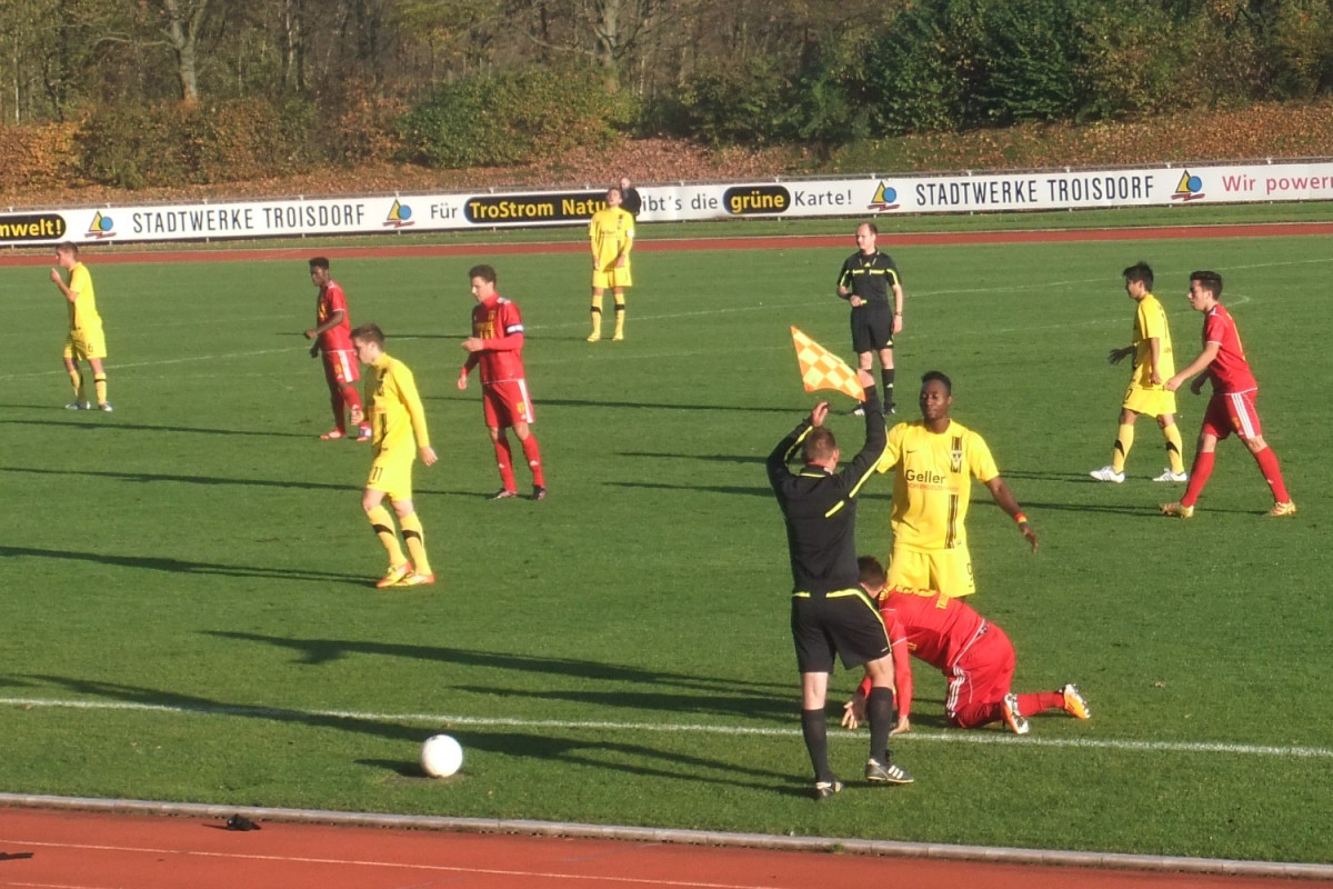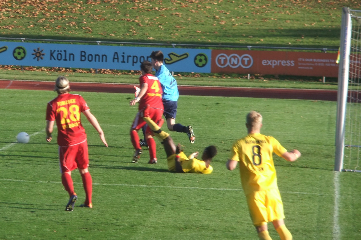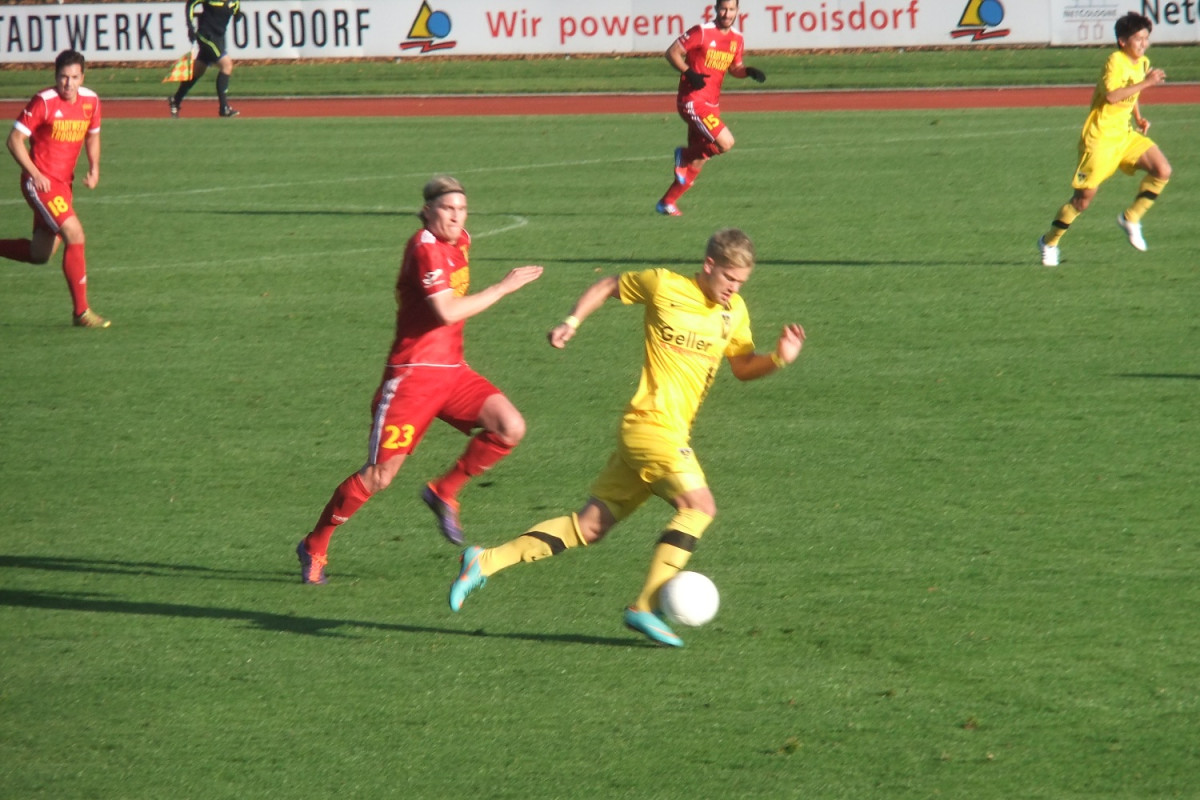 Mit dem Selbstvertrauen der letzten Spiele und den Profis Sascha Marquet, Robert Leipertz und Dario Schumacher in der Startformation übernahmen die jungen Alemannen von Beginn an das Kommando. Der erste gefährliche Angriff bescherte dem mitgereisten Anhang auch gleich die Führung. Nach einer Marquet-Hereingabe vom rechten Flügel wurde ein Schuss von Leipertz zunächst noch abgeblockt, doch im Nachsetzen bugsierte Aachens Japaner Odawara die Kugel aus sieben Metern über die Linie – 0:1 (13.). Die Tivoli-Kicker blieben das aktivere Team und hätten noch vor der Pause ihren Vorsprung ausbauen können. Leipertz traf nach schöner Einzelaktion von der Strafraumgrenze jedoch nur den Querbalken des Troisdorfer Gehäuses.