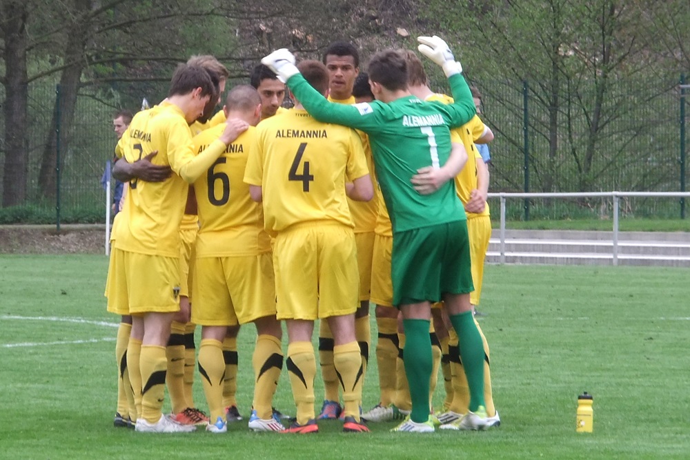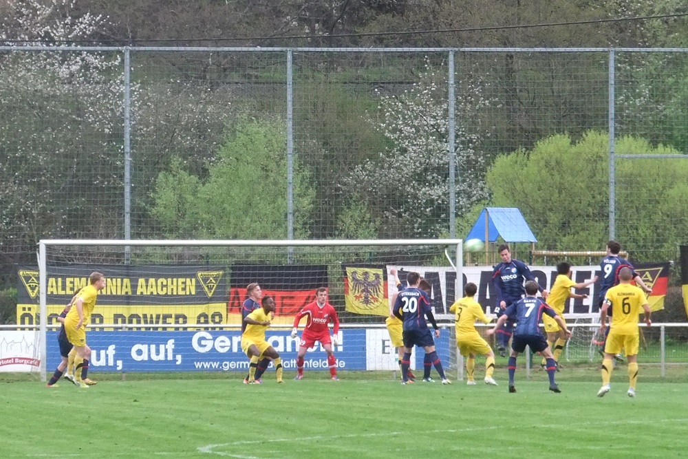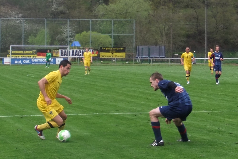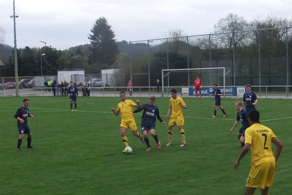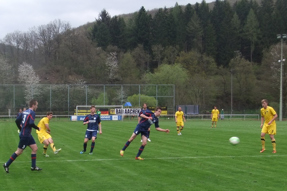 In der achten Minute kamen die Gastgeber, die im März noch ihre Visitenkarte im FVM-Pokal auf dem Tivoli abgegeben hatten, zur ersten guten Gelegenheit des Spiels. Nach einer Rechtsflanke von Barth kam Schwarz aus kurzer Distanz zum Kopfball, doch Aachens Keeper Rauhut parierte glänzend. Nach 22 Minuten fand Sterzenbach mit einem wuchtigen Fernschuss ebenfalls in Rauhut seinen Meister. In einer insgesamt ausgeglichenen ersten Hälfte feuerten die jungen Alemannen durch Philippe (12.) und Raphael de Sousa (43.) zwei Distanzschüsse ab, die Germanen-Keeper Herchenbach jedoch sicher unter Kontrolle hatte.