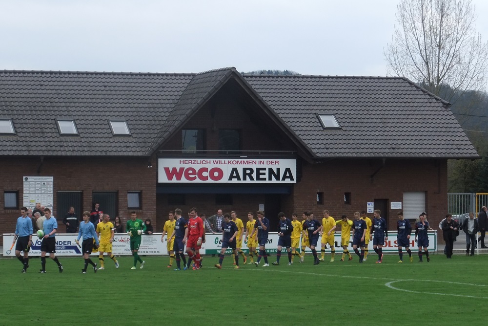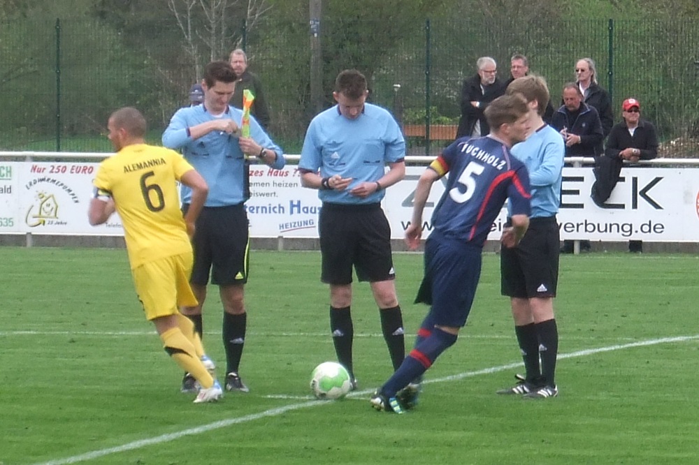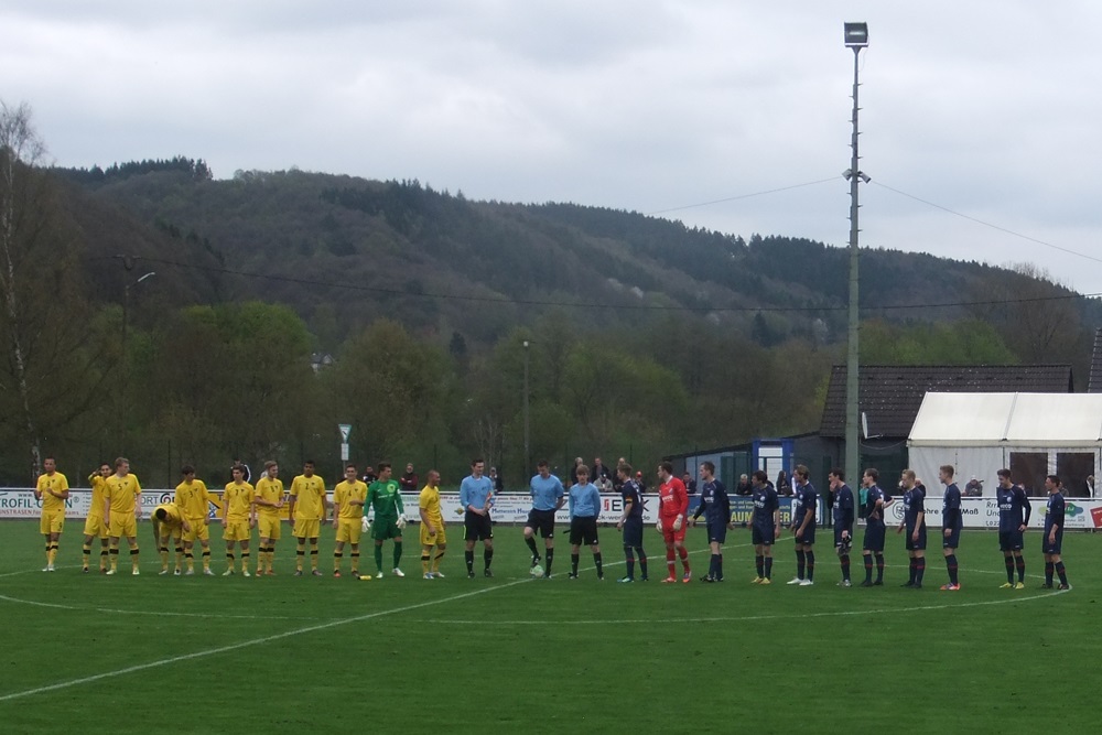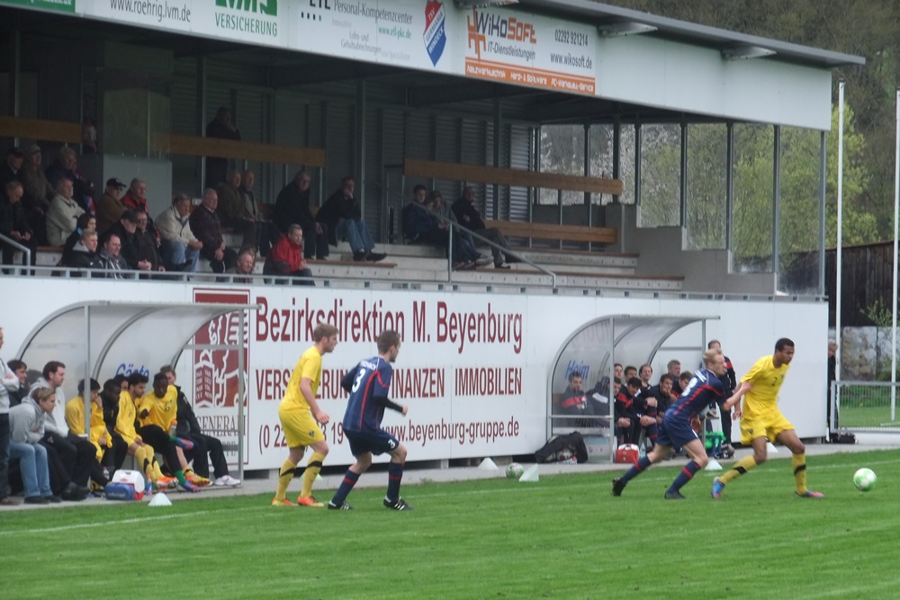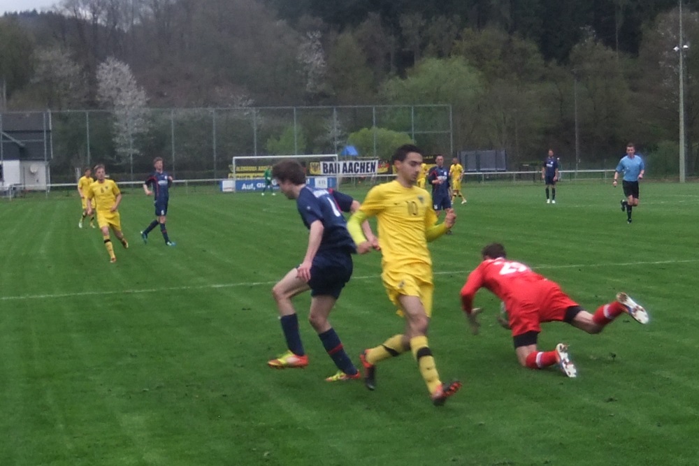 In der achten Minute kamen die Gastgeber, die im März noch ihre Visitenkarte im FVM-Pokal auf dem Tivoli abgegeben hatten, zur ersten guten Gelegenheit des Spiels. Nach einer Rechtsflanke von Barth kam Schwarz aus kurzer Distanz zum Kopfball, doch Aachens Keeper Rauhut parierte glänzend. Nach 22 Minuten fand Sterzenbach mit einem wuchtigen Fernschuss ebenfalls in Rauhut seinen Meister. In einer insgesamt ausgeglichenen ersten Hälfte feuerten die jungen Alemannen durch Philippe (12.) und Raphael de Sousa (43.) zwei Distanzschüsse ab, die Germanen-Keeper Herchenbach jedoch sicher unter Kontrolle hatte.