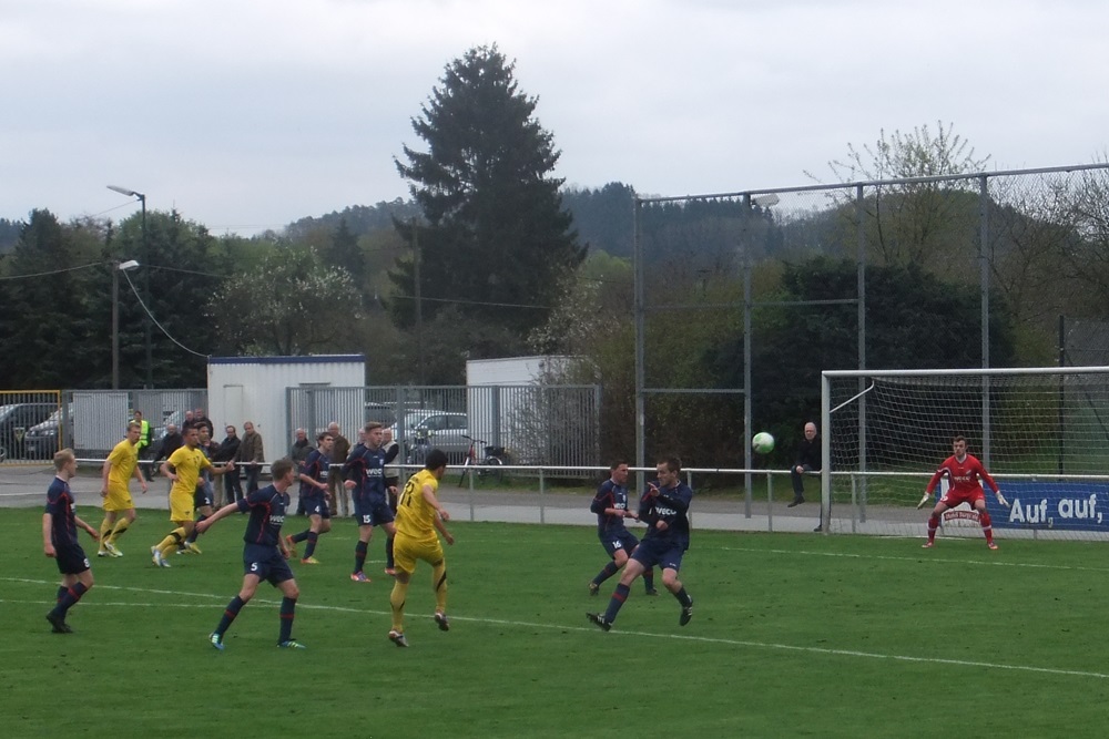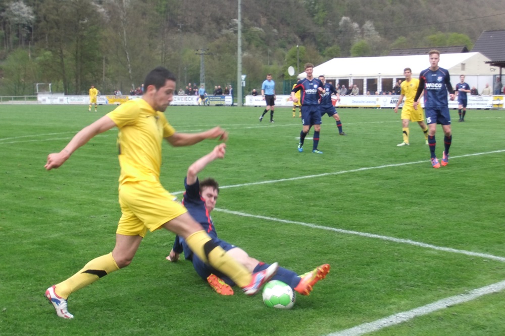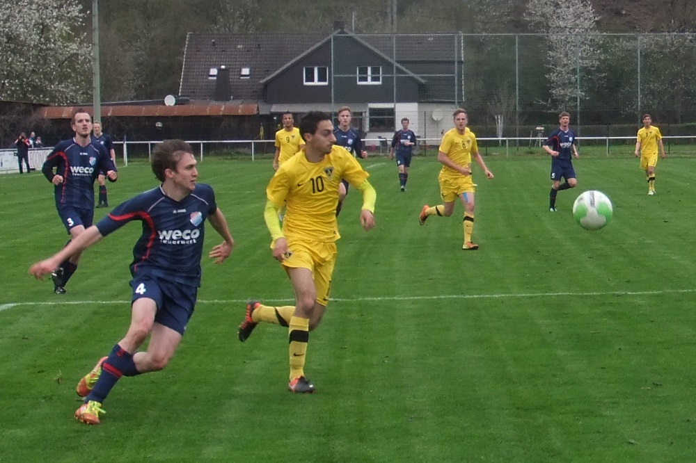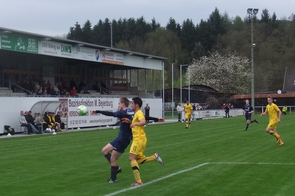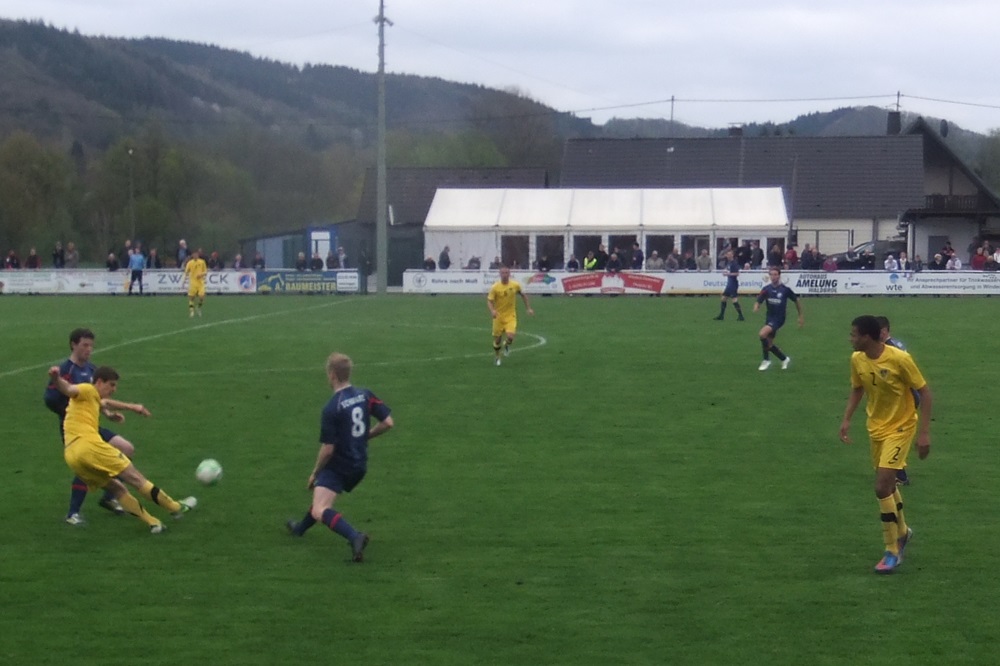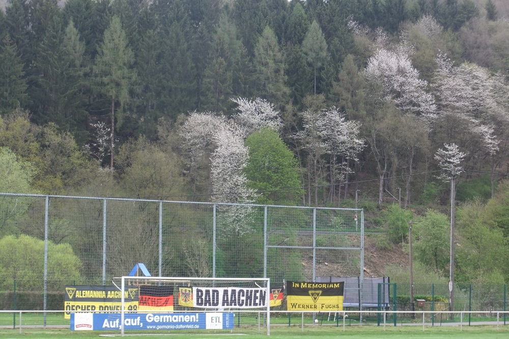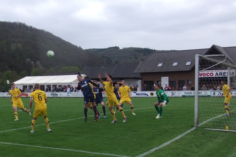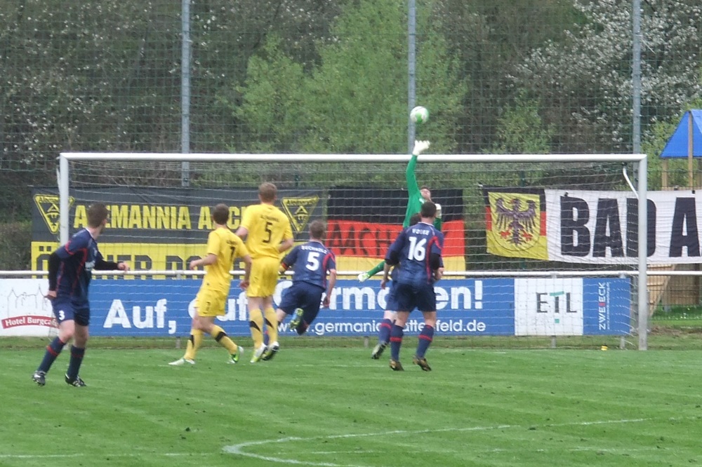 Noch weniger Torgefahr entfachten die Schwarz-Gelben nach dem Seitenwechsel. Eine Viertelstunde vor Schluss läutete ein Angriff der Gastgeber nach einem Einwurf von der linken Seite den Spiel entscheidenden Treffer ein. Der eingewechselte Trommler bediente Völker, der das Leder aus kurzer Distanz zum 1:0 über die Linie schob (76.). In den Schlussminuten hatte Voike einen weiteren Treffer für die Germanen auf dem Fuss, er traf jedoch nur den linken Pfosten (84.). Die Aachener Schlussoffensive verlief wirkungslos. "Diese Niederlage war absolut unnötig. Aber wenn man 90 Minuten lang keine wirkliche Torchance hat, braucht man sich nicht zu beschweren", ägerte sich Peter Schubert über die zweite Rückrundenniederlage. Im immer noch unbegradigten Tabellenbild rutschte seine Elf vom fünften auf den siebten Tabellenrang ab. Am kommenden Mittwoch, 01.05.2013, steht das Nachholspiel bei Hilal Maroc Bergheim auf dem Programm.