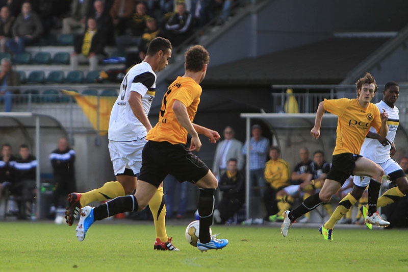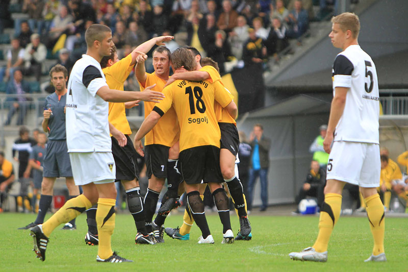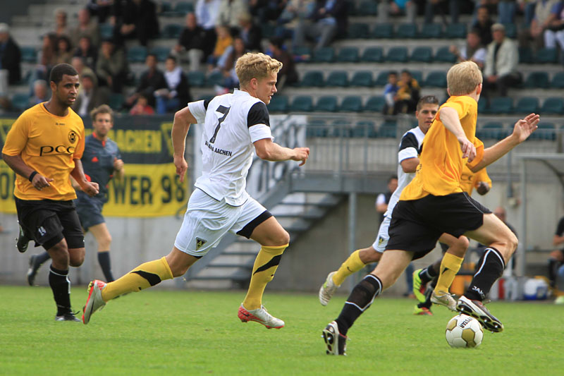Das mit den Profis David Hohs, Jonas Strifler, Lennart Hartmann und Andreas Korte verstärkte Aachener U23-Team erwischte einen guten Start und kam durch Sascha Marquet (4.) und Daniel Engelbrecht (7.) schon früh zu ersten klaren Einschussmöglichkeiten. Wie aus heiterem Himmel fiel nach 16 Minuten allerdings das Tor auf der Gegenseite. Sogolj nutzte ein Missverständnis in der Aachener Innenverteidigung und drosch das Leder unhaltbar für Hohs von der Strafraumgrenze in die Maschen. In der Folgezeit kontrollierten die jungen Alemannen zwar das Spiel, zwingende Torgelegenheiten blieben jedoch zunächst Mangelware. Mit dem Halbzeitpfiff fasste sich Lennart Hartmann auf Zuspiel von Daniel Engelbrecht ein Herz und ließ VfB-Keeper Holewe mit wuchtigen Schuss aus 22 Metern in den rechten Winkel nicht den Hauch einer Abwehrchance – 1:1 (45.).
