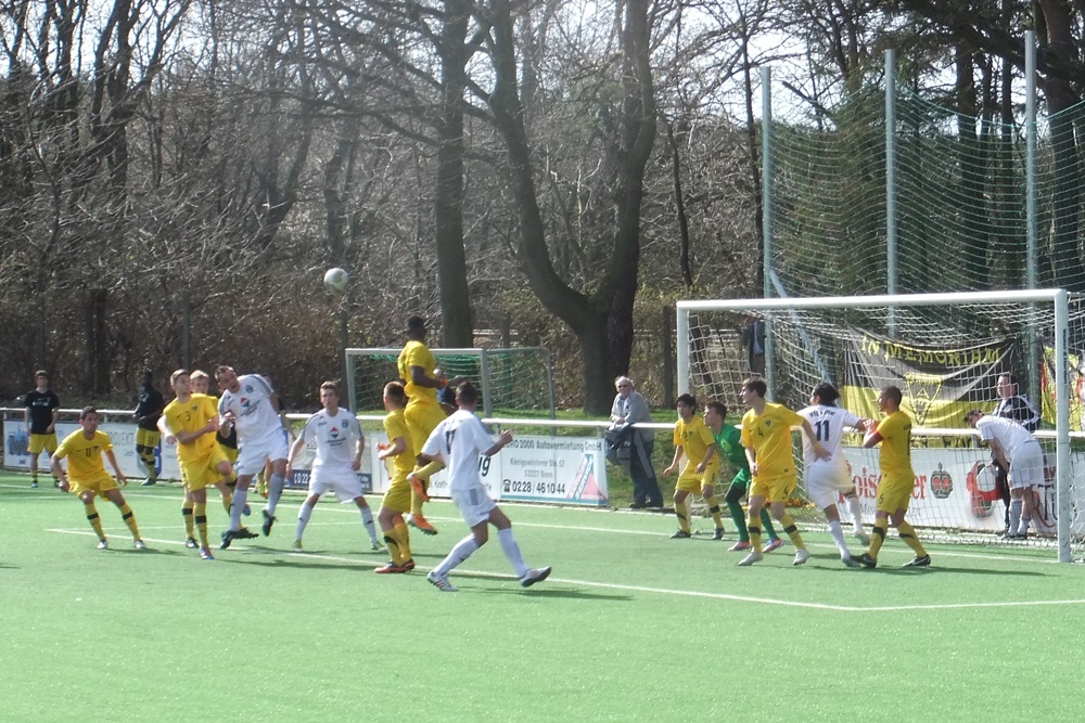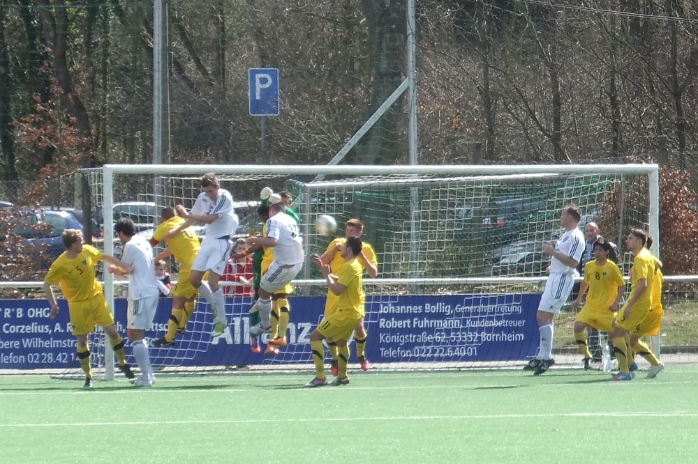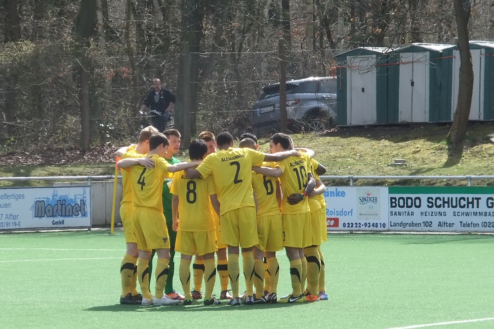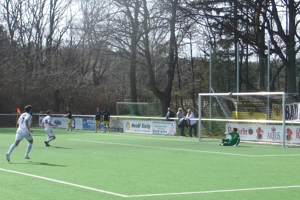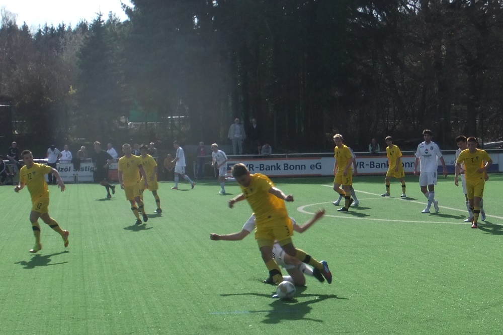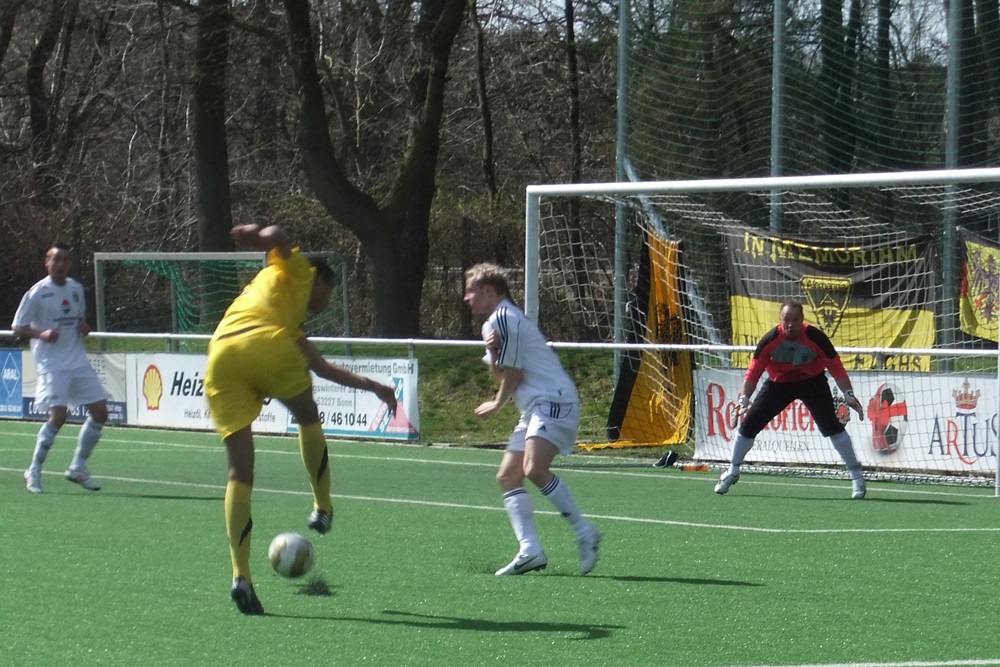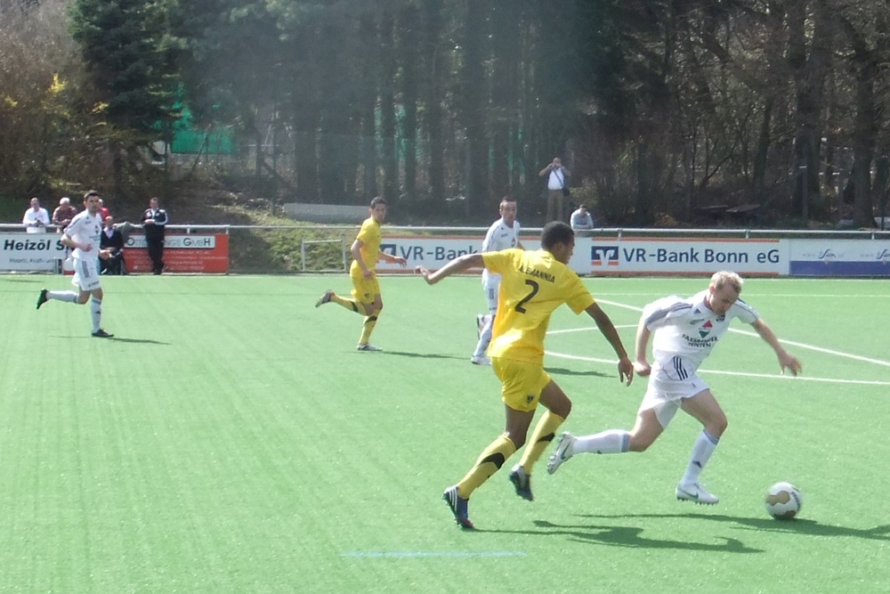 Bei bestem Frühlingswetter sahen die Zuschauer eine insgesamt ausgeglichene Partie, in der der Tabellenzwölfte aus der Nähe von Bonn den besseren Start erwischte. Recep Kartal wurde mit einem Doppelpass freigespielt und scheiterte mit einem Flachschuss an Kevin Rauhut (7.). Wenig später hätte Patrick Dietz den weit aufgerückten Aachener Keeper beinahe mit einem Schuss aus über 40 Metern überrascht (14.). Mitte des ersten Durchgangs fand die Alemannia besser ins Spiel. Marvin Ajani setzte einenn Volleyschuss aus 20 Metern neben das Tor (17.), ebenso wie Jan-Frederick Göhsl einen Kopfball nach Ecke von Strujic (28.). Torwart Schieber entschärfte einen Flachschuss von Eshun (36.) und Sasa Strujic schlenzte den Ball von links am rechten Winkel vorbei (45.).