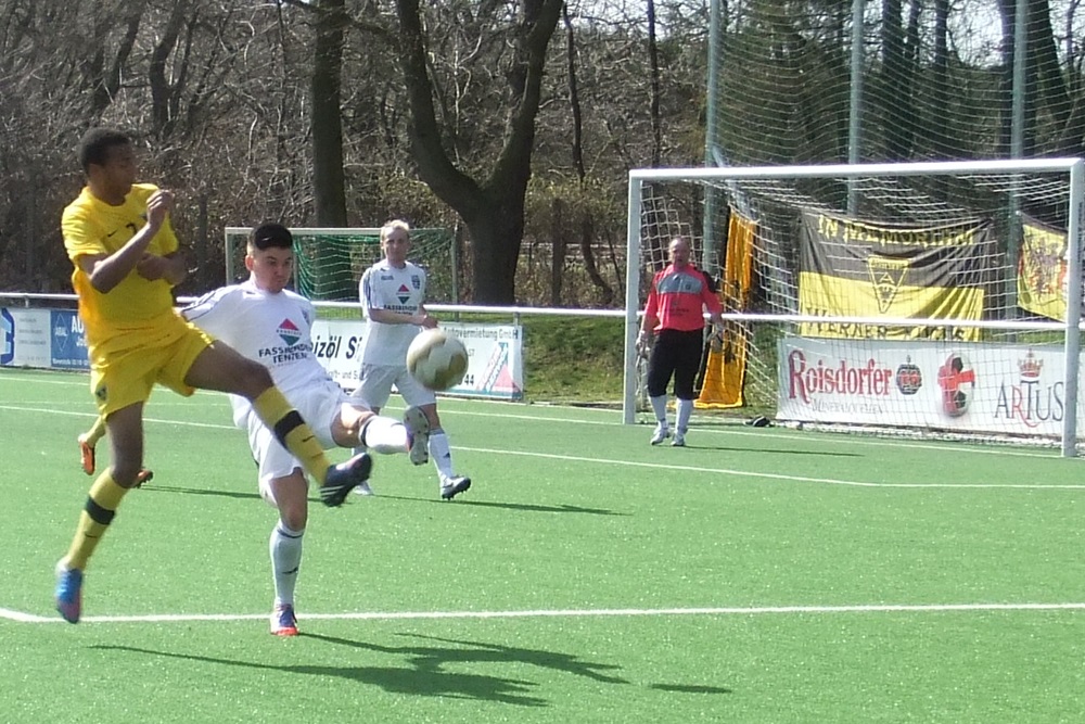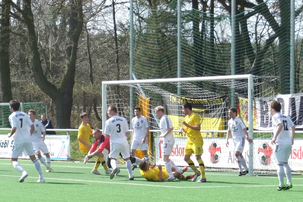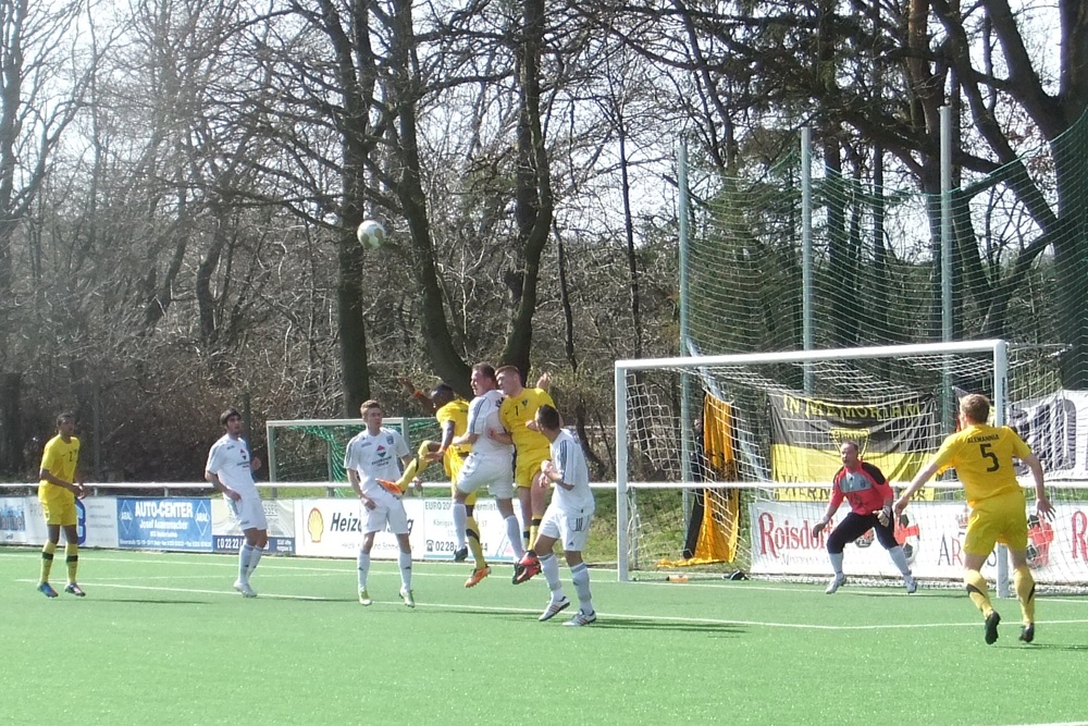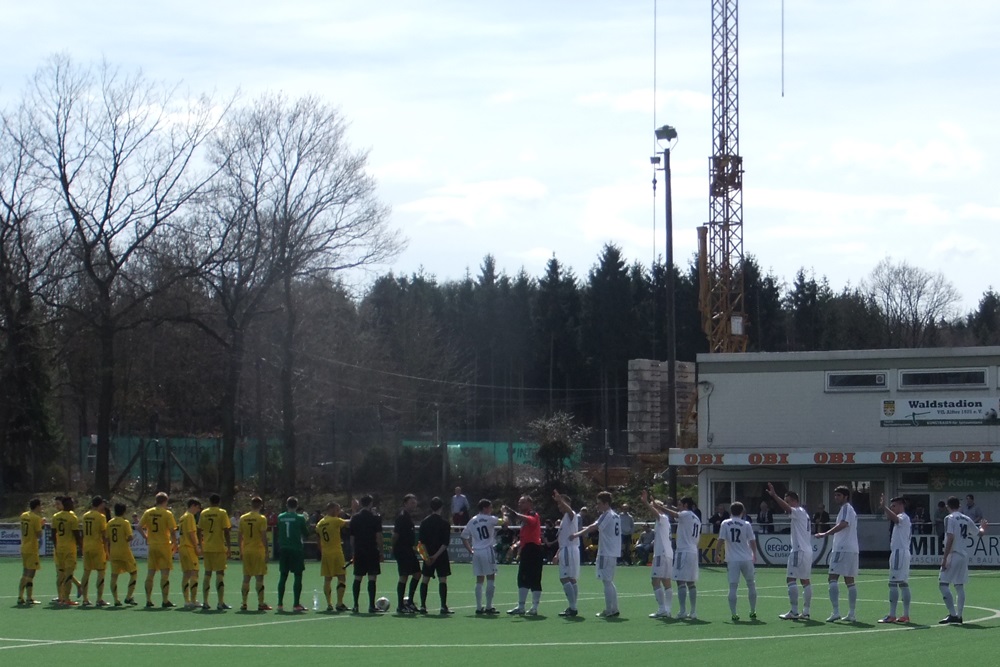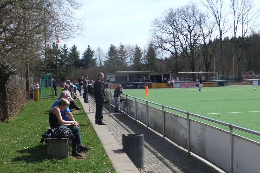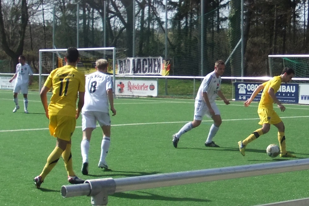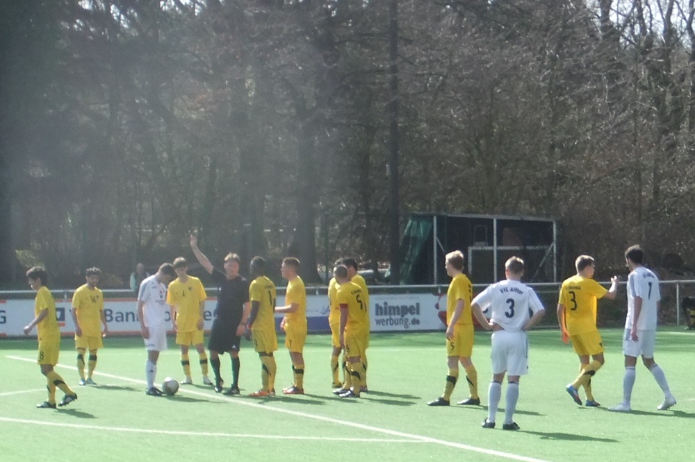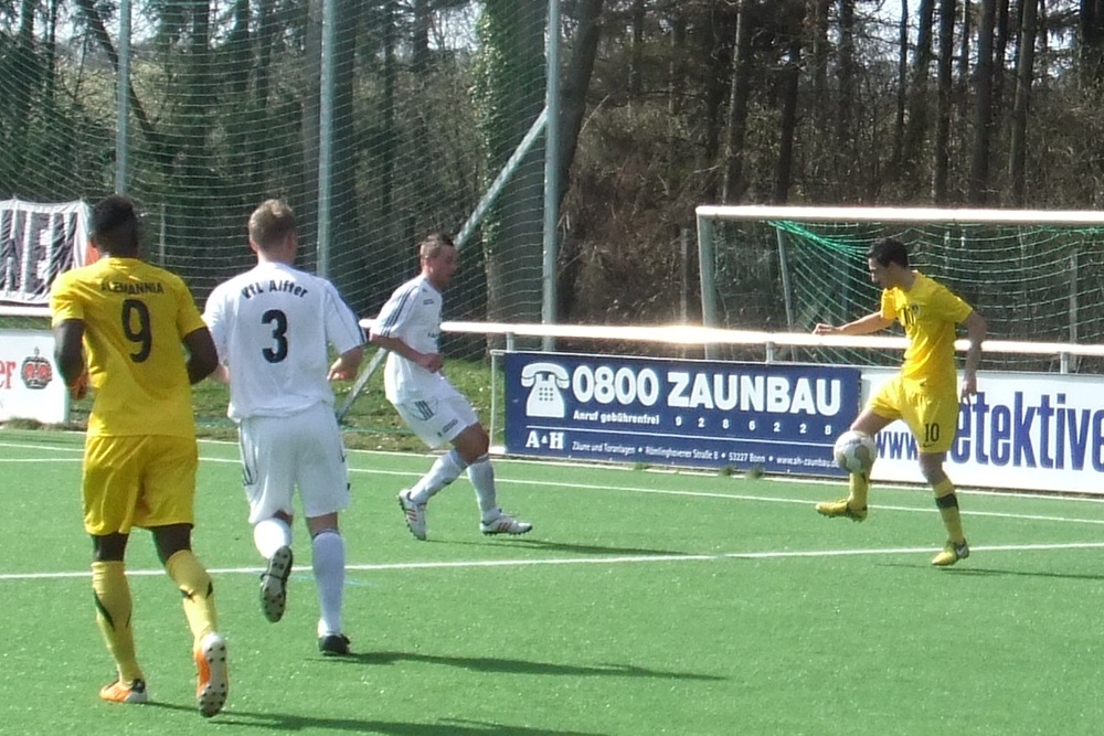 Bei bestem Frühlingswetter sahen die Zuschauer eine insgesamt ausgeglichene Partie, in der der Tabellenzwölfte aus der Nähe von Bonn den besseren Start erwischte. Recep Kartal wurde mit einem Doppelpass freigespielt und scheiterte mit einem Flachschuss an Kevin Rauhut (7.). Wenig später hätte Patrick Dietz den weit aufgerückten Aachener Keeper beinahe mit einem Schuss aus über 40 Metern überrascht (14.). Mitte des ersten Durchgangs fand die Alemannia besser ins Spiel. Marvin Ajani setzte einenn Volleyschuss aus 20 Metern neben das Tor (17.), ebenso wie Jan-Frederick Göhsl einen Kopfball nach Ecke von Strujic (28.). Torwart Schieber entschärfte einen Flachschuss von Eshun (36.) und Sasa Strujic schlenzte den Ball von links am rechten Winkel vorbei (45.).