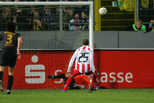 Das Spiel war jetzt nichts für schwache Nerven: Nach einem weiten Ball der Mainzer in den Aachener Strafraum stieg Straub hoch und pflückte die Kugel herunter. Schiedsrichter Weiner zeigte jedoch zum Entsetzen des Aachener Anhangs auf den Punkt: Herzig soll ein Foul an Ruman begangen haben. Zidan, der schon das erste Tor erzielte, trat an und scheiterte. Denn Straub ahnte die Ecke und wehrte das Leder unter riesigem Jubel der Aachener Fans ab (82.). In der Schlussphase warf Mainz alles nach vorne, konnte den Sieg der Alemannia aber nicht mehr verhindern.