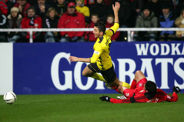Noch waren keine 90 Sekunden gespielt, und schon hatten die Fans von Bayer sowie der Alemannia den Torschrei auf den Lippen: Zunächst bediente Voronin den mitgelaufenen Paul Freier an der Strafraumkante. Mit seinem Schuss konnte er Stefan Straub zwar überwinden, doch Sergio Pinto rettete auf der Linie (1.). Im direkten Gegenzug flankte Laurentiu Reghecampf auf Schlaudraff, der nur knapp an Bayer-Keeper Hans-Jörg Butt scheiterte. Im Nachfassen sicherte sich der Schlussmann das Leder (2.). In der Folgezeit entwickelte sich das Spiel, wie es die taktischen Aufstellungen beider Mannschaften vorgaben: Die Alemannia machte das Spiel tief aus der eigenen Hälfte. Sie hatte jedoch anfangs leichte Probleme, denn das kompakte Mittelfeld der Werkself machte ein schnelles Kombinationsspiel sehr schwierig. Es dauerte nicht lange bis sich unser Team aus der Umklammerung der Gäste befreien konnte: Jan Schlaudraff schickte Vedad Ibisevic auf die Reise. Der junge Stürmer wurde von Karim Haggui im Strafraum unfair von den Beinen geholt. Den fälligen Elfmeter setzte Reghecampf mit einem trockenen Schuss in die Maschen (9.).