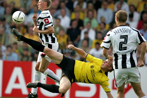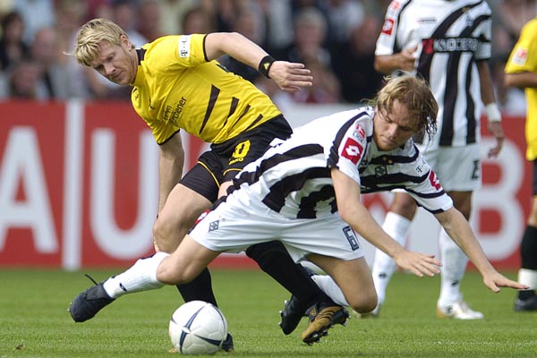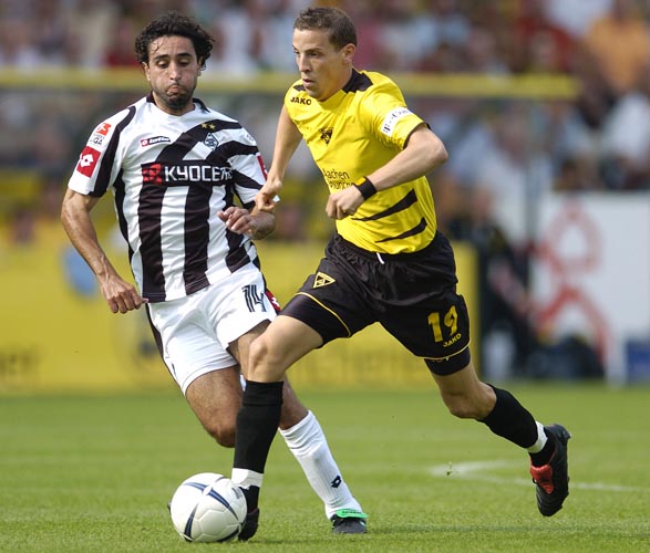 In den ersten Minuten bemühten sich beide Mannschaften den Gegner nicht ins Spiel kommen zu lassen und selber Akzente zu setzen. Die Borussia aus Gladbach kombinierte schnell im Mittelfeld und suchte das direkte Zuspiel in die Spitze. Gleich dreimal stand ein Gladbacher in den ersten vier Minuten im Abseits. Den ersten zählbaren Erfolg konnte jedoch die Alemannia in der 7. Minute verbuchen: Nach einer Ecke von der linken Seite spielte Marcell Jansen den Ball mit der Hand. Den fälligen Elfmeter verwandelte Laurentiu Reghecampf sicher zum 1:0 für die Aachener - Traumstart! In der Folgezeit drückten die „Fohlen“ und Alemannia konterte: Schlaudraff degradierte auf Rechts seine Gegenspieler zu Statisten und flankte hart in die Mitte. Leider kamen weder Marius Ebbers noch Sascha Rösler an die Kugel (12.). Nächste Chance in der Schwarz-Gelben nur drei Minuten später: Gut erkämpfter Ballbesitz im Mittelfeld und Ebbers tankte sich durch. Sein satter Schuß striff nur knapp am linken Pfosten vorbei. Die Alemannia stand jetzt unmittelbar vor dem nächsten Treffer. In der 19. Minute konnten Ebbers und Rösler einen Reghecampf-Freistoß nicht entscheidend verwerten. Mitte der ersten Halbzeit fingen die Alemannen dann an zu zaubern: Reghecampf setzte sich im Mittelfeld durch und spielte mit Ebbers Doppelpass. Sein Schuß aus 18 Metern wurde aber abgeblockt.