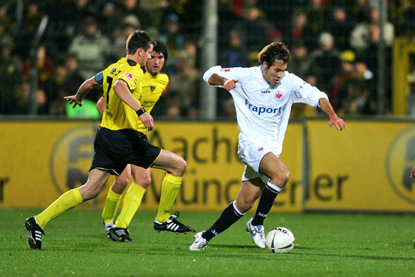 Mit zwei Wechseln auf Aachener Seite ging es in die zweite Hälfte: Sascha Dum kam für den angeschlagenen Reiner Plaßhenrich in die Partie. Auch Laurentiu Reghecampf stand auf dem Platz - für ihn musste Moses Sichone weichen. Pinto ging somit wieder zurück auf die Außenposition und Herzig rückte auf Sichones Platz. Lehmann spielte für Plaßhenrich auf der „Sechser“-Position und Dum kam im linken Mittelfeld zum Einsatz. Reghecampf belebte die rechte Seite. Die Änderung zeigte sofort Wirkung: Schlaudraff setzte sich auf Rechts durch und flankte in die Mitte. Nur um Zentimeter verpasste der reinrutschende Dum den Ball (46.). Frankfurt beschränkte sich jetzt nur noch auf das Nötigste - kam dennoch zu Torchancen. Nach einer Ecke kam der Grieche Sotorios Kyrgiakos an den Ball. Seinen Kopfball konnte Nicht aber ohne Probleme entschärfen (50.). Zwei Minuten später dann Aufregung am Tivoli: Sascha Dum sah nach einer Grätsche seine fünfte Gelbe Karte - wird somit in Wolfsburg gesperrt (52.). Dum spielte zwar den Ball und rutschte auf dem nassen Boden in den Gegenspieler hinein.