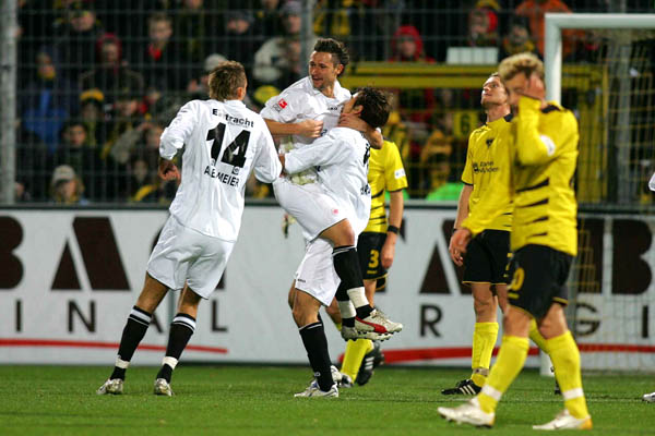 Die Alemannen bestimmten jetzt die Partie und kamen auch durch Ebbers (55.) und Herzig (57.) zu guten Möglichkeiten, die jedoch ungenutzt blieben. Die Eintracht aus Frankfurt agierte in dieser Hinsicht wesentlich effektiver: Albert Streit bediente mit einem klugen Zuspiel den schnellen Takahara. Der lief Herzig und Klitzpera einfach davon und schob den Ball zum 1:3 in die Maschen (62.). Eine Minute später Glück für unser Team: Nach einer Flanke von Links kam Meier mit dem Kopf an den Ball. Keeper Nicht bekam den Ball zwar noch zu fassen, rutschte mit dem Leder aber hinter die Linie. Weder der Schiedsrichter noch der Linienrichter gaben den Treffer (63.).