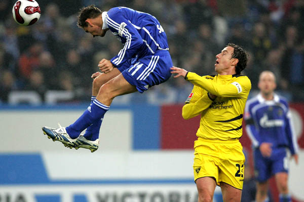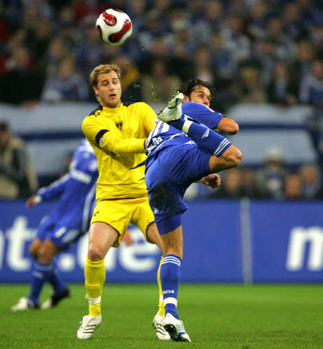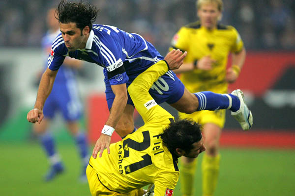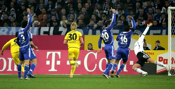 Der Aufsteiger kam jetzt besser ins Spiel, doch die Führung währte nicht lange. Denn nur fünf Minuten später zeigte Schiri Florian Meyer nach anfänglichem Zögern auf den Punkt. Moses Sichone hatte den Ball zwar im Strafraum mit der Hand gespielt, war aber im Kopfballduell von Fabian Ernst hart angegangen worden. Der Schalker Rafinha ließ sich die Möglichkeit nicht nehmen und glich aus. So stand es 1:1 nach 23 Minuten. In der Folgezeit neutralisierten sich beide Mannschaften zunehmend im Mittelfeld. Bis auf einen Kopfball von Kuranyi (26.) und einen Weitschuss von Rösler (32.) sprang auf beiden Seiten nicht viel heraus. In dieser Phase des Spiels ließen sich die beiden Außenpositionen Lövenkrands und Varela weiter zurückfallen und stellten so ein Übergewicht im Mittelfeld her. Die dadurch eroberten Bälle wurden meist mittels Flanken aus dem Halbfeld in den Sechzehner geschlagen. Die „Knappen“ diktierten jetzt das Geschehen. Die Alemannia stand tief in der eigenen Hälfte und fing die Angriffe der Schalker ab. Über Ebbers (36.) und Ibisevic (44.) wurden dann schnelle Konter gesetzt, die leider nicht zu Torchancen führten. Mit einem Unentschieden ging es in die Pause.
