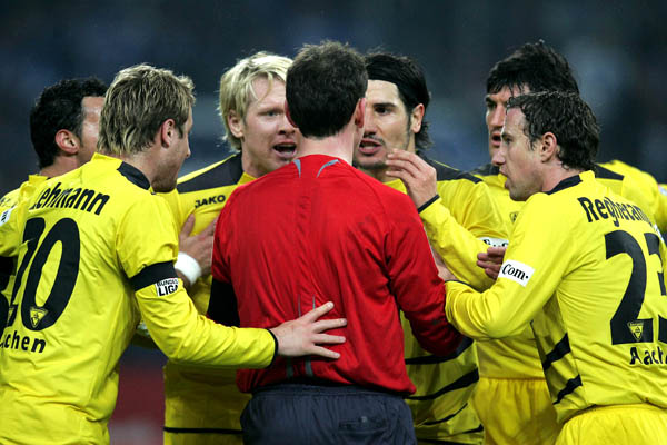 Im Gegenzug unser Team: Mit einer schönen Aktion setzte Ebbers Ibisevic in Szene, der sich im Strafraum nicht durchsetzen konnte. Der Abpraller kam allerdings zu Ebbers, der aus 18 Metern nur das Außennetz traf. Auf der Gegenseite flankte Rodriguez auf Varela. Der Schalker scheiterte aus fünf Metern am starken Straub (16.). Als das Team von Mirko Slomka mehr und mehr ins Rollen kam, schlug die Alemannia zu. Leiwakabessy flankte von Links in den Strafraum, wo Rösler den Ball für Ibisevic mustergültig anlupfte. Der Bosnier nagelte das Leder aus acht Metern ohne Kompromisse unter die Latte. Die Führung für die Schwarz-Gelben nach 18 Minuten. Der Treffer zählte - obwohl Ibisevic einen Schritt im Abseits stand.