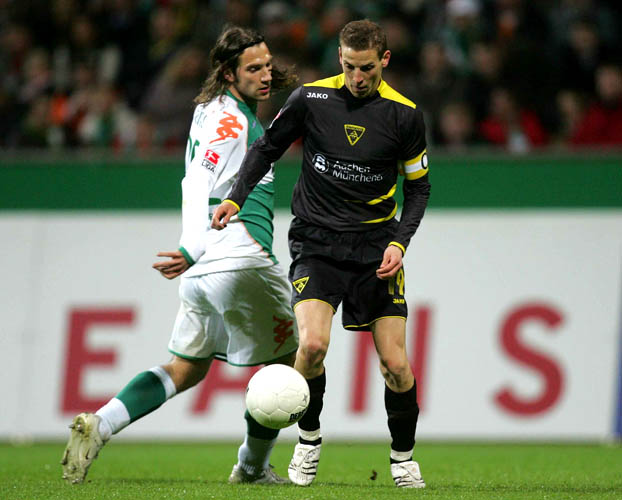 Aachen stand hinten weiterhin kompakt und es dauerte bis zur 32. Minute bis Bremen gefährlich vor das Aachener Tor kam. Klose passte zu Diego, der frei im Strafraum stand. Heidrich hatte aber aufgepasst und trennte den Bremer Spielmacher kompromisslos und fair vom Ball (34.). Das Spiel ging jetzt fast nur in eine Richtung - in die von Torwart Kristian Nicht. Aachen dagegen spielte mit der Führung im Rücken weiter auf Konter. Leider wurden die Angriffe aber zu unkonzentriert zu Ende gespielt, so dass sich keine weiteren Gelegenheiten für unser Team ergaben. Bremen dagegen hatte Chancen - nutzte sie aber nicht. Weder Klose in der 40. Minute, noch Diego (43. und 45.) konnten mit Schüssen das Tor treffen. So ging es mit einer knappen Führung für unser Team in die Halbzeitpause.
