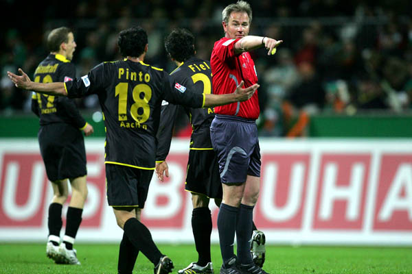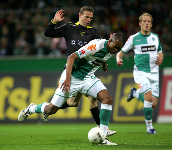 Unsere Abwehr stand bis zu dem diesem Zeitpunkt sicher - Bremen versuchte es folglich mit Schüssen aus der Distanz. Diego zielte aus 20 Metern nur knapp am Aachener Gehäuse vorbei (18.). Fünf Minuten später war wieder der Brasilianer: Sein Schuss konnte aber in aller letzter Sekunde von Alexander Klitzpera abgeblockt werden (22.). Der Druck des Hausherren nahm von Minute von Minute zu: Zunächst schoss Frings aus 18 Metern auf Tor, doch Nicht lenkte den Ball gekonnt über den Querbalken (22.). Nur drei Minuten später hatte Aaron Hunt die Chance zum Ausgleich auf dem Fuß: Nach einer Diego-Ecke landete ihm die Kugel vor den Füßen, doch aus acht Metern schlenzte er das Leder neben das Tor (25.). Das Spiel wurde jetzt zunehmend hitziger, was daran lag, dass die Bremer ihre Chancen nicht nutzten und sich vom Schiedsrichter Dr. Helmut Fleischer benachteiligt fühlten.