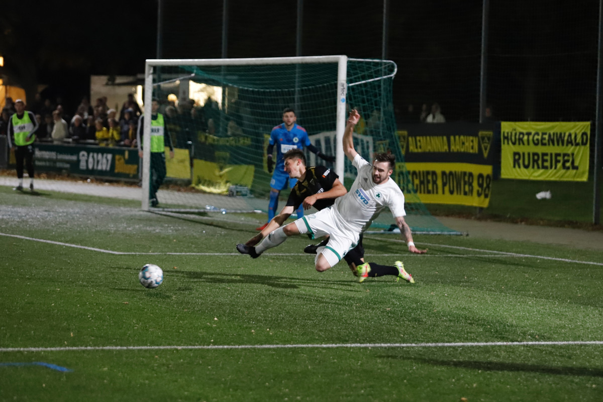 Mit Blick auf das Personal musste Interimscoach Uwe Grauer neben den Langzeitverletzten Freddy Baum und Nils Blumberg nach wie vor auch auf Lars Oeßwein verzichten, der sich ebenso im Aufbautraining befindet wie Oluwabori Falaye. Zudem fiel Tjorben Uphoff kurzfristig aus. Im Vergleich zum Spiel gegen Ahlen rückten unterdessen Jannik Mause, Aldin Dervisevic und Marcel Damaschek in die Startelf. Das Duell mit dem Tabellenzwölften der Mittelrheinliga verlief vor rund 1000 Zuschauern, darunter die Hälfte aus Aachen, zunächst ohne Torraumszenen, bis Jannis Held über die rechte Seite durchbrach und eine scharfe Hereingabe vor das Tor der Gastgeber brachte. Allerdings konnten weder Tim Buchheister im Zentrum noch André Dej am zweiten Pfosten das Zuspiel verwerten (16.). Die erste Aktion der Hausherren hatte es dann direkt in sich: Einen Abschlag von Keeper Kevin Jackmuth erlief Musashi Fujiyoshi, der Lukas Wilton abschüttelte und auf einmal frei vor Alemannia-Keeper Joshua Mroß auftauchte. Dieser bekam seine Hände noch an den Abschluss des Japaners und konnte die Kugel somit an den Pfosten lenken (26.). Kurz vor der Halbzeitpause traf die Viktoria erneut das Aluminium – der früh eingewechselte Sinan Ak hämmerte das Spielgerät mit einem satten Distanzschuss an die Latte (43.). Torlos ging es in die Kabinen.