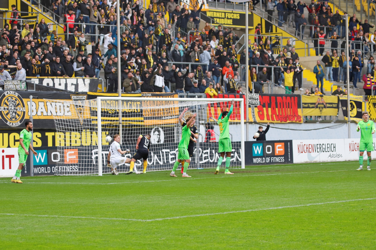 Nach zuletzt zwei Auswärtsniederlagen sollte gegen den SV Straelen, der aktuell auf dem letzten Tabellenplatz steht, am 29. Spieltag zuhause wieder ein Sieg folgen. So gehörte die erste Chance des Spiels den Alemannen, die heute wieder mit einer Viererkette aufliefen. Freddy Baum schickte Jannis Held mit einem langen Ball. Der tauchte frei vor Straelen-Keeper Julius Paris auf, konnte den Ball aber nicht im Tor unterbringen (5.). Kurz darauf hatten auch die Straelener die ersten Schussmöglichkeiten. Sowohl einen Schuss von Hirotaka Yamada, der sich über die rechte Seite gut durchsetzte (9.), als auch einen Versuch aus etwa 25 Metern durch Ken Mata (13.) konnte Marcel Johnen problemlos parieren. Die Alemannia hatte zwar zunächst mehr Ballbesitz, die gefährlichen Aktionen erspielten sich allerdings die Gäste. Einige Flanken und Vorstöße führten zunächst noch nicht zu großen Tormöglichkeiten. Aber auch die Alemannia tat sich schwer, Chancen zu erspielen. In der 28. Minuten hätte es gefährlich werden können, als Held von der rechten Seite auf den freistehenden Baum flankte, dieser jedoch versuchte den Ball nochmal abzulegen, statt selbst abzuschließen – so landete der Ball wieder beim Gegenspieler. Straelen blieb am Drücker und konnte sich wieder Chancen erspielen. Ein langer Ball landete bei Said Harouz, der mit seinem Schuss aber nur das Außennetz traf (31.). Nur zwei Zeigerumdrehungen später fehlten nur noch Zentimeter zu Führung der Straelener. Mata hatte auf der rechten Seite zu viel Platz, zog nach innen, traf dann mit seinem Schuss von knapp außerhalb des Strafraums aber nur den Pfosten. Kurz vor dem Pausenpfiff war es aber dann soweit – der SV Straelen erzielte den verdienten Führungstreffer. Wieder war es Mata, der sich über die rechte Seite gut durchsetzte und den Ball flach reinflankte. Am langen Pfosten musste Yamada aus wenigen Metern nur noch einschieben (45.). Auch der Trainer sah eine „schlechte erste Halbzeit“, in der die Mannschaft „keinen Zugriff hatte und lethargisch gespielt hat“.