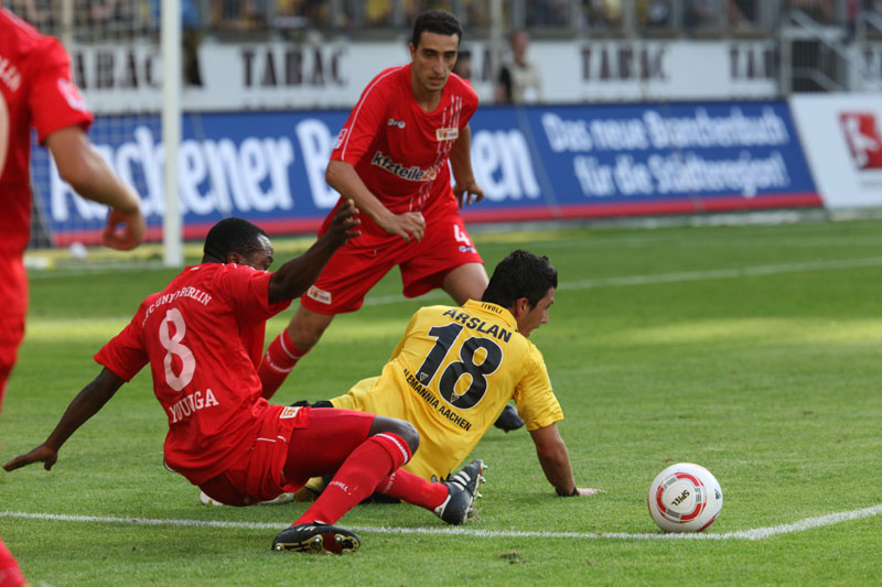 Beiden Teams war von Beginn an anzumerken, dass sie munter nach vorne spielen wollten. Ex-Alemanne Mosquera prüfte Hohs nach vier Minuten zum ersten Mal, doch Aachens neue Nummer Eins packte im Nachfassen sicher zu. Bis es für Berlins Keeper Jan Glinker erstmals gefährlich wurde, dauerte es bis zur 16. Minute, doch das hätte bereits die Führung für die Alemannia sein müssen: Gueye hatte den Ball auf der rechten Außenbahn erhalten, von wo aus er mustergültig Arslan bediente, der die Kugel schön auf den zweiten Pfosten spielte. Glinker war geschlagen, doch der mitgelaufene Uludag verzog knapp über das Gehäuse. Nur zwei Minuten später versuchte sich auch Herzig in der Offensive, als er einen abgelegten Ball von Höger in Rückenlage nur über das gegnerische Tor brachte (18.).