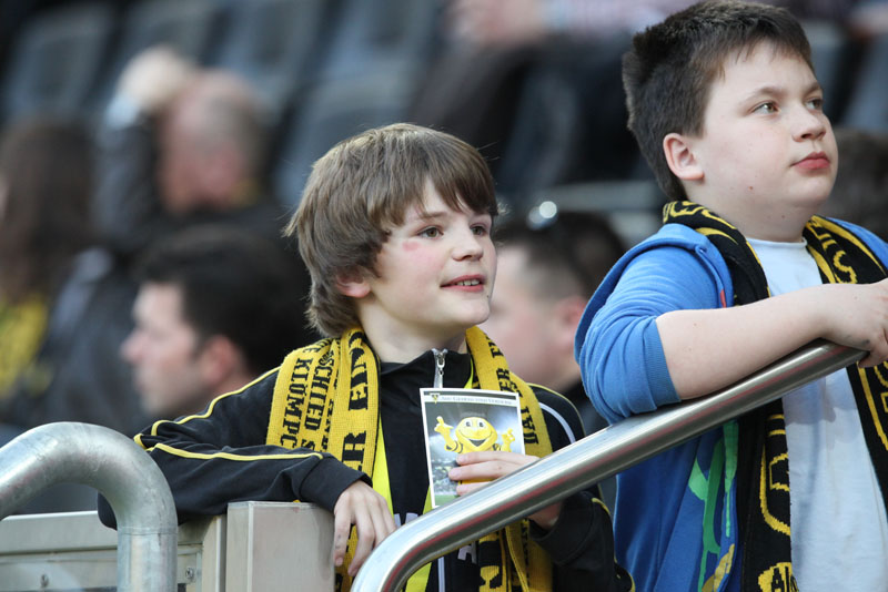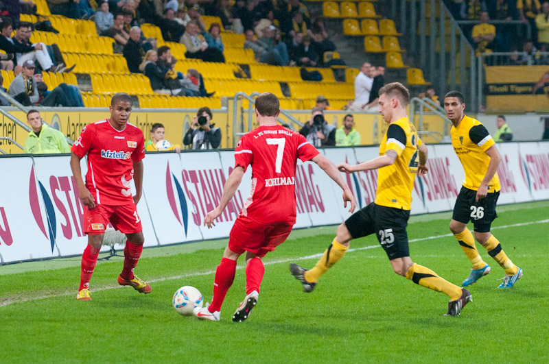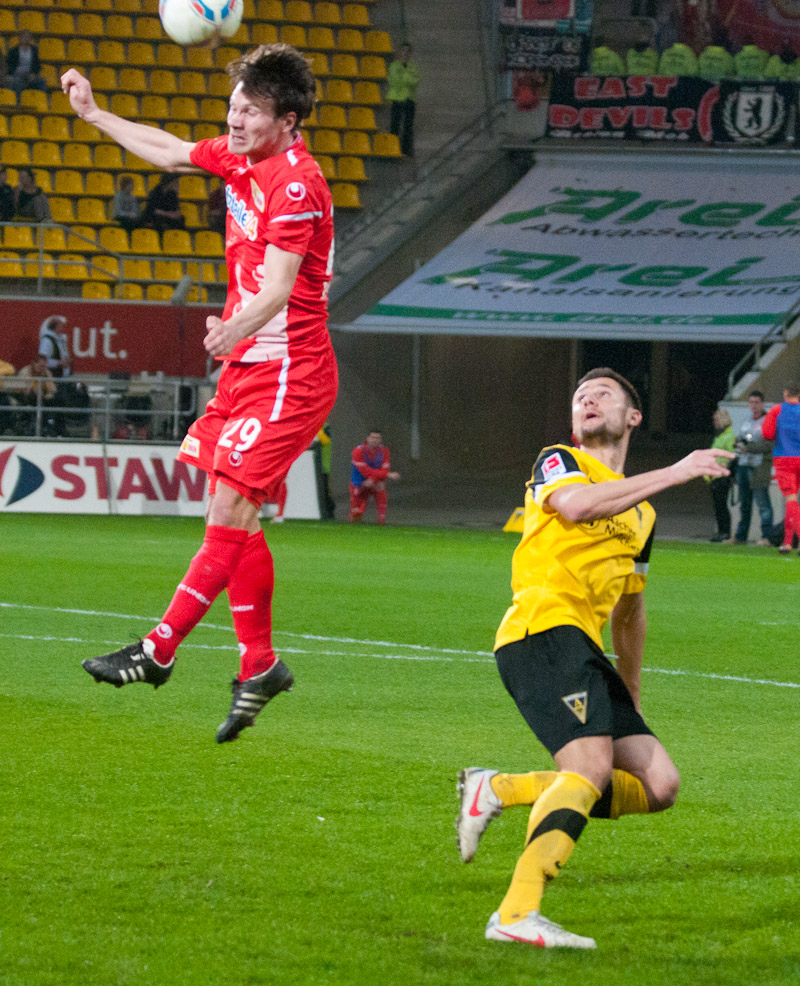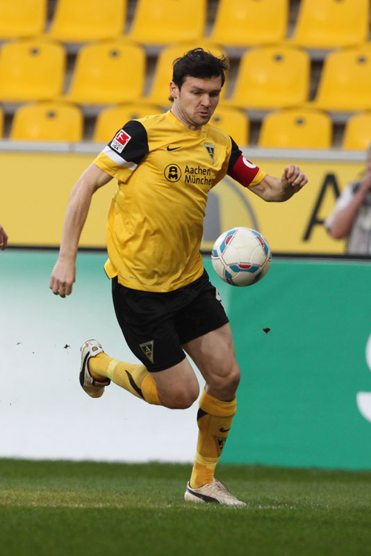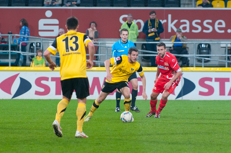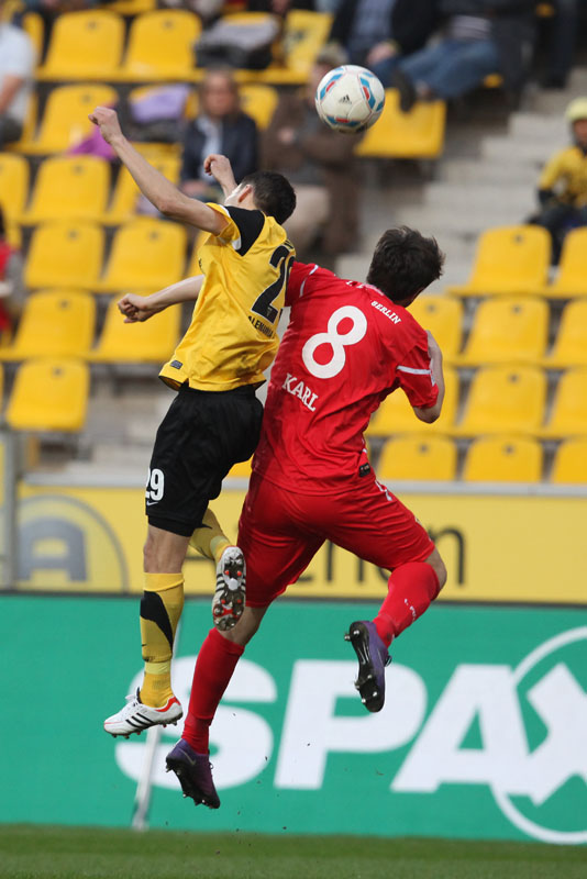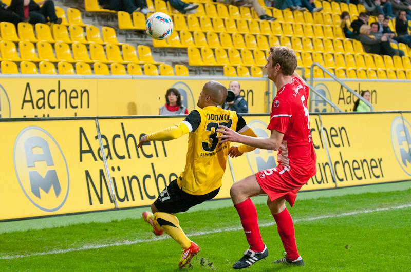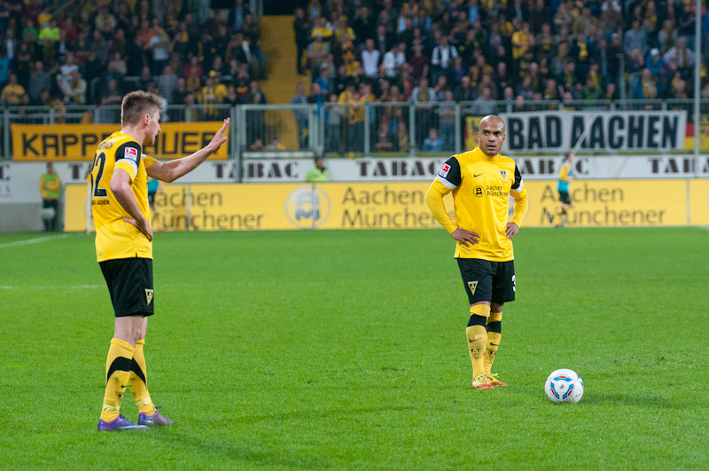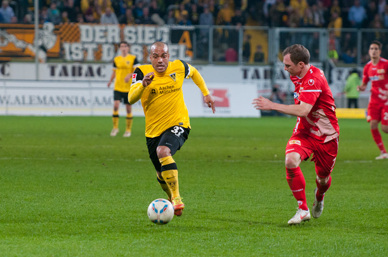 Die Funkel-Elf war zurück, der Ausgleich mehr als verdient. Stehle hätte gut zehn Minuten später die Führung per Kopf im Anschluss an einer Achenbach-Ecke erzielen können, der Ball wurde aber gerade noch auf der Linie geklärt. Mit den Gästen aus Berlin musste man an diesem Abend jedoch rechnen. Immer wieder sorgten sie durch schnell vorgetragene Konter für Gefahr, Silvio verfehlte aus gut 16 Metern nur knapp (38.). Es wurde ihnen aber auch zu häufig zu leicht gemacht: Wieder kam der Angriff über die rechte Aachener Abwehrseite, Stehle konnte Terodde nicht konsequent stören, aus der Drehung vollstreckte der Angreifer aus kurzer Distanz zum 1:2 (41.). Wenig später hätte er mit einem erneuten Drehschuss sogar erhöhen können. Der Alemannia gehörte der erste Durchgang, trotzdem ging man mit einem Rückstand in die Pause.