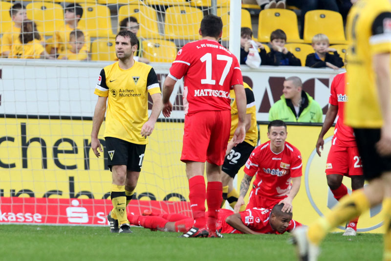 Auf einmal war Union hellwach: Nach einer Ecke lauerte Pfertzel im Hintergrund und verzog nur knapp per Volleyschuss (20.). Drei Minuten später der plötzliche Tiefschlag für die Alemannia: Weil es gleich zwei Leuten nicht gelang, Kapitän Torsten Mattuschka aufzuhalten, hatte Chinedu Ede leichtes Spiel. Er umkurvte die komplette Hintermannschaft und schob im Fallen ein – 0:1 (23.).