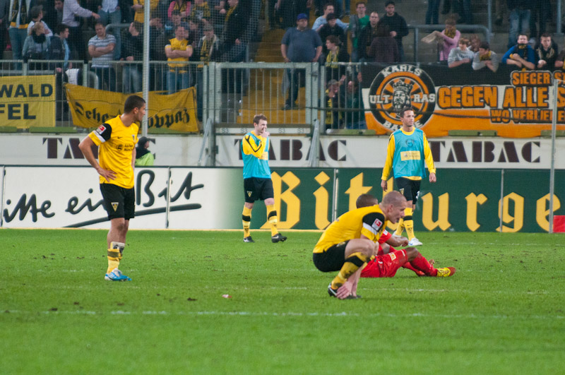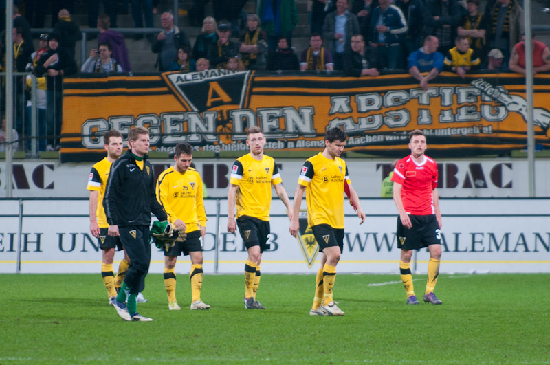 Es dauerte bis zur 65. Minute, als die Alemannia nochmals in der Offensive zum Zuge kam. Uludag hatte sich auf der linken Seite durchgesetzt, seine Hereingabe erreichte Auer, der den Ball aber nicht richtig traf und daher verzog. Auch bei Uludags Schuss fehlte die letzte Präzision, Glinker wehrte die Kugel ab (77). Die Bemühungen, vielleicht nochmal heran zu kommen, waren da. Der Funkel-Elf fehlten jedoch die Mittel, die Gäste ernsthaft in Gefahr zu bringen. So passierte nicht mehr viel bis zum Schlusspfiff, die Niederlage konnte nicht mehr abgewehrt werden.