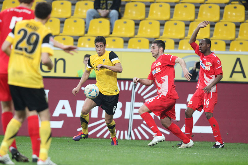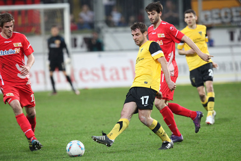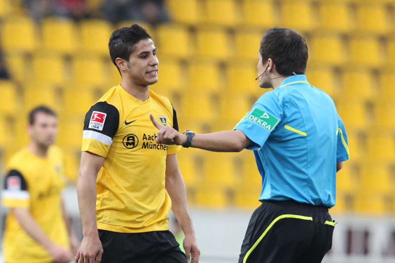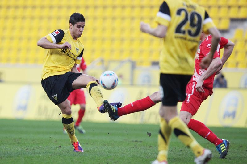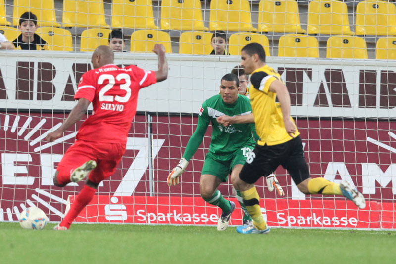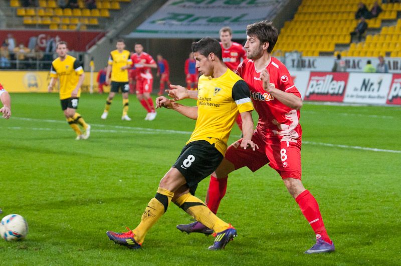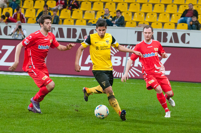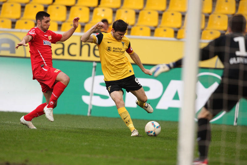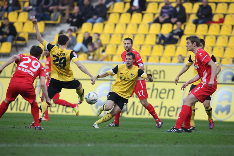 Es war ein flotter Beginn der Alemannia, die an diesem sonnigen Abend vor eigenem Publikum gleich den Vorwärtsgang einlegte. Radu reagierte nach einem Ballgewinn in der zweiten Minute blitzschnell, bediente Uludag, der frei vor Gäste-Torhüter Glinker zu ungenau zielte und diesem direkt in die Arme schoss. Doch es ging munter weiter: Streits direkter Freistoß aus knapp 18 Metern zwang Glinker zu einer Parade, die erste Viertelstunde gehörte klar den Schwarz-Gelben.