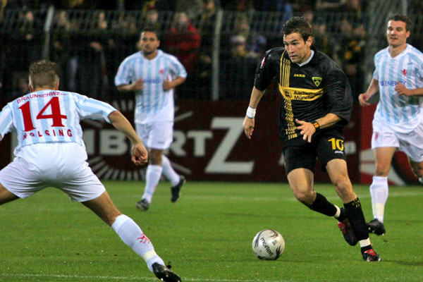 Bei den Braunschweigern ist Dennis Brinkmann neben Oldie Jürgen Rische und Daniel Graf der Chef auf dem Platz, spielt unter Trainer Michael Krüger auf seiner absoluten Lieblingsposition vor der Abwehr. „Viel laufen, Löcher stopfen, viel reden - das ist mein Spiel“, erzählt Dennis, dem es mit seiner Frau auch privat immer besser in Braunschweig gefällt. Als ehemaliger Aachener kann er sich vorstellen, dass es nach zwei Heimniederlagen in der Liga am Montag für die Alemannia um Wiedergutmachung geht.