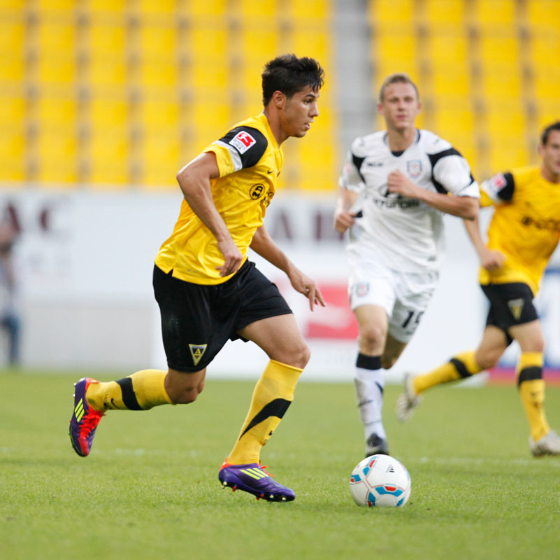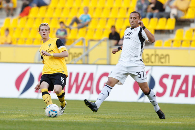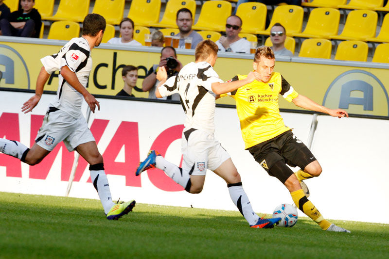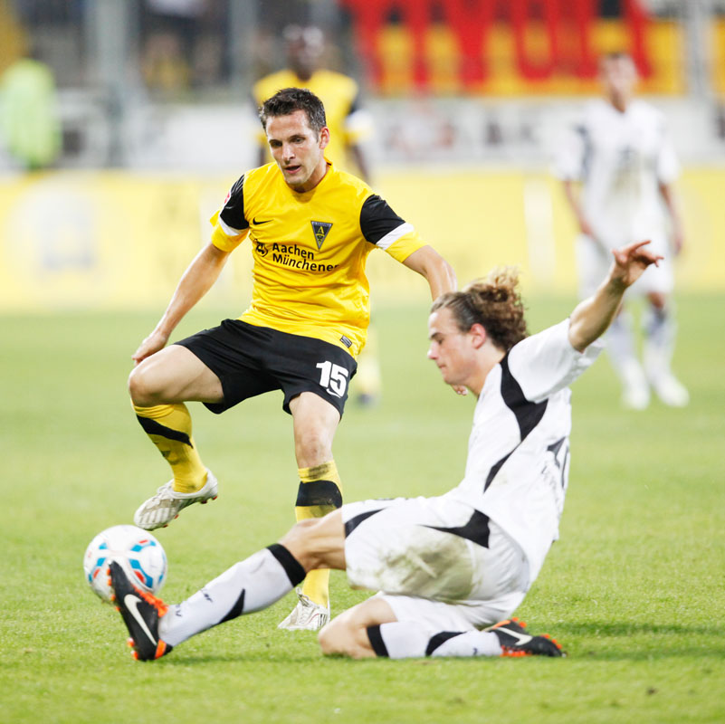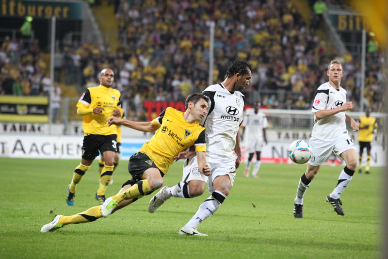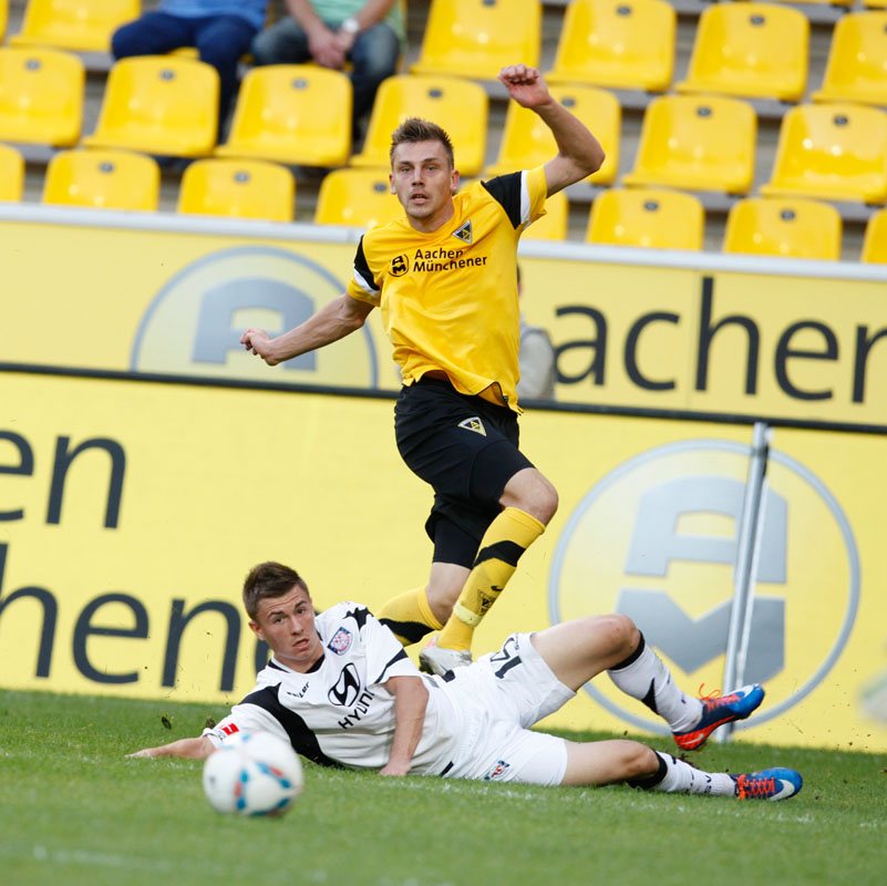 Apropos gefährlich: Wenn die Gäste den Weg in die Offensive suchten, war höchste Konzentration gefragt. Yelen versuchte sich mit einem direkten Freistoß aus gut 22 Metern, doch das Leder verfehlte das Ziel um ein gutes Stück (14.). Beide Teams hatten so ihre Mühe, zu klaren Gelegenheiten zu kommen, bis am Tivoli die 32. Minute lief. Ganze 655 Minuten hatte ganz Fußball-Aachen auf diesen Moment gewartet, da erklang sie endlich: die Tormusik. Uludag brachte einen Freistoß in den gegnerischen Strafraum, wo das Leder den Kopf von Feisthammel fand. Von dort aus knallte das Leder unter die Latte und sprang knapp hinter der Torlinie auf. Der Ball zappelte zwar nicht im Netz, 1:0 stand es trotzdem.