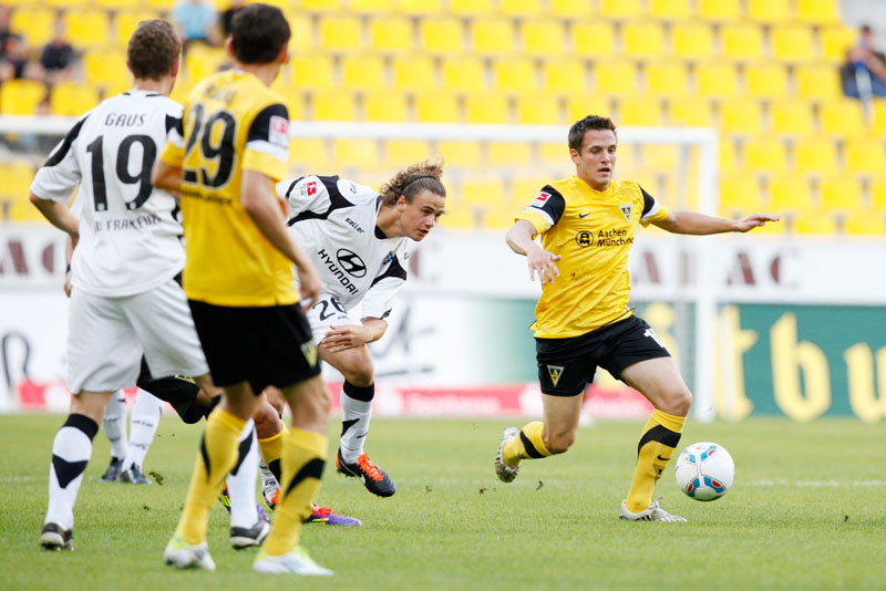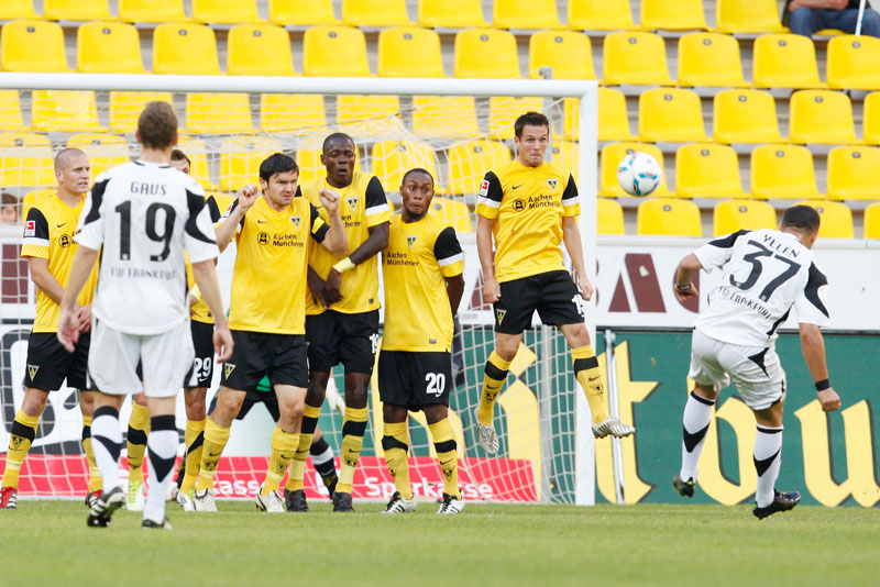 Bestes Fußballwetter am Aachener Tivoli, an dem die Gäste aus Frankfurt in den Anfangsminuten sehr defensiv begannen, tief standen und die Alemannia anrennen ließen. Die erste Chance ging dennoch auf das Konto des FSV, Chrisantus bugsierte die Kugel nach einer Hereingabe von Gaus nur knapp neben den Pfosten (7.). Es änderte nichts an der Tatsache, dass Schwarz-Gelb zunächst die spielbestimmende Mannschaft war. Olajengbesi kam nach einem indirekten Freistoß von Uludag am zweiten Pfosten einen Schritt zu spät, auch Achenbach verfehlte das Gehäuse nur knapp, als seine Flanke plötzlich zu einem gefährlichen Torschuss wurde (12.).