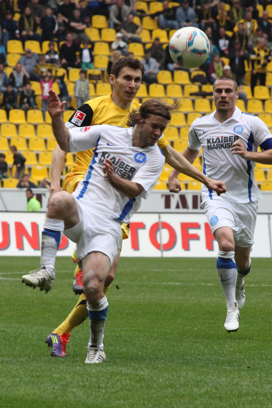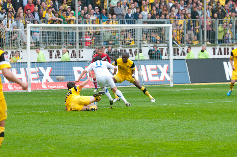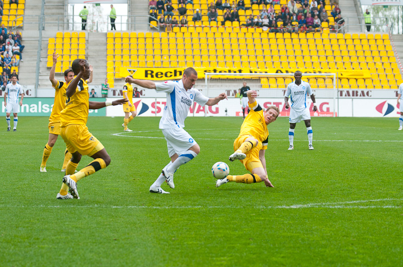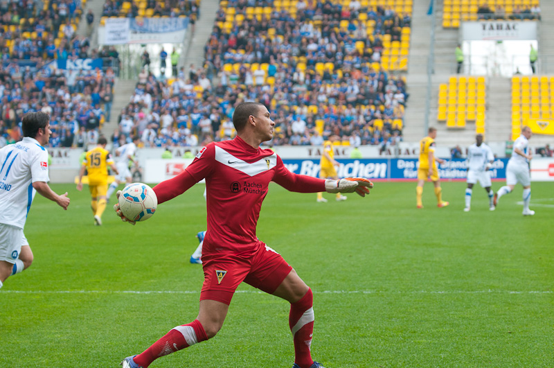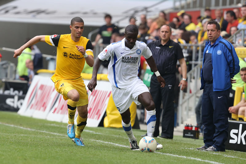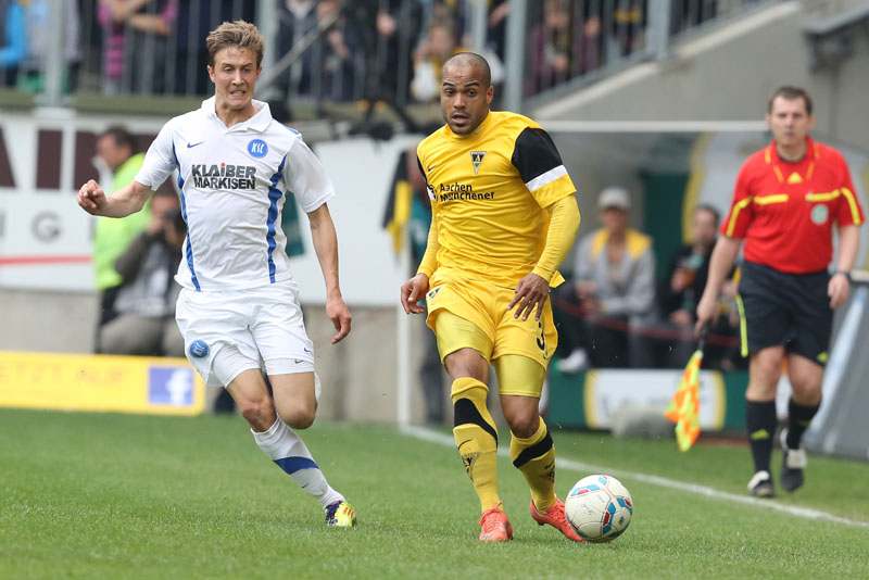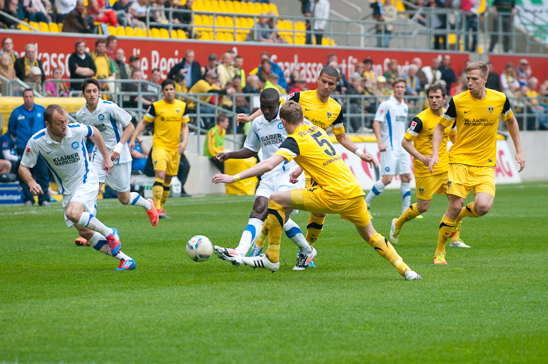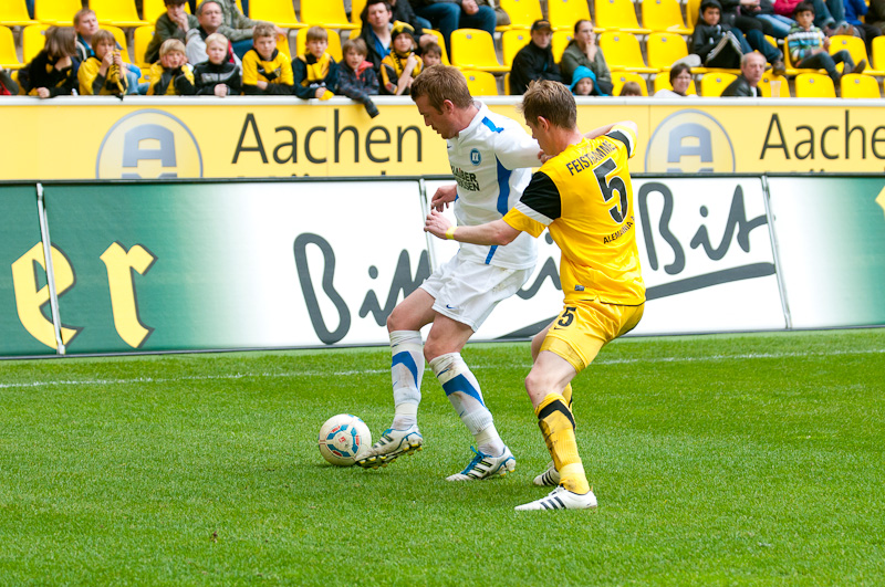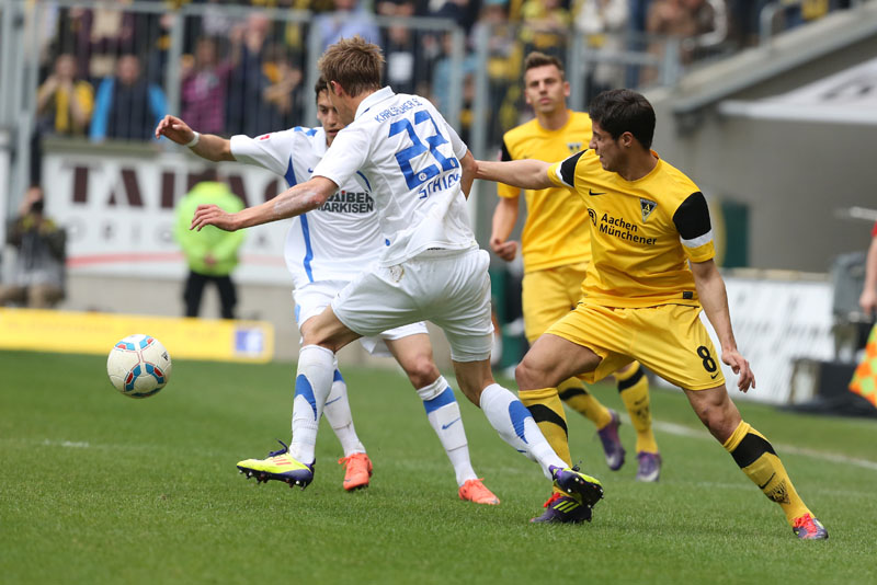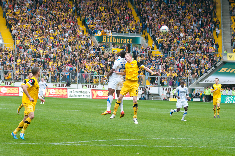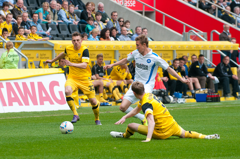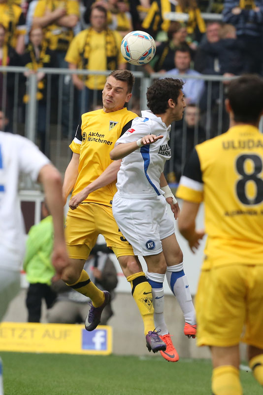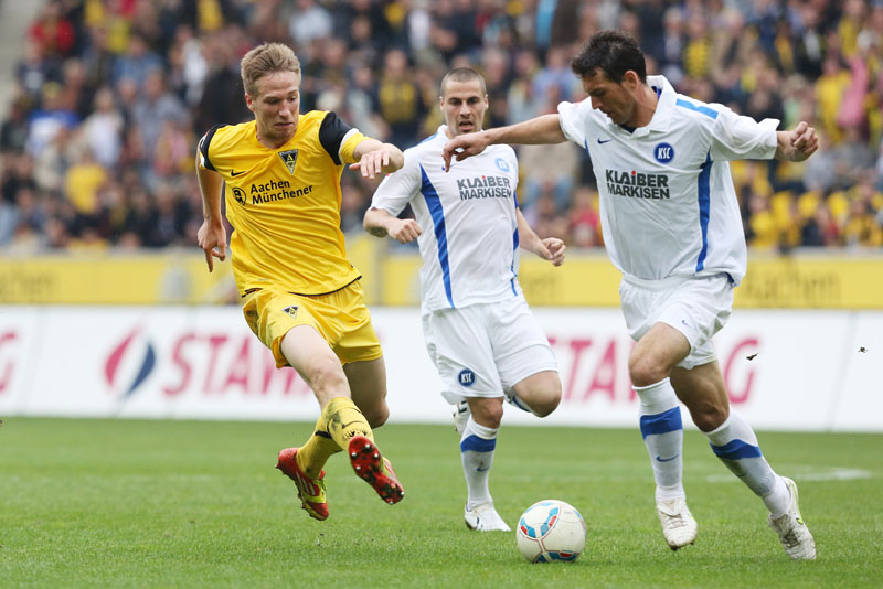Karlsruhe wollte den Ausgleich, das war zu spüren. Terrazzino war über die linke Seite vorgedrungen, an seine Hereingabe kam Feisthammel im letzten Moment noch mit der Fußspitze ran (64.). Es war keine drückende Überlegenheit der Gäste, doch die Alemannia war jetzt deutlich öfter in der Defensive beschäftigt. Gefährlich war das Team von Ralf Aussem weiterhin besonders bei Standards. Orlishausen flog bei einer Kratz-Ecke am Ball vorbei, Feisthammel war am zweiten Pfosten etwas überrascht und verfehlte das Leder freistehend (71.).