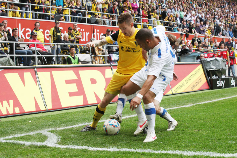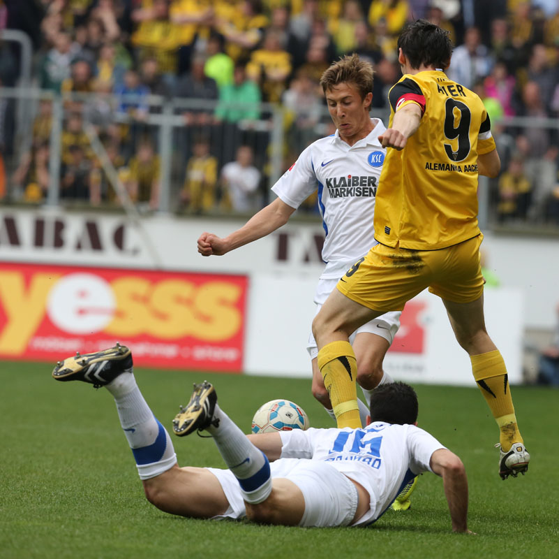 Die Chance auf den Relegationsplatz ist weiterhin da. Durch einen knappen, aber verdienten 1:0-Heimsieg gegen den Karlsruher SC hat sich die Alemannia die Möglichkeit, auf Platz 16 zu springen, bewahrt. In einem kampfbetonten Spiel strahlte die Alemannia vor dem gegnerischen Gehäuse über die gesamten 90 Minuten mehr Torgefahr aus als die Gäste. Besonders bei Standards waren die Schwarz-Gelben stets brandgefährlich. Aimen Demai gelang in der 20. Minute nach einer Ecke von Kratz per Kopf der Treffer des Tages, wodurch es für das Team von Ralf Aussem in der kommenden Woche in München ein echtes Endspiel geben wird.