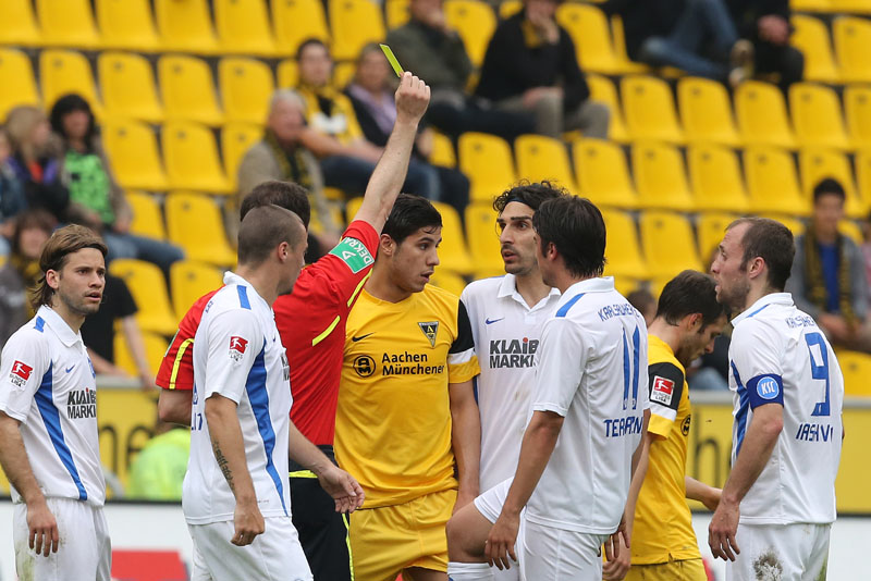 Man spürte es auf den Rängen: Hier ging es um den Klassenkampf. Harte Zweikämpfe gab es im Minutentakt, Schiedsrichter Sippel hatte einiges zu tun. Mit der Führung im Rücken agierte die Alemannia kurz vor der Pause etwas defensiver und ließ den KSC anrennen. Torchancen hatten aber weiterhin die Jungs vom Tivoli. Stiepermann erkämpfte sich die Kugel bärenstark, schickte Uludag, der nach innen zog und Orlishausen zu einer Parade zwang (41.). Es war Uludags letzte Aktion. Der junge Flügelspieler war mit Gelb vorbelastet und stand kurz vor einem Platzverweis. Aussem zog die Notbremse und brachte für ihn noch vor dem Halbzeitpfiff Sascha Marquet ins Spiel. Kurz darauf war Schluss, mit der verdienten Führung ging es in die Pause.