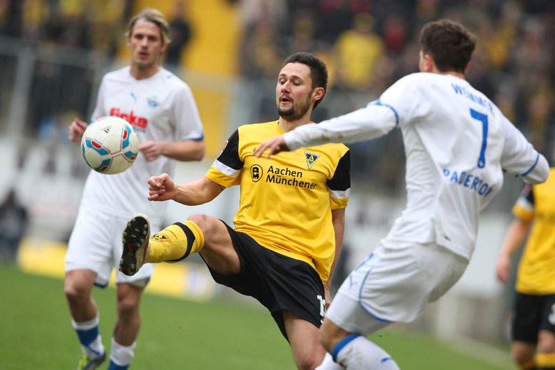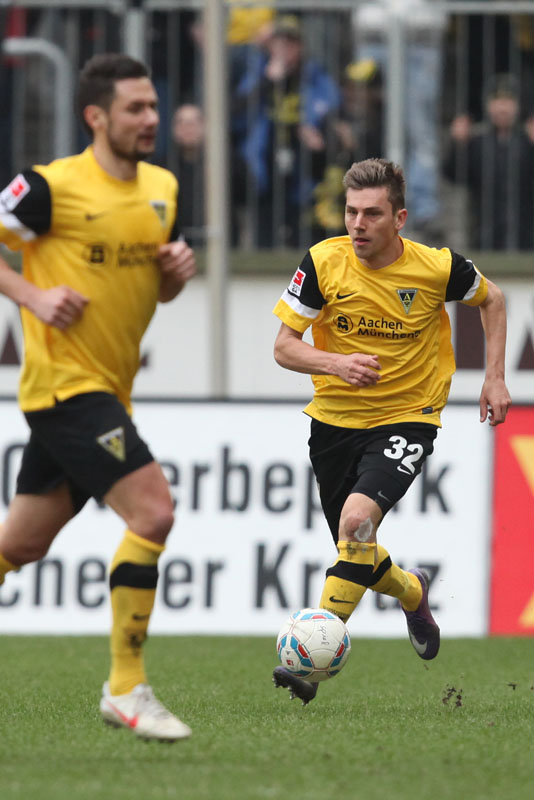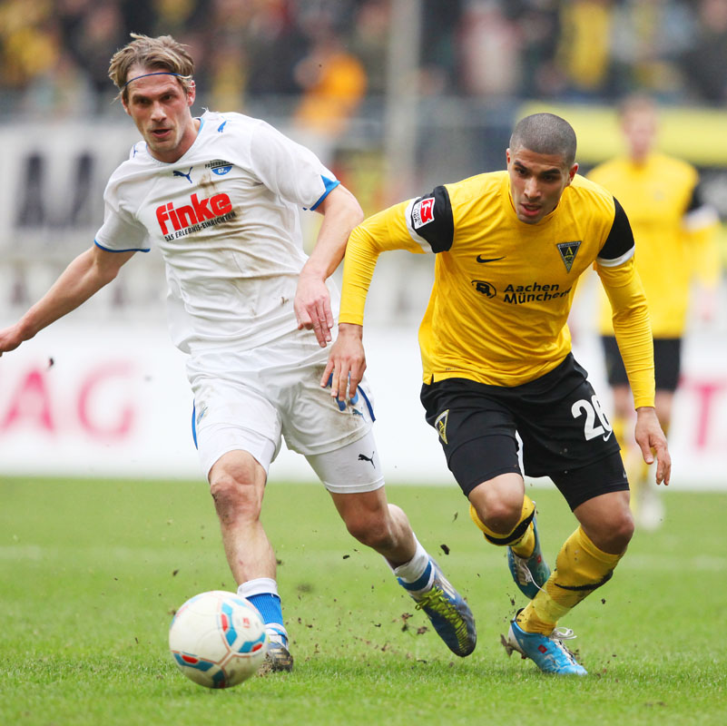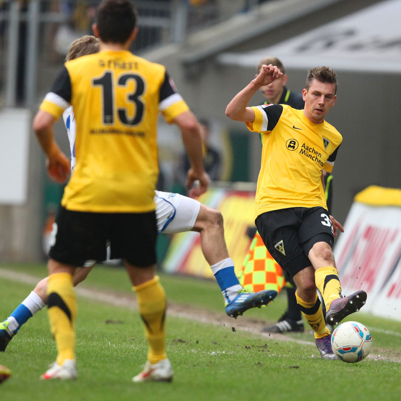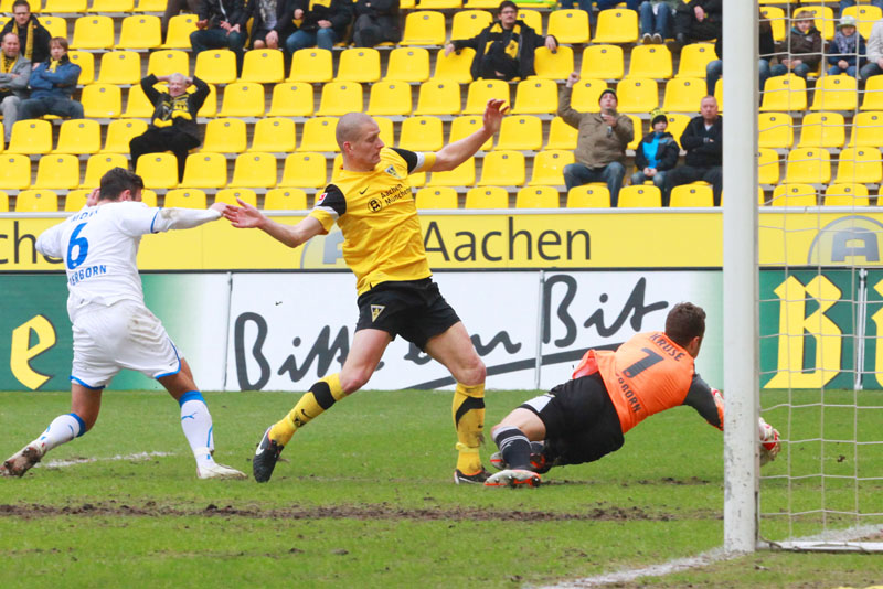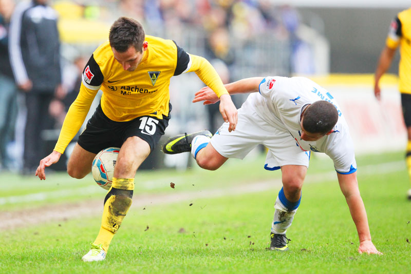 Es war die letzte Aktion des Angreifers, der nach einem Zusammenstoß mit Olajengbesi mit Verdacht auf Jochbeinbruch das Feld räumen musste und durch Matthew Taylor ersetzt wurde. Die Gäste störte das allerdings kaum. Sie machten es der Alemannia mit ihrem kompakten Auftreten schwer und erzeugten immer wieder großen Druck auf Aachens Hintermannschaft. Torchancen waren allerdings plötzlich Mangelware, sowohl auf der einen als auch auf der anderen Seite. Der Alemannia fehlte es insgesamt an Durchschlagskraft in der Offensive, beide Teams trugen ihren Teil dazu bei, dass die Partie überwiegend im Mittelfeld stattfand. Es war fast schon die logische Konsequenz, dass es torlos in die Pause ging.