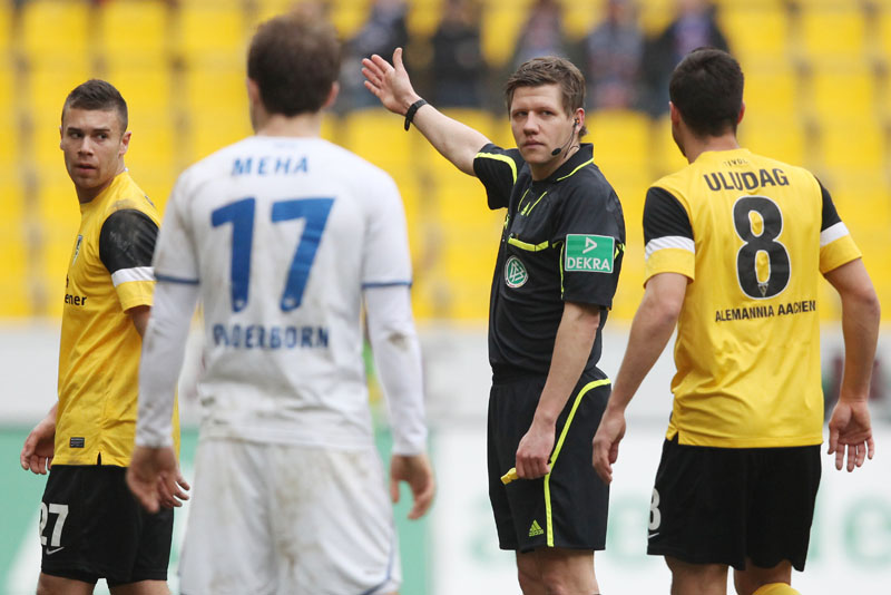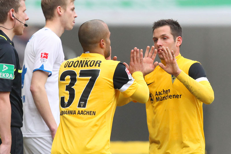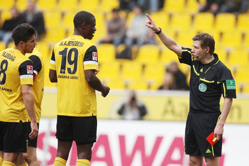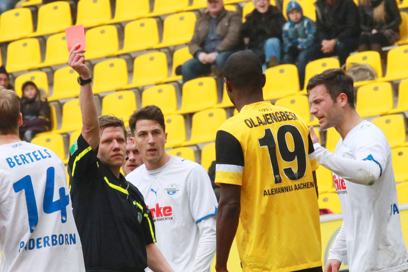 Es war schon so etwas wie eine Vorentscheidung in einer Begegnung, in der der Alemannia besonders im Spiel nach vorne enttäuschte. Es fehlte der Mut, aber besonders die Kreativität, so dass sich die Funkel-Elf kaum Torchancen erspielte. Zu allem Überfluss sah Streit in der 74. Minute auch noch die Ampelkarte, weil der mit Gelb vorbelastete Flügelspieler sich wegen eines Ballverlustes zu sehr ärgerte. Der Schiedsrichter deutete Streits Ärger als Reaktion auf seinen Pfiff und zückte Gelb-Rot – eine überzogene Entscheidung. Doch es kam noch schlimmer: Weil Olajengbesi bei einem Freistoß der Alemannia seinem Gegenspieler anscheinend auf den Fuß gestiegen war, zückte der Unparteiische glatt Rot, was ebenso unverständlich erschien (79.).