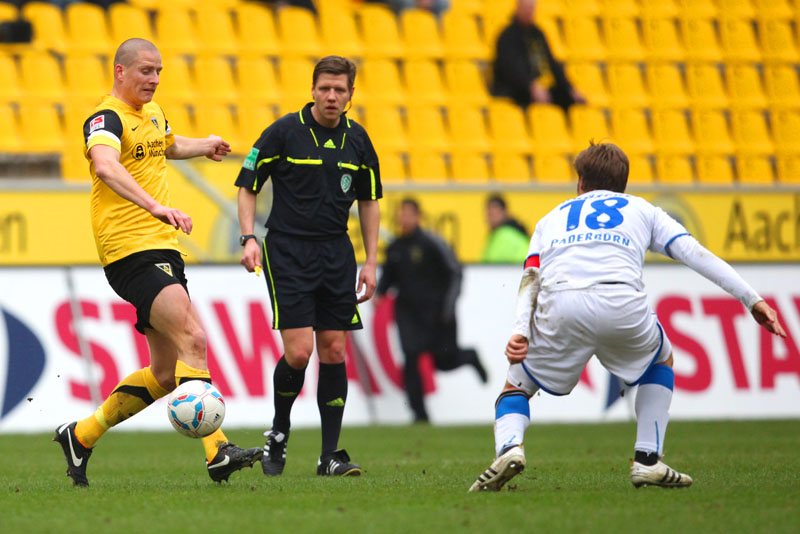 Die 15.071 Zuschauer am Tivoli sahen einen munteren Beginn der Alemannia. Die Schwarz-Gelben begannen deutlich offensiver als beim Auswärtsauftritt in Düsseldorf. Radus Hereingabe verfehlte der gut positionierte Streit nur knapp (2.), Auer köpfte das Spielgerät nach einer Ecke einen Meter über den Kasten (4.). Doch auch die Gäste spielten mutig nach vorne: Mehas Freistoß aus 18 Metern senkte sich auf die Latte (6.), Paderborns Torjäger Nick Proschwitz hatte kurz darauf eine Doppelchance. Erst musste Waterman bei seinem Distanzschuss zur Seite klären, kurz darauf sah er, wie Proschwitz‘ Kopfball knapp rechts am Pfosten vorbeiging (9.).