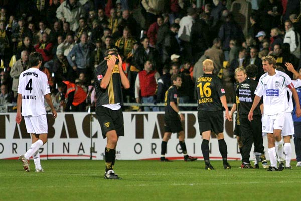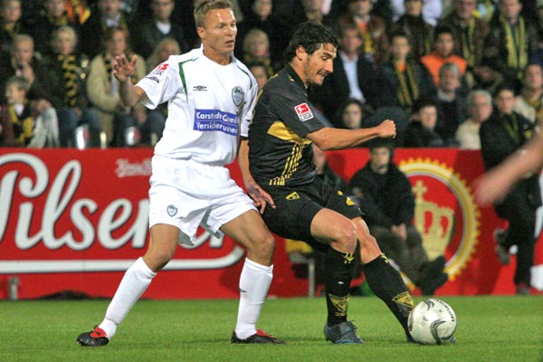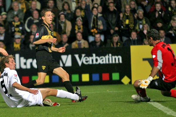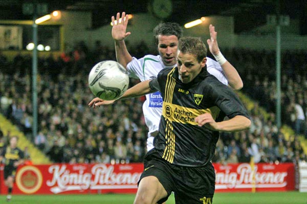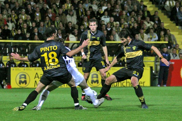 Auch in Überzahl fand Alemannia aber nicht die spielerischen Mittel, um die jetzt mit Mann und Maus verteidigenden Gäste in die Enge zu treiben. Erik Meijer putschte sich und das Publikum kurz vor Schluss noch einmal auf, um alles zu versuchen. Und in der Tat kam die Chance auf den Ausgleich noch. Sechs Meter vor dem Tor fiel eben Meijer das Leder vor die Füße. Der Kapitän drosch den Ball mit einem fulminanten Dropkick auf den Kasten. Bei jeder anderen Mannschaft hätte das wohl zum Ausgleich gereicht, Borut Mavric jedoch packte einen Reflex Marke Weltklasse aus und rettete seinen Kollegen die Siegprämie.
