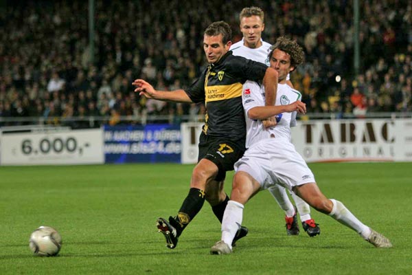 Die Fürther standen tief, ließen die Alemannia kommen. Der Führungstreffer war das gefundene Fressen für die Greuther, um fortan noch mehr auf Konter über die schnellen Hilbert und Timm zu spielen. Wiederum nach einem Freistoß von Pinto hatte Aachen die größte Chance der ersten Halbzeit. Sascha Rösler versuchte den Ball im Fallen zu kontrollieren, ein Abwehrbein war jedoch dazwischen (37.).