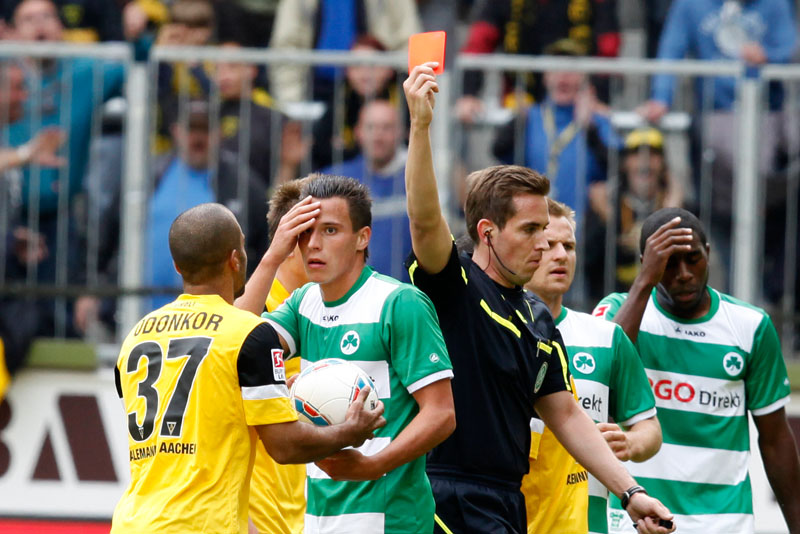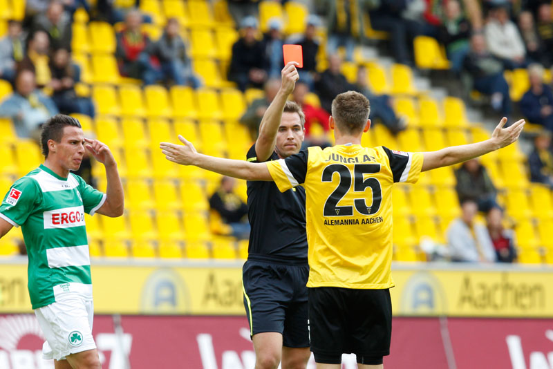 In der 23. Minute dann ein riesen Aufschrei am Tivoli. Schiedsrichter Tobias Stieler zückte plötzlich nach einem harten Einsteigen von Junglas gegen Fürstner den roten Karton – eine sehr harte Entscheidung, da Stieler bis dato nahezu alles durchlaufen ließ. Die Stimmung war nun aufgeheizt. Unter einem gellenden Pfeifkonzert startete Fürth die ersten zaghaften Angriffsversuche, doch die Überzahlsituation der Gäste hielt nicht lange. Nur vier Minuten später holte Edgar Prib Radu unsanft von den Beinen. Da Stieler ein wenig den Überblick verloren hatte, gab es auch hier die Rote Karte (27.).