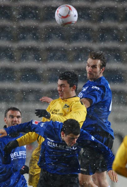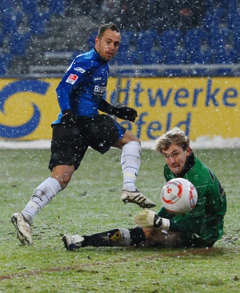 Die erste positive Meldung gab es bereits einige Stunden vor dem Anpfiff: Dank zahlreicher fleißiger Helfer konnte der Platz in der Schüco Arena von der Schneedecke befreit werden, so dass die Platzkommission dem Anpfiff zustimmte. Das Geläuf war durch den Frost allerdings äußerst holprig, gepflegtes Kombinationsspiel war daher nur beschränkt möglich. Der Alemannia gelang es jedoch zunächst, die schwierigen Umstände hervorragend anzunehmen. Babacar Gueye erhielt auf links ein Zuspiel von Achenbach, bediente Arslan im Rücken der Abwehr, dessen Schuss Bielefelds Schlussmann Fernandez vor die Füße von Auer abprallen ließ. Aachens Kapitän bedankte sich und erzielte die frühe Führung zum 0:1 (4.).