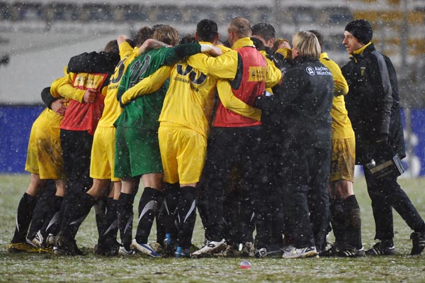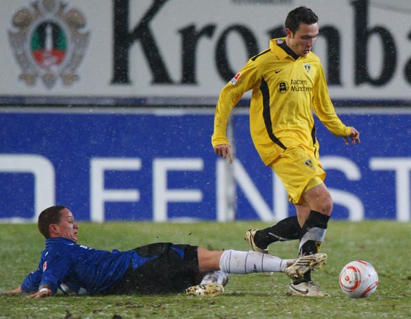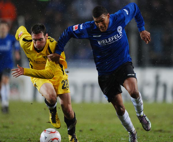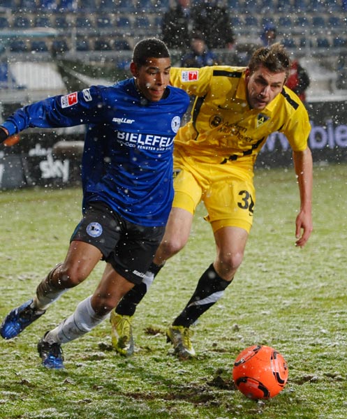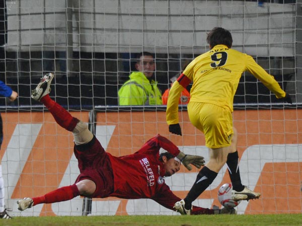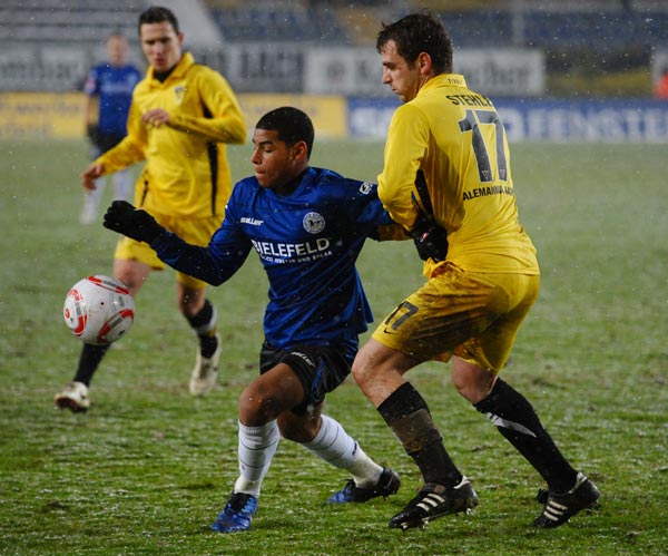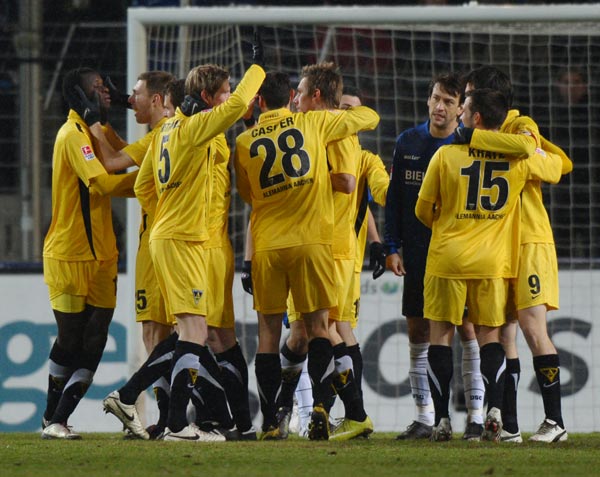 Mit einem 3:1-Auswärtssieg bei Tabellenschlusslicht Arminia Bielefeld hat die Alemannia am Freitagabend die Hinrunde erfolgreich beendet. Trotz der frühen Führung von Benny Auer (4.) kamen die Schwarz-Gelben allerdings auf äußerst schlechten Platzverhältnissen nie richtig ins Spiel. Nach einem blitzartig vorgetragenen Konter erzielten die Ostwestfalen in der 52. Minute durch Sebastian Heidinger den Ausgleich. Bis zur 85. Minute passierte nahezu nichts mehr auf beiden Seiten, bis Tolgay Arslan ungestört aus knapp 16 Metern die späte Führung zum 2:1 gelang (86.). In den letzten Sekunden zeigte sich die Alemannia gemäß dem Wetter eiskalt – Benny Auer verwertete einen Konterangriff per Kopf zum 3:1-Endstand aus Sicht der Schwarz-Gelben.