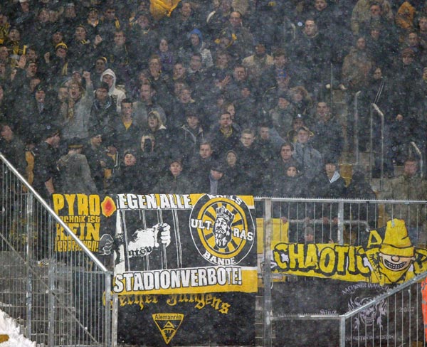 Erlaubt sind den Alemannia-Fans in der SchücoArena Zaunfahnen, kleine Schwenkfahnen bis 1,50m, Trommeln und 1 Megafon. Nicht erlaubt sind Doppelhalter und große Schwenkfahnen.