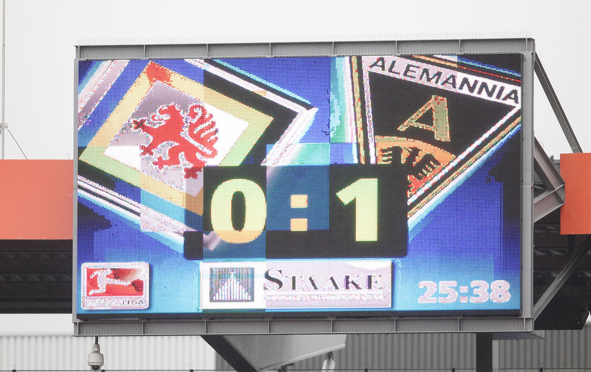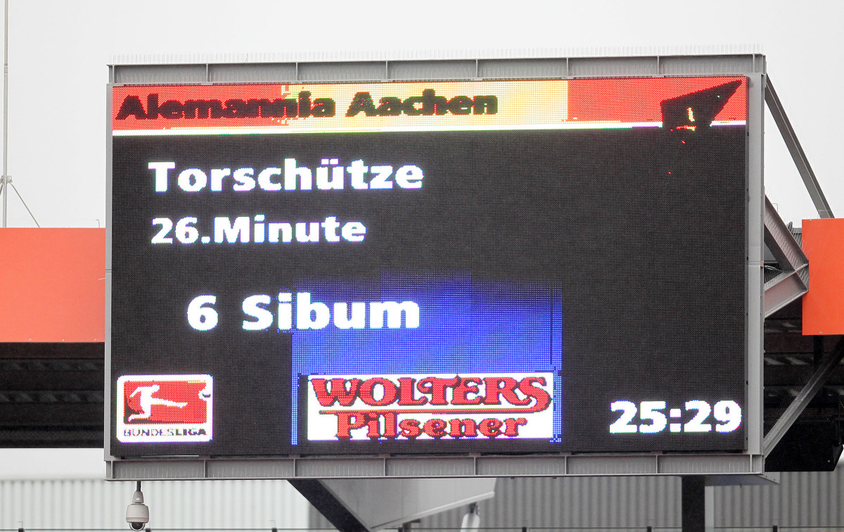 Es passierte lange Zeit nichts in einer Partie mit eher mäßigem Unterhaltswert. Die Alemannia stand gegen den gut sortierten Aufsteiger zwar etwas tiefer als zuletzt, doch die erste Torchance nutzte das Team von Friedhelm Funkel gleich zur Führung: Nach einem Foul an Yabo legte sich Achenbach auf der rechten Seite den Ball zum indirekten Freistoß zurecht, seine Hereingabe fand am Fünfmeterraum den Kopf von Sibum, der zum 1:0 vollstreckte (26.).
