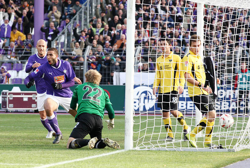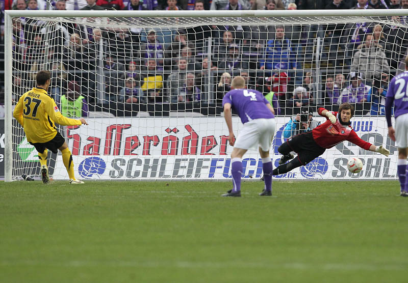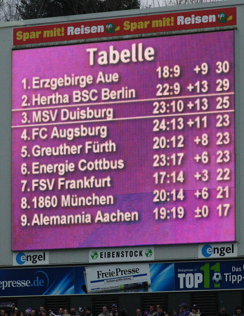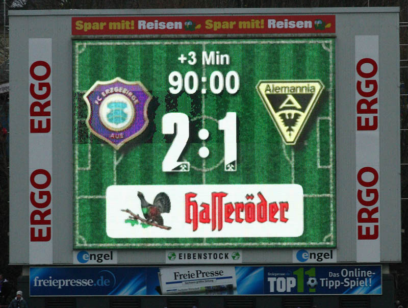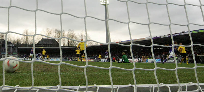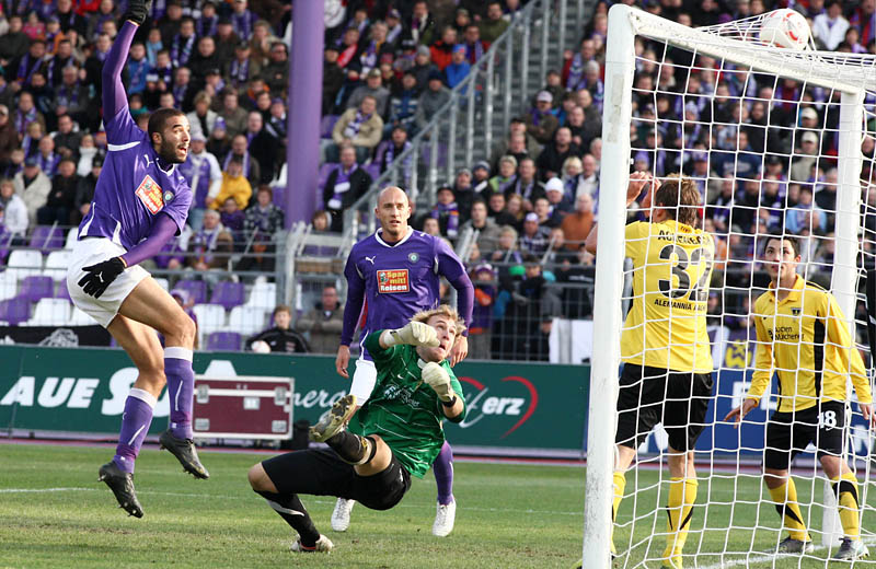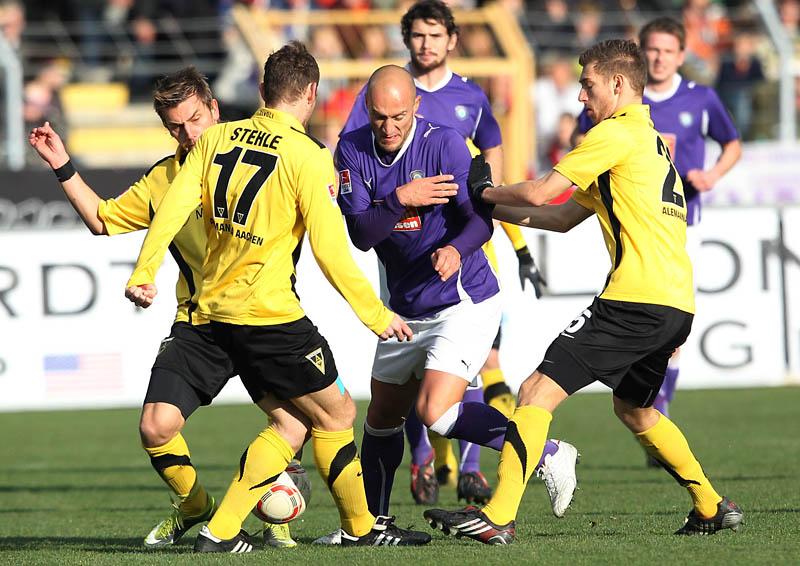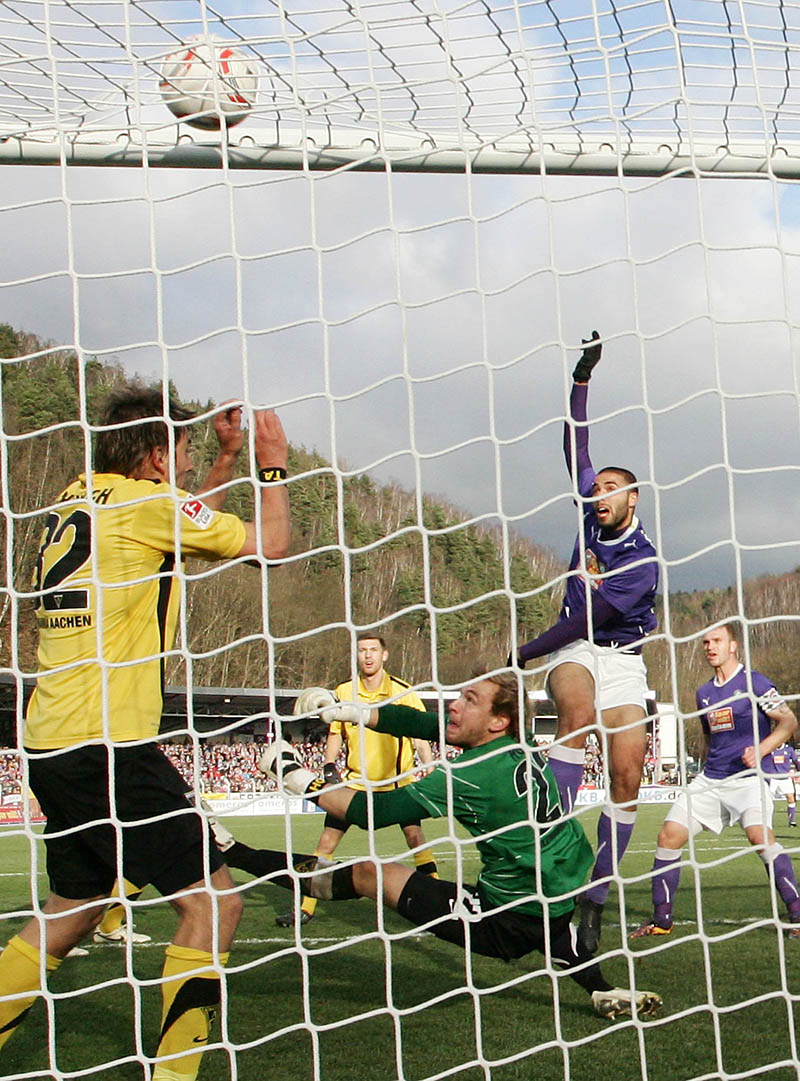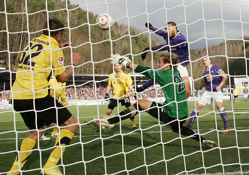 Auch der Alemannia gelang es am 13. Spieltag nicht, den Überflieger Erzgebirge Aue zu stoppen – die Schwarz-Gelben hatten gegen den neuen Tabellenführer der Zweiten Liga am Ende verdient mit 1:2 das Nachsehen. Ohne eine ernsthafte Torchance gingen die Jungs vom Tivoli mit einem 0:1-Rückstand in die Pause – Lachheb gelang nach 24 Minuten die Führung für die Erzgebirgler. Zum zweiten Durchgang stellte Coach Peter Hyballa auf ein 4-3-3-System um, was sich auszahlte. Die Schwarz-Gelben hatten mehr vom Spiel, doch ein Konter reichte dem Gastgeber, die Führung auszubauen – Hochscheidt erhöhte nach einer Stunde auf 2:0 (61.). Zwar gelang Höger in der 67. Minute per Strafstoß der 1:2-Anschlusstreffer, doch es reichte am Ende nicht mehr für den Punktgewinn.
